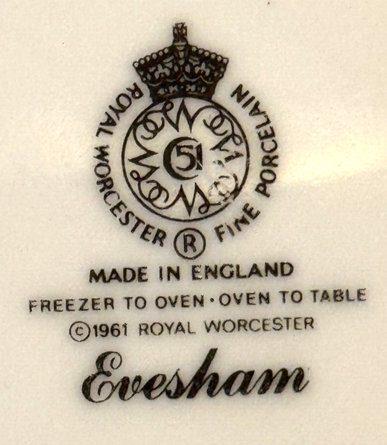 This item for sale is for FOUR 6.5 inch bread, appetizer, or dessert plates by Royal Worcester in the classic 1961 Evesham pattern. They are in excelelnt gently used condition. Please enjoy 4 pounds free insured shipping to your USA address Please check out our other items, we probably have what you need