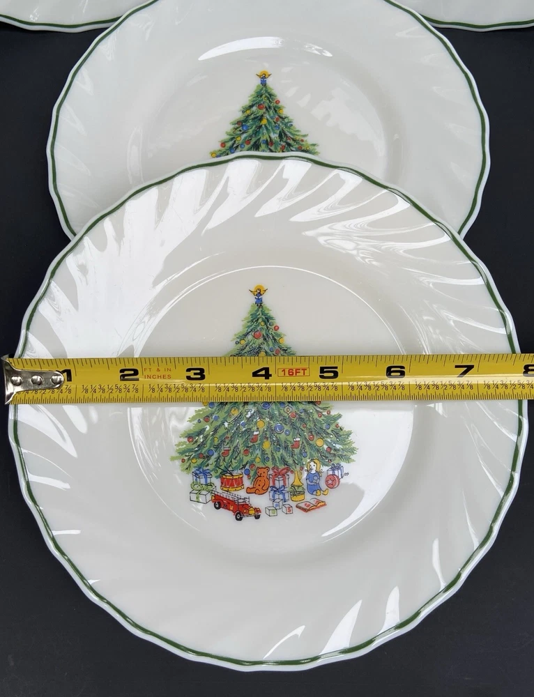Vintage: Yes Origin: France Production Technique: Fused Glass Type: Salad Plate Backstamp: Printed Country/Region of Manufacture: France Set Includes: Salad Plate Plate Diameter: 7-3/4 inches wide Shape: Round Features: Decorative, Stackable Material: Glass Color: Multicolor Occasion: Christmas Production Style: Pressed Glass Brand: Salem Style: Retro Number of Items in Set: Four-Piece Pattern: Christmas Tree