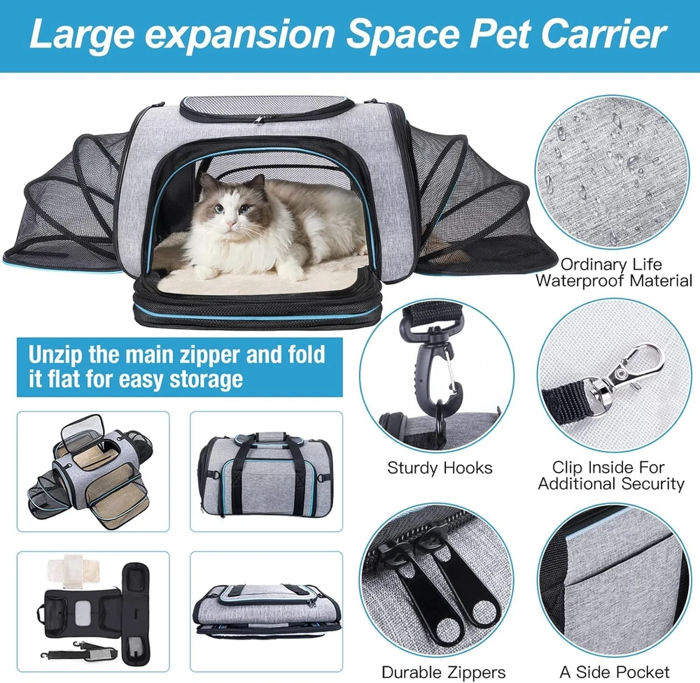 AIRLINE APPROVED CAT CARRIER: Before purchasing the pet carrier, please ensure that your pet's size is suitable for the carrier. We recommend that your pet's dimensions fall within 15''x9''x9''(smaller than product) , with a weight not exceeding 15 pounds. Please be aware that selecting based solely on weight may be inaccurate, so when making a purchase, refer to your pet's length and height. This ensures that your furry friend can comfortably enjoy wearing our carrier. Our goal is to provide the best travel experience for your pet, and choosing the right size is crucial to achieving this goal UNIQUE 4-WAYS EXPANSION: Easy to fold down and unzip four sides to create extra room of our spacious pet bag for your cats or dogs to stay comfortable. Allows your pet to move around more comfortably and reduces the anxiety of confinement. EASY CARRIER AND EASY CLEAN: Wear this airline approved pet carrier over the shoulder, secure it in the car with seatbelt, place atop your luggage or carry it with the top handle. Versatile for your cars or all types of travel,and the cozy fleece pet bed can be completely removed and machine-washed. MULTIPLE ENTRY WITH MAXIMUM AIR CIRCULATION : This soft-sided cat carrier comes with mesh windows giving plenty of openings and air for cat dog with top opening. With zippers on both top and side, your lovely puppy can be put in and out of our dog carrier easily. NOTE:Pull the zipper slowly for the first installation after receiving the goods, which will help the product to be used for a long time. SIZE: If Your Pet Size is Similar to The Pet Carrier, We Recommend You Choose The X-Large One(20*11.4*12.4)