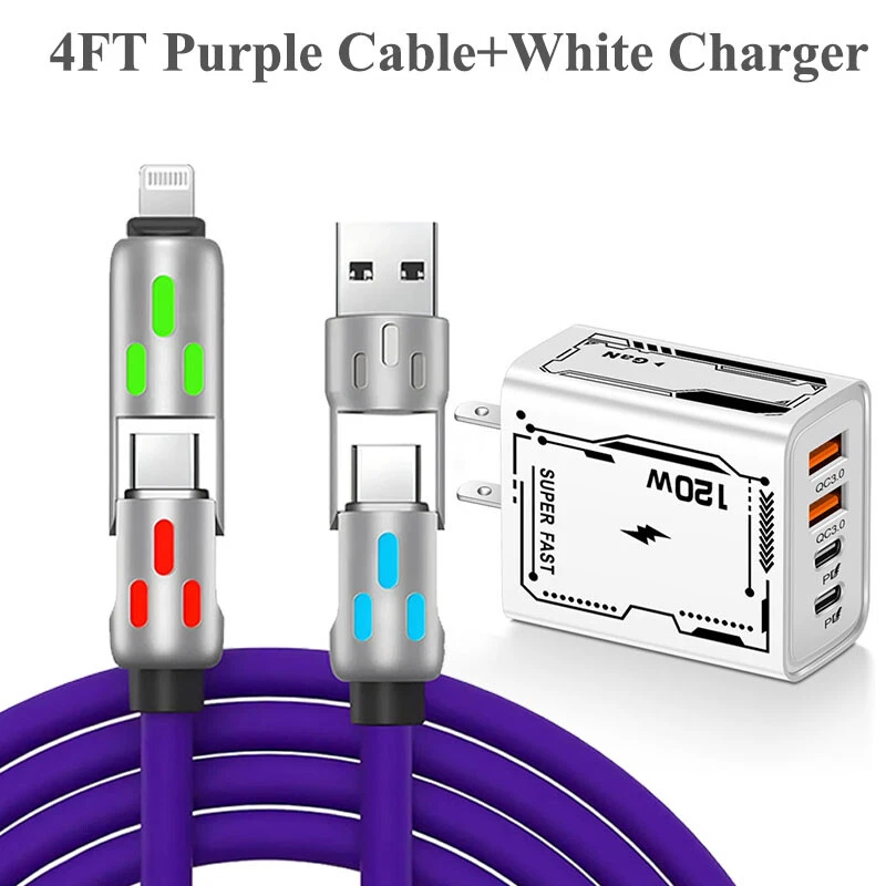 Description: Colorful breathing light fast charging cable 240W fast charging fully Universal with everything High power to low power 240/140100/60/30W device data cables are fully compatible Four modes, four options Four interfaces can be combined at will, multi-protocol full device support can be switched between mobile phones, tablets and other devices 240W fast charging PD full series compatible Support iPhone7-iPhone15 Samsung and other mobile phones compatible Colorful atmosphere lights make charging at night more convenient With soft colorful atmosphere lights, you can find your phone clearly when charging at night Zinc alloy material anti-oxidation process Free plug and unplug,as good as new, full of texture Free bending and long-term use without breaking After 20000+ bending test, wear-resistant and non-breaking, with longer service life Bold gold-plated copper wire charges faster and more stably The conduction area is increased, the resistance is reduced, and the charging and transmission speed is more stable and faster Product name: 4-in-1 liquid silicone data cable Interface: Type-C/USB-A/8pin Function: charging + data transmission Material: zinc alloy + liquid silicone Transmission speed: 480Mbp/s Current: 2.4A/5A Length: 1.2m Color: pearl nickel shell + purple line Applicable models: For Apple/Android/Type-C interface devices include: 1pcs 1.2 4in1 240w liquid silicone data cable