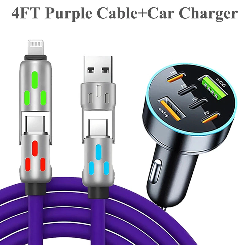 Description: Colorful breathing light fast charging cable 240W fast charging fully Universal with everything High power to low power 240/140100/60/30W device data cables are fully compatible Four modes, four options Four interfaces can be combined at will, multi-protocol full device support can be switched between mobile phones, tablets and other devices 240W fast charging PD full series compatible Support iPhone7-iPhone15 Samsung and other mobile phones compatible Colorful atmosphere lights make charging at night more convenient With soft colorful atmosphere lights, you can find your phone clearly when charging at night Zinc alloy material anti-oxidation process Free plug and unplug,as good as new, full of texture Free bending and long-term use without breaking After 20000+ bending test, wear-resistant and non-breaking, with longer service life Bold gold-plated copper wire charges faster and more stably The conduction area is increased, the resistance is reduced, and the charging and transmission speed is more stable and faster Product name: 4-in-1 liquid silicone data cable Interface: Type-C/USB-A/8pin Function: charging + data transmission Material: zinc alloy + liquid silicone Transmission speed: 480Mbp/s Current: 2.4A/5A Length: 1.2m Color: pearl nickel shell + purple line Applicable models: For Apple/Android/Type-C interface devices include: 1pcs 1.2 4in1 240w liquid silicone data cable