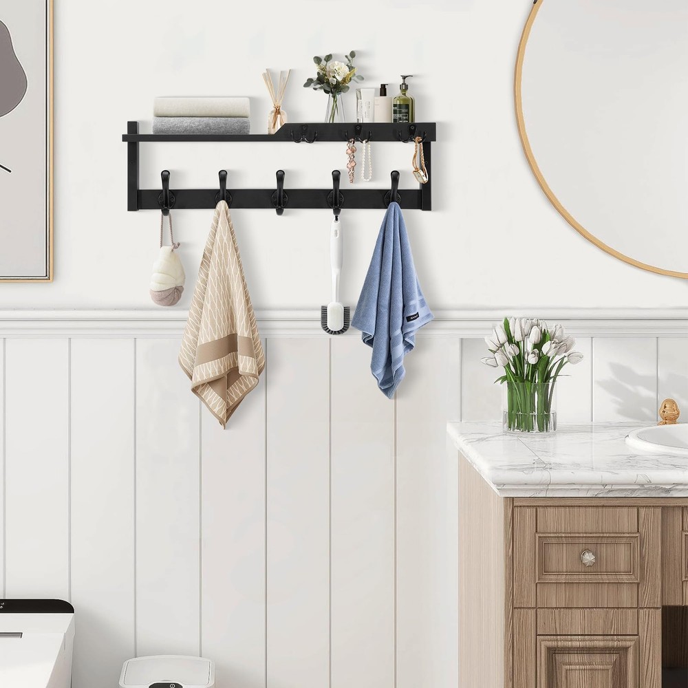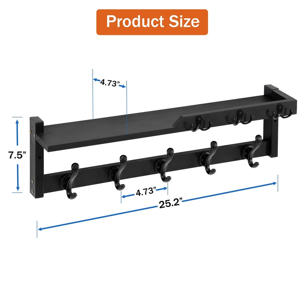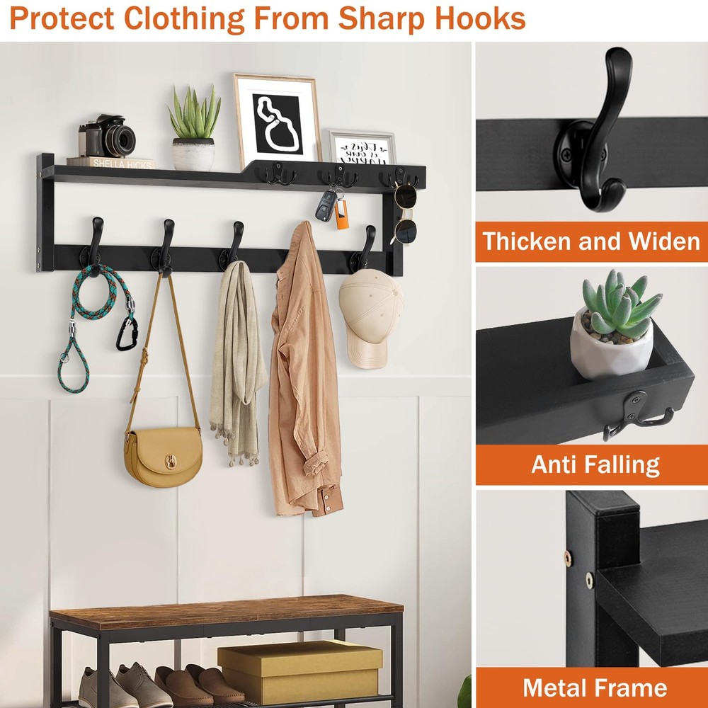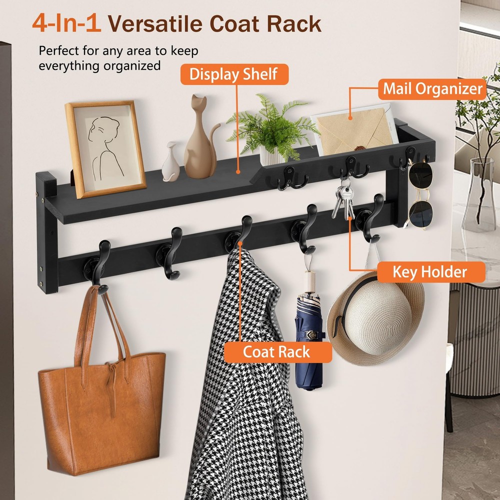 It is not only a coat rack, but also a key holder and mail organizer, and it is also a storage and display wall shelf; You no longer have to worry about forgetting things when you go out, because this coat rack can meet all your needs when you go out. PRACTICAL AND STYLISH: The appearance design of this wall-mounted coat rack is both fashionable and practical, and has applied for an appearance patent; It makes full use of the wall space at the entrance, can be matched with various decoration styles, adding an elegant touch to your space 4-IN-1 FUNCTION: It is not only a coat rack, but also a key holder and mail organizer, and it is also a storage and display wall shelf; You no longer have to worry about forgetting things when you go out, because this coat rack can meet all your needs when you go out UPGRADE AND IMPROVE: The upgraded coat hooks are thicker and stronger, combining durability and beauty, and can protect clothes from sharp hooks; Unique upper shelf design - Adding a baffle not only prevents items from sliding, but also makes it more aesthetically pleasing EASY TO INSTALL: The needed hardware(screws and anchors)are included; There are pre-drilled holes on the shelf and the hooks; You can refer to the instruction manual inside the packaging for installation STURDY AND WEAR: The frame is made of sturdy metal, and the shelf is made of carefully selected natural solid wood to ensure strong load-bearing capacity and long-lasting durability; Each hook can hang items lighter than 20 pounds; The fine craftsmanship and smooth surface treatment make it visually appealing