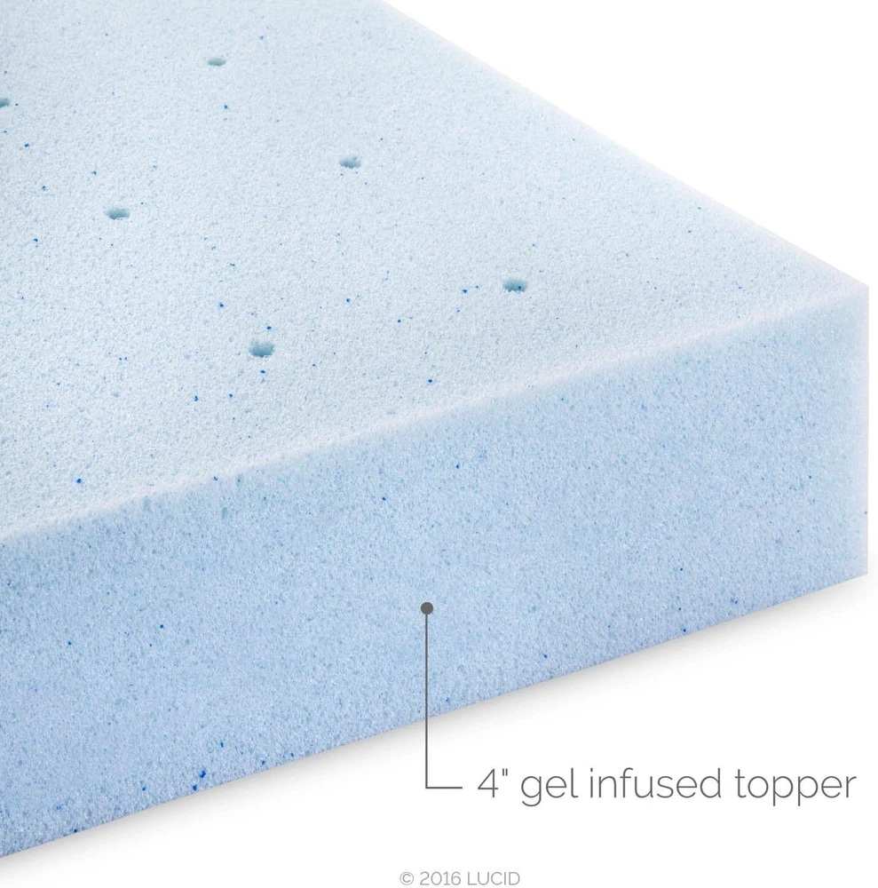 You may also like Mattress Topper 2 Inch Gel Infused Memory Foam Plush Feel Cooling Queen Size 59.84 USD 62.99 USD Free shipping 5% off 2 Inch Gel Infused Memory Foam Mattress Topper Plush Feel Cooling King Size Dorm 79.79 USD 83.99 USD Free shipping 5% off 3 Inch Lavender Infused Memory Foam Mattress Topper Ventilated Design Twin Size 44.88 USD 47.24 USD Free shipping 5% off 2 Inch Gel Infused Memory Foam Mattress Topper Plush Feel Cooling Twin Size 44.88 USD 47.24 USD Free shipping 5% off 4 Inch Gel Memory Foam Mattress Topper, Ventilated Design, Ultra Plush, CertiPUR-US Certified, Twin XL, Blue Color Blue Size Twin XL Fabric Type Memory Foam Special Feature Gel Memory Foam About this item Memory Foam PLUSH MEMORY FOAM FEEL: Add 4 inches of thick, plush gel memory foam to your bed to create a soft and conforming feel that cradles your body while you sleep COOLING GEL INFUSION: Contouring memory foam is infused with gel material that captures and dissipates heat for a cooler memory foam experience DESIGNED FOR BREATHABILITY: This thick topper provides maximum comfort and softness without sacrificing breathability. A ventilated design improves airflow so you can sleep cool and comfortable ELEVATED PRESSURE POINT RELIEF: Upgrade your old mattress with this memory foam topper that distributes weight evenly and conforms to your curves for targeted pressure point relief SHIPS IN A BOX: Rolled and shipped in a box, this topper meets the highest safety standards; just open it and give it 24-48 hours to decompress and shed the new foam scent;