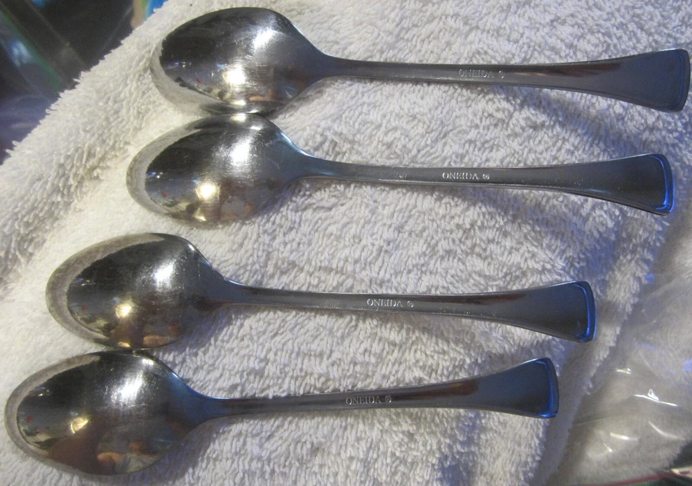 MPN:naDepartment:AdultMaterial:Stainless SteelCountry/Region of Manufacture:UnknownSet Includes:SpoonCharacter:naStyle:Mid-Century ModernType:SpoonHandle Material:Stainless SteelUPC:does not applyOriginal/Licensed Reproduction:OriginalTime Period Manufactured:1970-1979Seller Notes:“Good used shape,you get the 4 shown. see pics for condition.”gtin13:does not applyBrand:ONEIDAColor:Silver