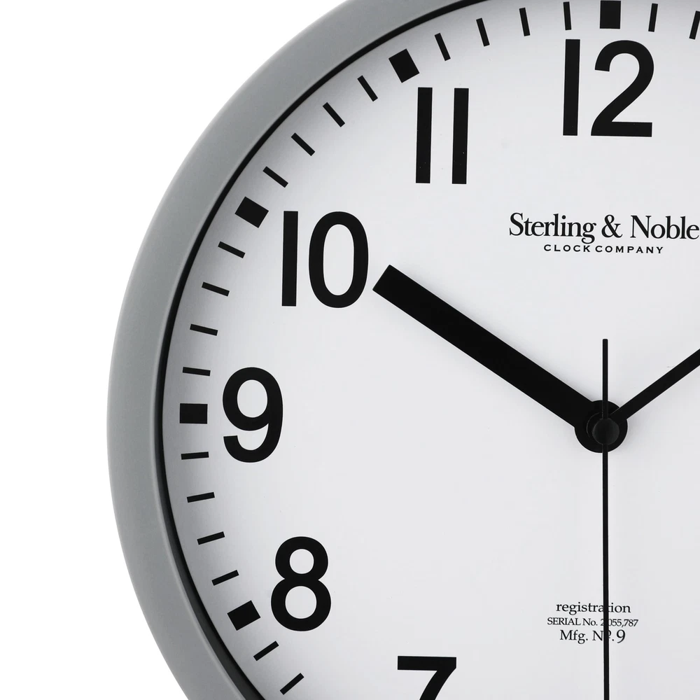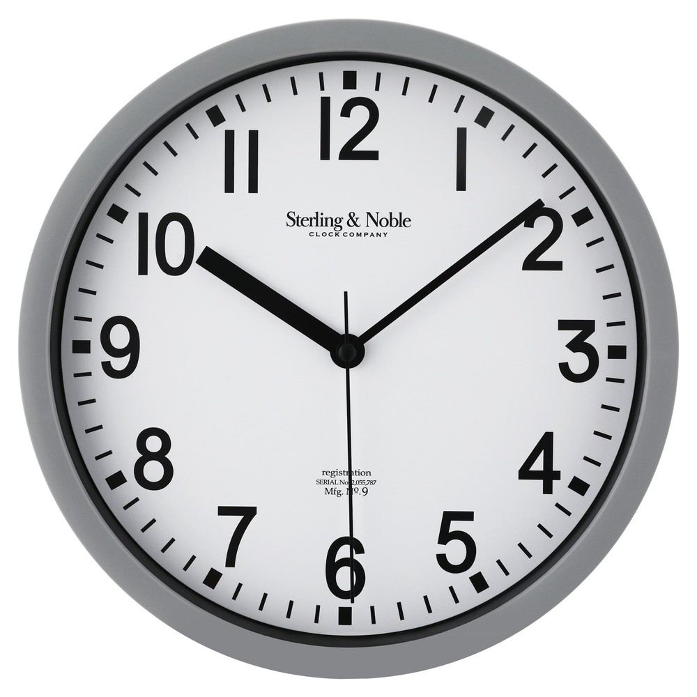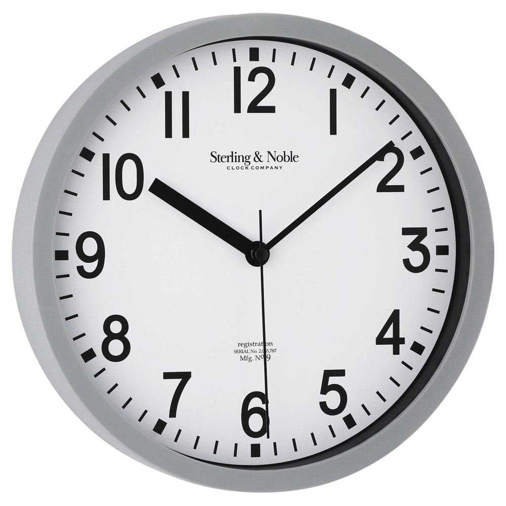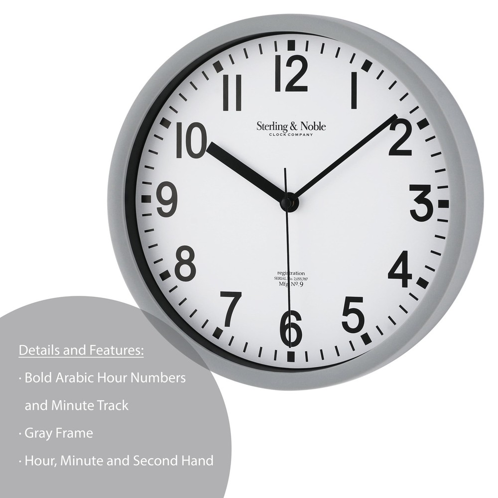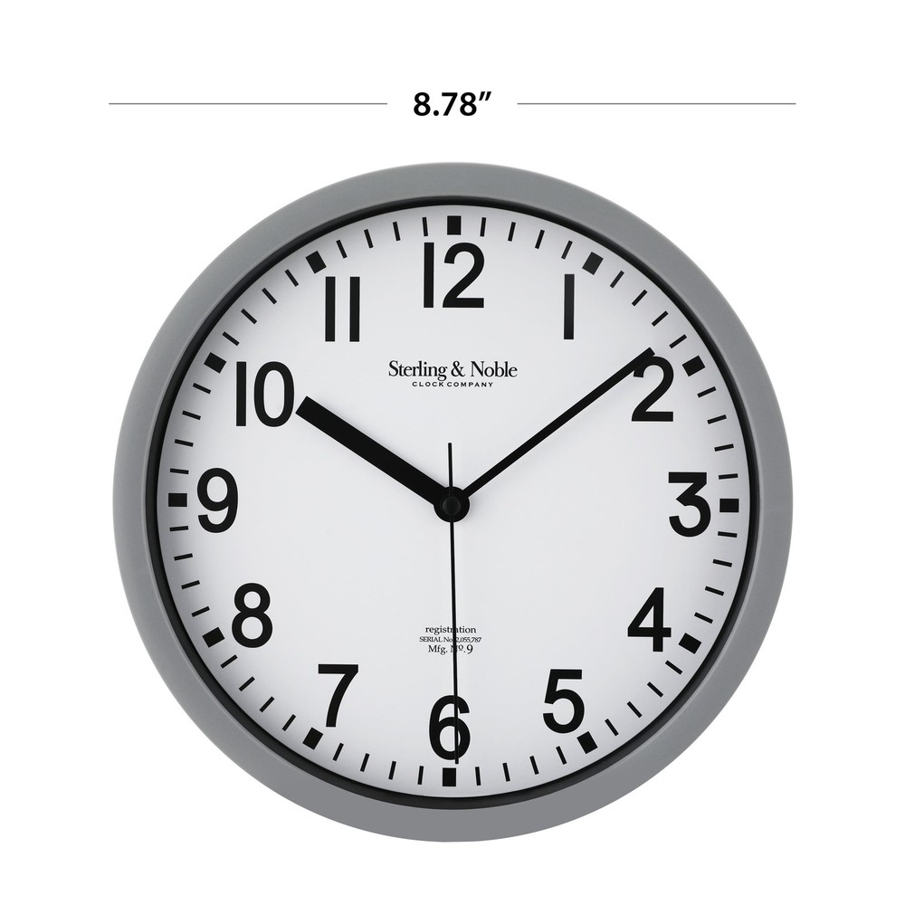 indoor gray round wall clock is 8.78" in diameter and offers a quality quartz movement with a glass lens. The analog clock has bold Arabic numbers with metal hour, minute, and second hands which makes it easy to read. This is a reliable time-keeping device that will coordinate with any modern decor. Use this clock in a child's playroom, den, living room, or office. 8.78" diameter wall clock Black metal hour, minute, and second hands Arabic numerals Glass lens Quality quartz movement Light weight wall clock Easy to hang Requires 1 "AA" battery to operate (battery not included)