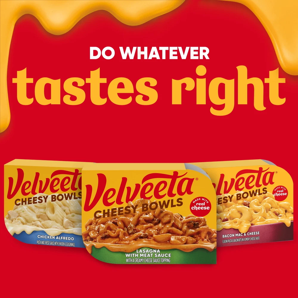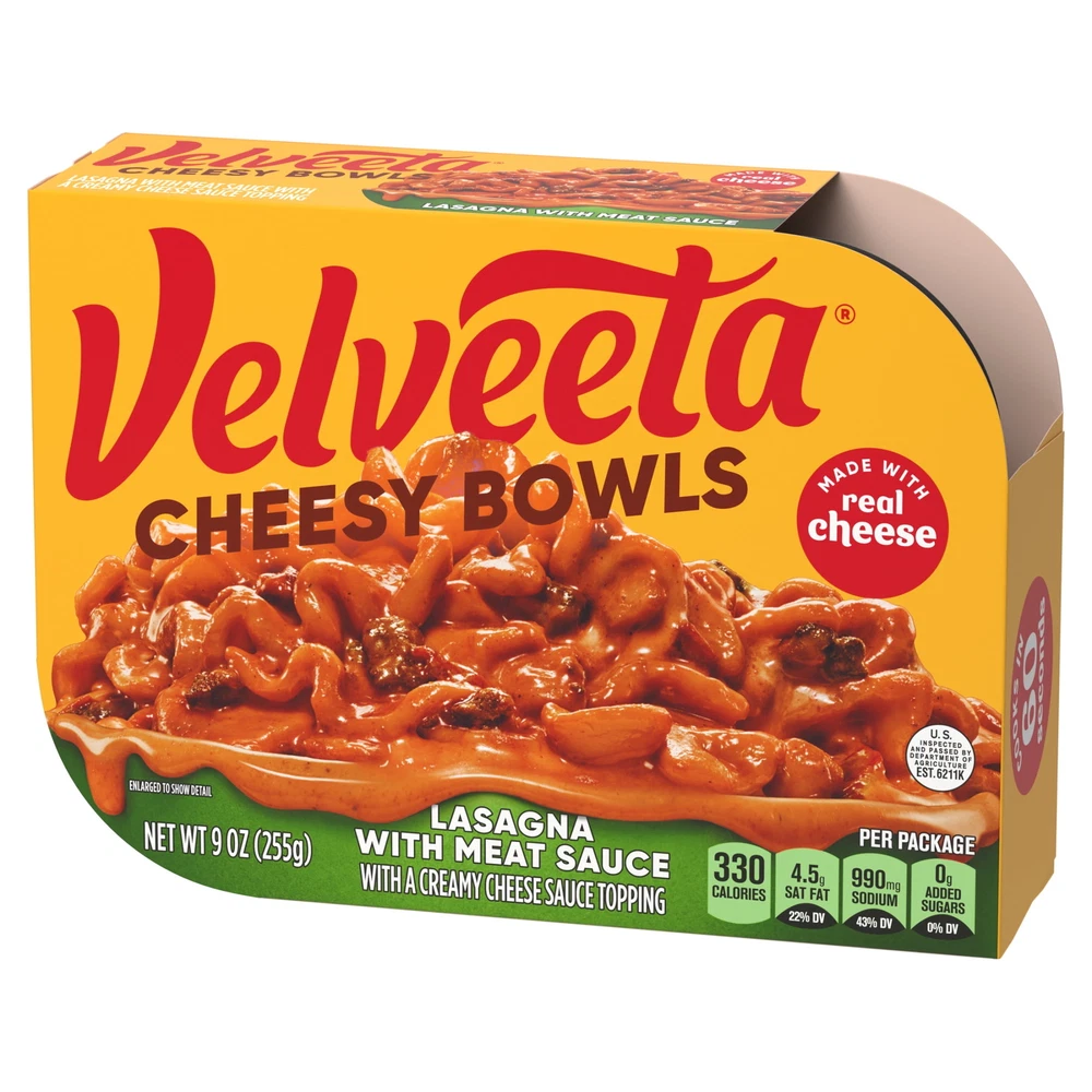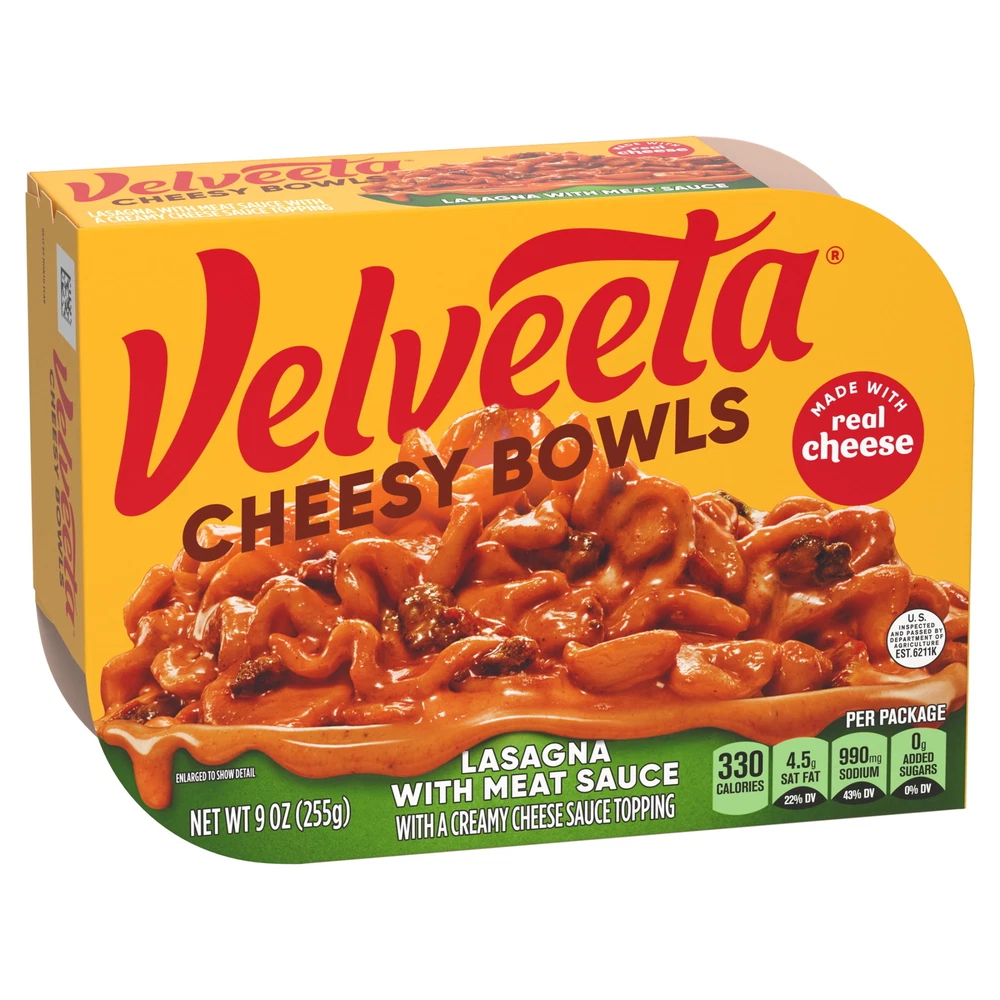 One 9 oz box of Velveeta Cheesy Bowls Lasagna with Meat Sauce Microwave MealVelveeta melts the creamiestSatisfy your cravings with unrestrained pleasure One 9 oz box of Velveeta Cheesy Bowls Lasagna with Meat Sauce Microwave Meal Velveeta melts the creamiest Satisfy your cravings with unrestrained pleasure Unapologetically go all-in for the cheesy, melty goodness you love best An outrageously delicious taste experience Velveeta Cheesy Bowls Lasagna features noodles with meat sauce in a creamy cheese sauce Our single-serving mac and cheese bowl is ready in just 60 seconds To prepare, remove cheese pouch, partially peel back film from top of tray, microwave on high for one minute and stir in cheese sauce SNAP & EBT eligible food item
