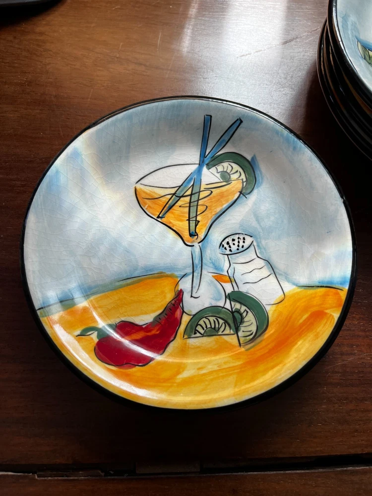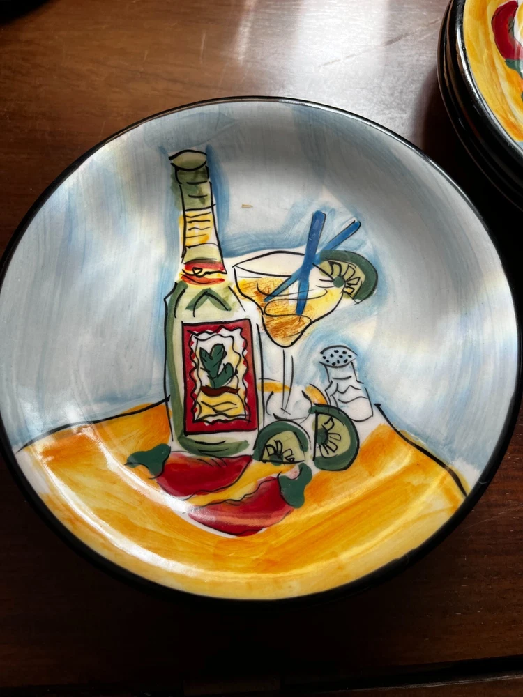 This is a four piece wine/cheese plate set, manufactured by HausenWare with the artist Maryjane Mitchell. Themed with margarita glass, limes, tequila bottle and salt. Contemporary art design. Dishwasher and microwave safe.