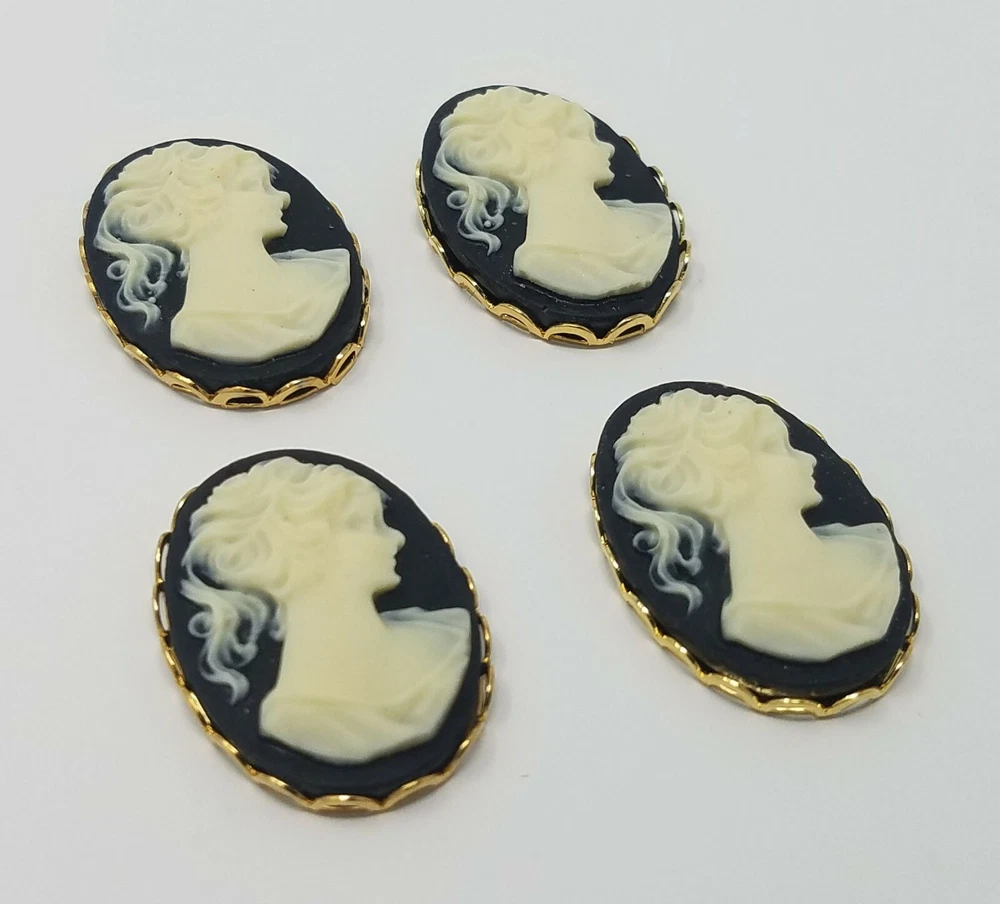 Pack of 4 pieces Ivory on Black Victorian Lady Resin Cameos with Lace Filigree Settings in Hamilton Gold (Brass Plated) Finish. Vintage accessories for making craft jewelry Cameos have a flat back. They measure 18 mm wide x 25 mm long. VOLUME DISCOUNTS AVAILABLE ON BEADS AND JEWELRY CRAFT SUPPLIES! Buy 2, Get 10% OFF. Buy 3, Get 15% OFF. Buy 4 or more, Get 25% OFF. MIX & MATCH ITEMS! **Must be purchased on US eBay website to be eligible.