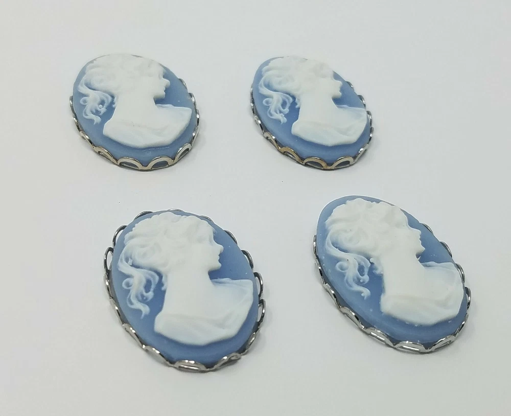Pack of 4 pieces Ivory on Blue Victorian Lady Resin Cameos with Lace Filigree Settings in Silver Tone Nickel Finish. Vintage accessories for making craft jewelry Cameos have a flat back. They measure 18 mm wide x 25 mm long. VOLUME DISCOUNTS AVAILABLE ON BEADS AND JEWELRY CRAFT SUPPLIES! Buy 2, Get 10% OFF. Buy 3, Get 15% OFF. Buy 4 or more, Get 25% OFF. MIX & MATCH ITEMS! **Must be purchased on US eBay website to be eligible.