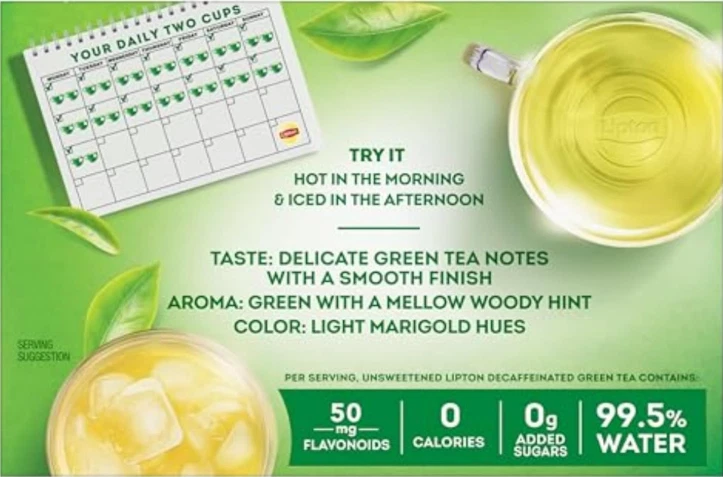 Lipton Decaffeinated Green Tea Bags, Unsweetened Teabags for Decaf Hot Tea or Decaf Iced Tea with Flavonoids, 40 Total Tea Bags About this item : Brand Lipton Item Form Teabags Flavor Green Tea Variety Green Unit Count 40 Count · DECAF GREEN TEA BLEND: Savor the smooth and delicate taste of Lipton Decaffeinated Green Tea any time of day. · 2 CUPS TO GOODNESS: Per serving, unsweetened Lipton Decaffeinated Green Tea contains about 50mg of Flavonoids, naturally occurring bioactives found in tea, vegetables, and fruit; Enjoy two cups a day to provide 100mg of Flavonoids. · EASY TO MAKE, HOT OR ICED: For hot decaf green tea, pour 8 fl oz of hot water (212°F) over a tea bag, infuse for 4 minutes, remove, and enjoy; For iced green tea, add 16 fl oz of hot water (212°F) over 4 tea bags in a pitcher, infuse for 4 minutes, remove, and sip away. · DELIGHTFUL TASTE AND AROMA: Bask in delicate decaf green tea notes with a smooth finish and a mellow woody aroma with Lipton decaf teabags. · YOUR DAILY HERO: Each serving of Lipton Decaffeinated Green Tea contains about 50mg of Flavonoids, 0 calories, 0g of added sugars, and is 99.5% water.