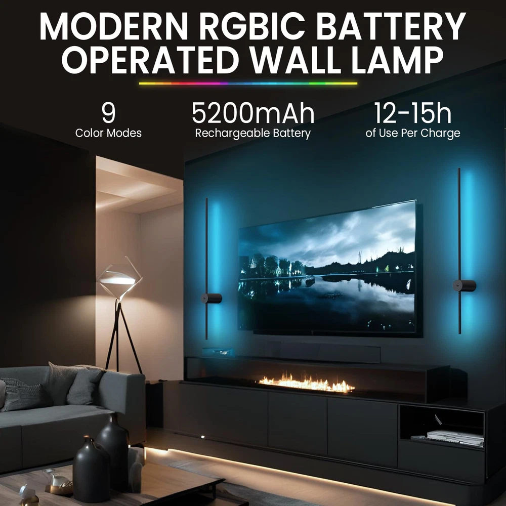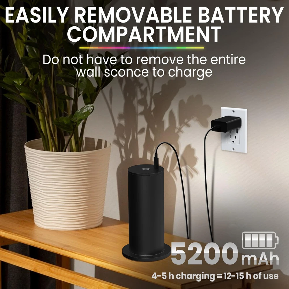 9 Color Modes & Dimming Capability - Our battery operated wall sconces offer dimming capability and 9 color modes, allowing you to customize lighting for any mood or occasion. Whether you prefer soft, ambient light or vibrant colors, you can easily adjust the brightness or hue to create the perfect atmosphere. This versatility makes our sconces both functional and fun, enhancing any space. Detachable battery compartment - The detachable battery compartment in our wall sconce offers a seamless and efficient charging experience. Instead of having to remove the entire sconce, users can simply detach the battery and charge it separately, saving time and effort. This design allows for easy access to the battery, eliminating the need to reposition or remove the fixture from the wall. Timer Function - The 2-hour and 4-hour time functions on our battery operated wall sconces offer both convenience and flexibility, making them a standout feature. These built-in timers allow users to enjoy the perfect ambiance without worrying about turning the sconces off manually. Whether you want a short, 2-hour glow for a cozy evening or a longer, 4-hour setting for extended lighting, these timers add practicality and energy efficiency. It’s the ideal solution for effortless, automated lighting that suits your lifestyle. Easy to install - Our battery operated wall sconce is designed for quick, hassle-free installation. Just mount it using the included hardware—no wiring or professional help needed. It’s the perfect solution for easy, stylish lighting in any space. Sleek Modern Design & Versatile Use - Our battery operated wall lights offer a sleek, modern design that elevates any space. Their versatile functionality allows them to be used for ambient, accent, or task lighting, while their cordless feature makes installation easy in any room—no outlets required. Stylish and practical, they fit seamlessly into any setting.