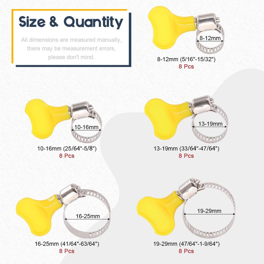 High Quality Key Type Hose Clamp Easy to use, don’t require any tools to tighten or loosen. Used in securing hoses around pipes or for automotive use Metal: Plastic + Metal Package Quantity: 40pcs Package Includes: 8-12mm---------------------8pcs 10-16mm-------------------8pcs 13-19mm-------------------8pcs 16-25mm-------------------8pcs 19-29mm-------------------8pcs Organized Within A Convenient Plastic Storage Case, Plastic Case Can Be Reused High Quality Key Type Hose Clamp, Easy to use, don’t require any tools to tighten or loosen. Metal: Plastic + Metal Package Quantity: 40pcs (5 sizes, each size 8pcs) Fit Hose Diameter: 8-12mm, 10-16mm, 13-19mm, 16-25mm, 19-29mm Organized Within A Convenient Plastic Storage Case, Plastic Case Can Be Reused