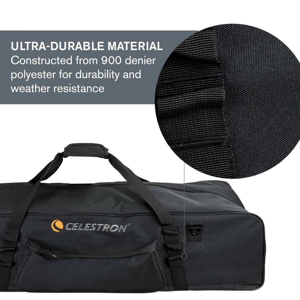 The 40-inch telescope bag stores your telescope’s optical tube, mount, tripod, and accessories. Lighten your load with this sleek, padded, protective telescope soft bag. An all-in-one storage solution, it’s the perfect choice for safely transporting your equipment anywhere with ease and confidence. The bag is made with ultra-durable material to offer superior protection from the elements. The interior walls are lined with 16mm thick EPE foam to protect your gear and have internal straps to hold your equipment in place. Transport your bag one of two ways: via the pair of sewn-in handles or the optional clip-in padded shoulder strap for hands-free carrying. Utilize the external accessory pocket for your eyepiece, adapters, and power packs along with the sewn-on fabric loops on the outside of the bag if you want to clip even more accessories to the exterior of the case. This custom-made optical tube bag is truly a must-have for the telescope owners of all stripes. PROTECT & STORE YOUR TELESCOPE: This sturdy, portable, grab-and-go bag keeps your optical tube, mount, and tripod safe during travel and storage. ULTRA DURABLE MATERIAL: 900 denier outer and super smooth inner polyester layers, with 16mm thick EPE foam sheets to create a protective barrier for your equipment. WATER RESISTANT: A PVC-reinforced hard bottom panel provides extra protection from the elements and minor bumps. CONVENIENT DESIGN: Choose from two access points to access or remove your optical tube. Transport your bag over the shoulder or by the handles. ACCESSORY STORAGE: Stash accessories in the external zippered pocket or the bonus padded accessory bag. UNBEATABLE WARRANTY AND CUSTOMER SUPPORT: Buy with confidence from the world’s #1 telescope brand, based in California since 1960. You’ll also receive a two-year warranty and unlimited access to technical support from our team of US-based experts.