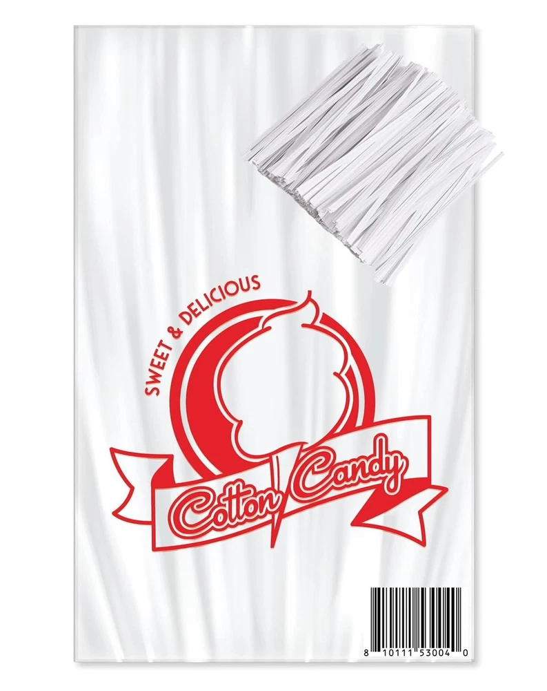 Constructed of .80 mil plastic, this durable 11 1/2" x 18 1/2" bag is the perfect solution for packaging up and displaying your colorful cotton candy. Featuring a paperboard header, these cotton candy bags remain securely attached while in storage. Clear design with fun, red print Complete with paperboard header Durable .80 mil plastic