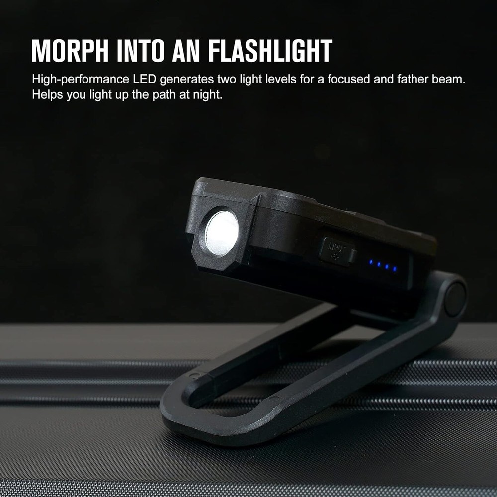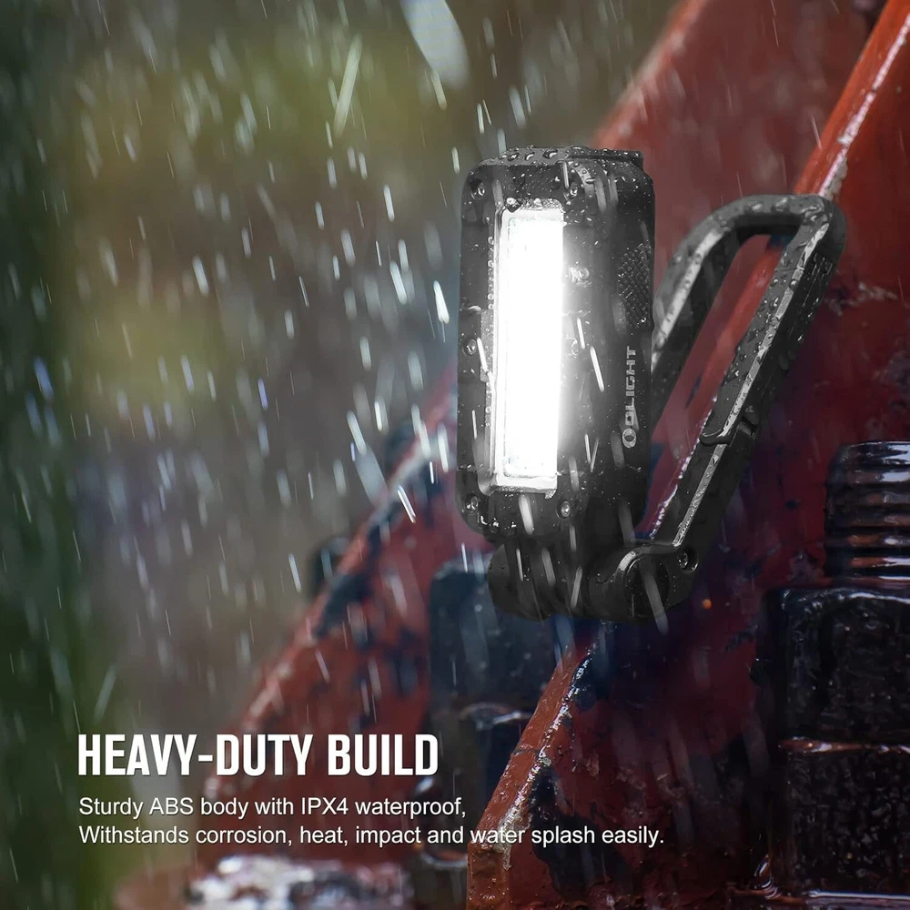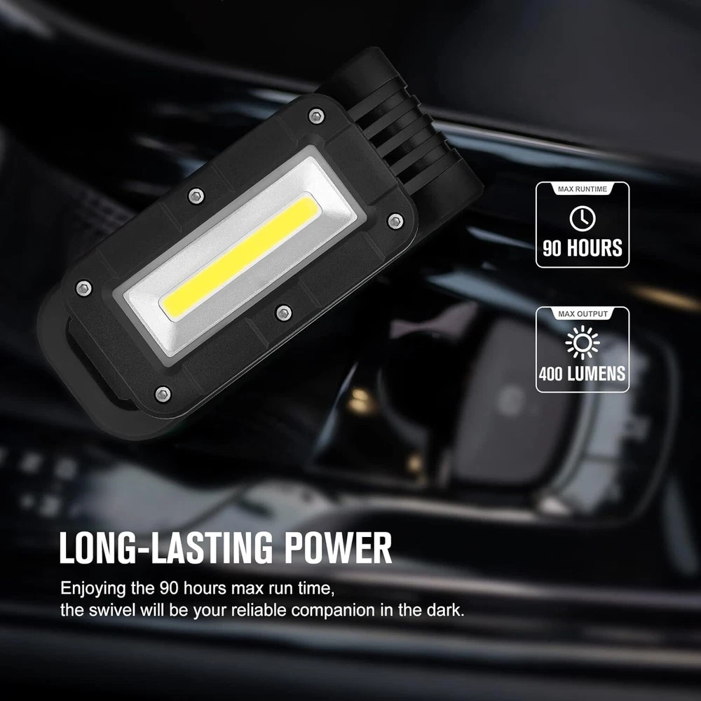 OLIGHT Swivel 400 Lumens LED Compact Rechargeable Magnetic COB Work Light, Adjustable Stand with Magnetic Base and Hanging Hook, 90 Hours Lasting Power, Job Site Lighting for Camping (Black) [Super Bright COB Light] Max 400 Lumens COB LED magnetic work light with built-in battery [Heavy-grip Magnetic Base] Three strong magnets inside the stand can firmly attach onto any iron surfaces [Rechargeable and Max Runtime] Built-in rechargeable battery, can be fully charged in 3.7 hours via a Type-C port, and ensuring a max runtime of 90 hours [Reveal itself in the Darkness] Glow-in-the-dark Strip around the panel, allows you to quickly locate the swivel in the dark [Hard and Waterproof] Sturdy ABS body with IPX4 waterproof, withstands corrosion, heat, impact and water splash easily