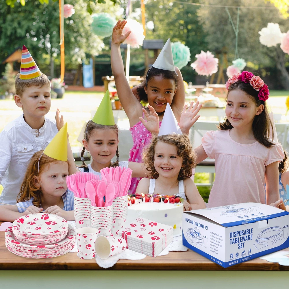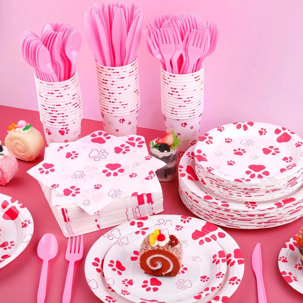 Specifications: Material: paper, plastic Size: as shown in the pictures Color: as shown in the pictures Quantity: 400 Package includes: 50 x 7-inch paper plates 50 x 9-inch paper plates 50 x 9-ounce paper cups 50 x forks 50 x knives 50 x spoons 100 x napkins Sufficient package: our set contains a total of 400 pink paw party supplies, including 50 pieces of 7-inch/17 cm plates, 50 pieces of 9-inch/22 cm plates, 100 pieces of napkins, 50 pieces of 9-ounce paper cups, 50 sets of knives, forks and spoons, sufficient to meet your party use and Premium material: our puppy paw print theme tableware is made of quality thick paper, safe and sturdy, not easy to break or leak; the paper napkins are soft and absorbent, the disposable forks, knives and spoons are made of reliable plastic; our smooth and waterproof utensils can serve you for a long time Unique design: our dog party decorations are well designed with pink dog paw elements, delicate and eye-catching; the vivid design and vibrant colors will create a nice visual enjoyment and add more energy to your puppy party Wide applications: the pink paw party supplies are great choices for various parties, such as birthday parties, pet themed parties, dog showers, picnics, home parties, camping, barbecues and more Practical gift: the plates, cups, napkins and cutlery are disposable, you can throw the puppy party supplies away directly after use without worrying about the mess or spending a lot of time on cleaning, so you can give the paw patrol plates as a practical gift to your friends or family
