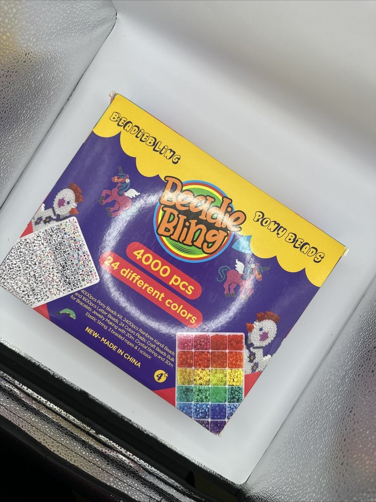 4000+ pieces of Pony Beads in assorted colors, each bead measuring 6-6.9 mm. Made of plastic, these beads are perfect for crafts and jewelry making. They come in two storage boxes for easy organization.