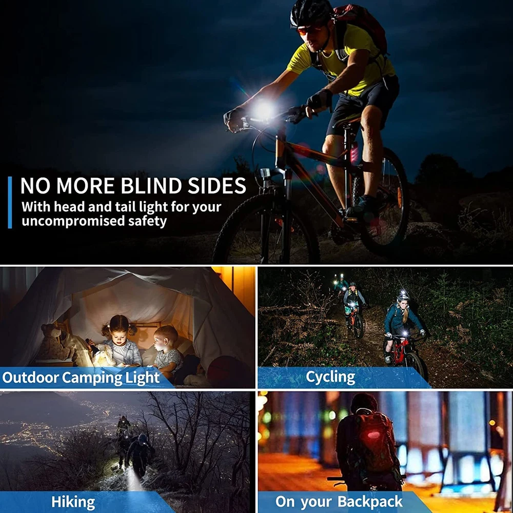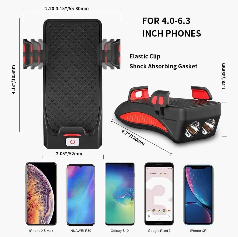 Product Description 【USB Rechargeable&Power Bank】 Built-in High-capacity 4000mAh rechargeable batteries. It only takes 2 hours to fully charge with an extra-long run time. USB bike light can also charge your mobile phone or provide lighting, Even if you are outdoors, you no longer have to worry about your phone running out of power or being dark. 【3 LED Beads & 3 Modes】 The Bike Headlight is equipped with 3 professional LED lamp beads adopt German advanced technology produces ultra bright light which making your bike stand out. Features 3 lighting modes (High,Low,Flash) for choosing according to your needs. Enhance the safety during night riding. 【Waterproof-Rainproof-Anti-Snow】 Made of premium material, it has excellent impact resistance, heat dissipation and corrosion resistance. Waterproof bike headlight against splashing water from any angle. 【Multi-Functional】 This LED bike light set is versatile enough for cycling, hiking, camping, or any outdoor activity and can be used as phone holder, emergency flashlight and powerbank. And built-in horn with 5 sound modes, the highest decibel can reach 130dB, you can easily press the button to warn others in an emergency. Note:As phone holder, adjustable width(55-90mm), suitable for most mobile phones(4-6.5 inch) Specification: Color:Black Material: ABS Size: width 60MM* length 120MM Chuck range: 50-80MM (4-6.3 inch mobile phone) Charging type: USB charging Charging time: 5 hours Battery capacity: 4000mAh Output voltage / current: 0.8A Headlight brightness: 40000LM Lamp type: LED lamp beads *3 Speaker decibel: 130 decibels Sound mode: 5 sound modes Mobile phone size requirements: 4-6.3 inch mobile phone Packing List: 1x Bike Headlight