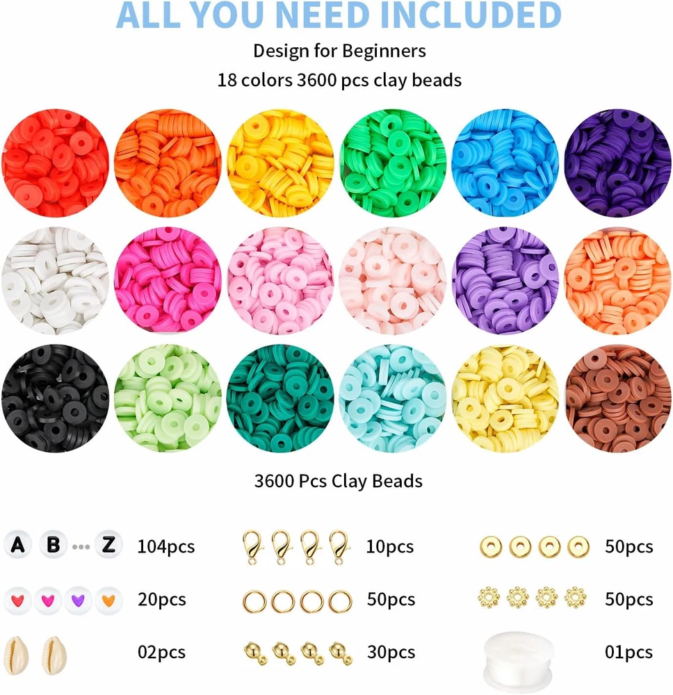 Perfect Bracelet Making Kit to Start - This clay bead kit includes basic thing for a beginner to start making beautiful bracelets and jewelry, including 3600 pcs flat polymer clay beads and about 400 pcs charms kit (2 types random letter beads, colored heart beads, white shells, gold flat pieces, gold flat flowers, slobster clasp set, etc),1 rolls of 10 meters stretchy strings. Let's start your new wonderful journey with the Dowsabel jewelry-making kit as the origin Be Friendly to Beginner and Kids - We have prepared instructions and step-by-step videos to teach you how to make bracelets, jewelry and earrings. In addition, we will also introduce you to the usage of charms accessories one by one, such as lobster clasp, binder, and so on. Whether you are a beginner or not, you could enjoy a relaxed and enjoyable experience from Dowsabel store Premium Quality, Safe to Use - All of our beads are made of healthy materials, light and durable, comfortable to the touch, not easy to fade, waterproof, and can be worn when bathing or swimming. The diameter of clay heishi beads is 6mm with a 2mm hole and thickness is 1mm. Recommended age 6+ years old Enjoy DIY, Endless Creativity - With thousands of clay beads in 18 colors and various charms accessories, the possibilities for creative expression are endless. It could exercise hands-on skills and immerse yourself in the joy of making friendship bracelets. Let your imagination run wild and create unique jewelry that reflect your style now! Wide Use & Meaningful Gift - Perfect kit for DIY crafts like jewelry making, bracelets, necklaces, earrings, anklets, keychains, and any ornaments. It’s an ideal gift for your daughter, granddaughter, sister, mother, besties. A meaningful and cheerful gift choice for Taylor's concert, birthdays, Valentine's Day, Mother's Day, Christmas, Thanksgiving Day, etc Product Description Step-by-step videos to teach you how to make bracelets. A good activity to accompany your kids, also exercise children’s abilities. Let the kids make friendship bracelets in the company of wonderful friendships. 1 Design for Beginners 2 Parent-Child Activity 3 Friendship Bracelet Kit The video showcases the product in use. The video guides you through product setup. The video compares multiple products. The video shows the product being unpacked. Do you think we only have 18 colors of clay beads? We still have more... Making Your Bracelets ! Ideal Gifts for Girls! Dowsabel Clay Beads for Bracelets 1 BOX 4000PCS BEADS 18 Colors Clay Beads for bracelet - Everything you need in one box. 1 BOX 5000PCS BEADS 20 Colors Clay Beads Kit - Most Popular Bracelet Making Kit. 2 BOXES 7500PCS BEADS 24 Colors 2 Box of Clay Beads - with letter beads and charms. BE FRIENDLY TO BEGINNER Teaching you how to get started from now! BE ClASSIC TO BEGINNER Vibrant colors of clay beads uniquely selected for girls. UNIQUE CUTE STYLE Meet your requirements of colorful DIY objects. Launched in 2024 Spring Launched in 2023 Spring Launched in 2023 Summer