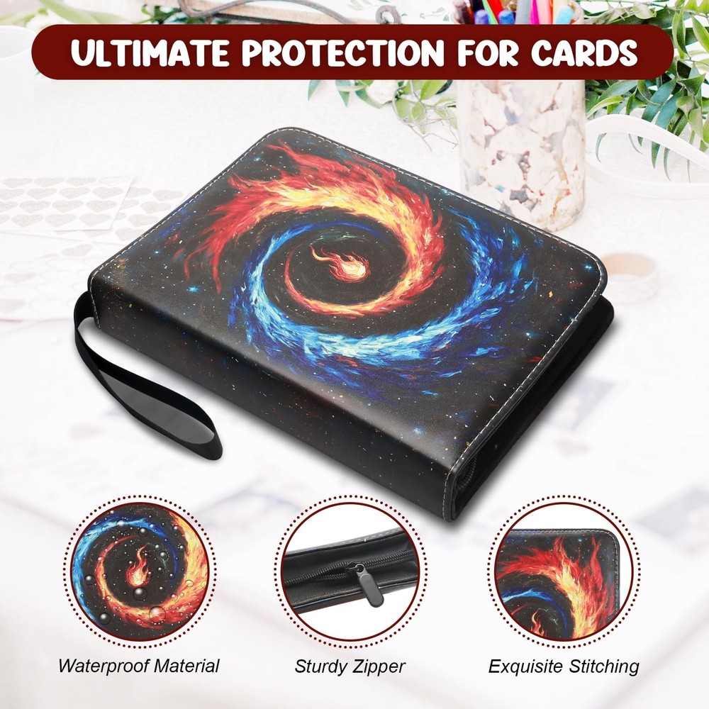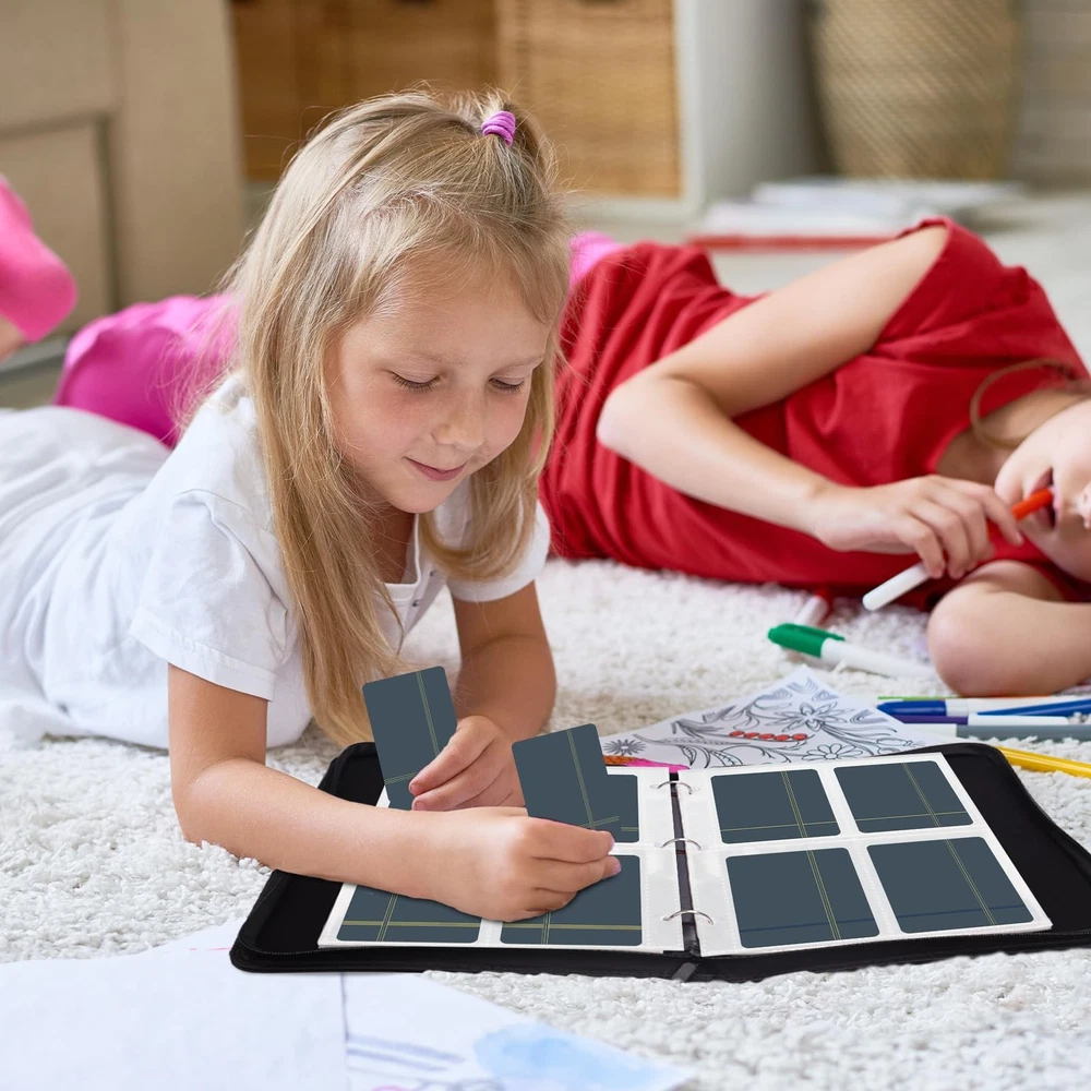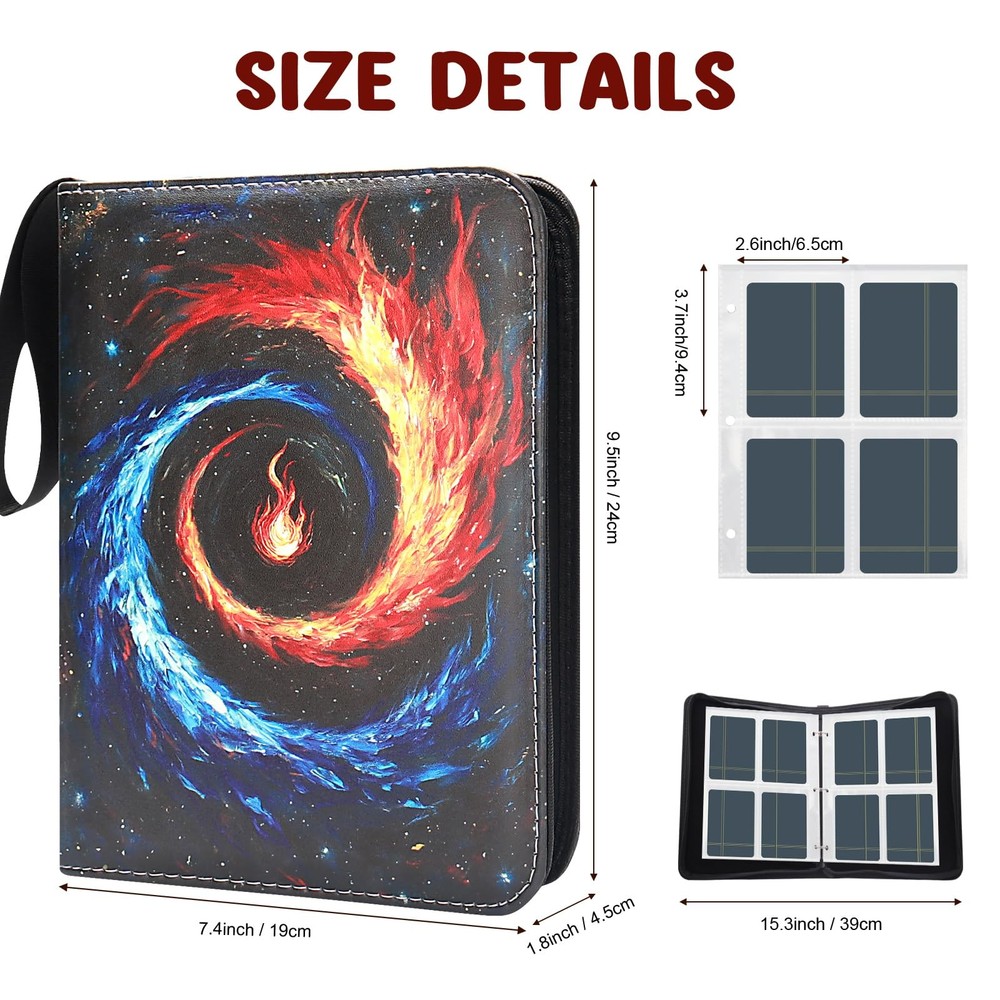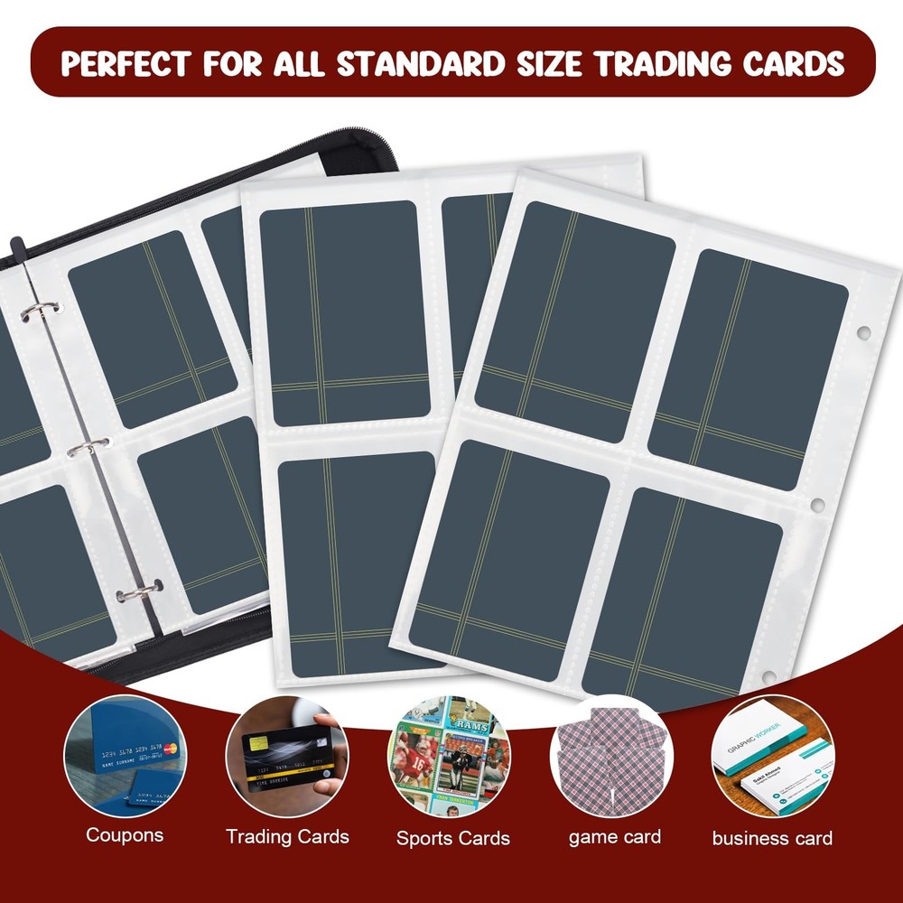The surface of this card collector binder is made of premium-quality PU leather, which is waterproof, scratch-resistant and not easy to deform. The fully closed zipper design protects the card in all directions, and the card will not fall out when you hold the card binder at any angle. Quality zipper seals the binder to keep cards intact Massive Storage Capability - The baseball card binder has 50 double-sided protective sheets to hold up to 400 cards. The cards can be stored in an orderly manner, instead of throwing them everywhere, which helps children develop good storage and organization habits Premium Protection - The card holder binder constructed with thickened PU leather exterior to prevent scratches, bending and UV damage, ensure long-lasting protection and keep your trading cards in mint condition for decades Multi-protection for Your Cards - This sports card binder adopts a closed zipper design to prevent the card from falling. The protective sheets are made of thick waterproof material, dust-proof and moisture-proof, which effectively protects the card from fading and staining Wrist Strap Design - Card collection binder adopts a humanized wristband design, and you can hang it on your wrist when you go out, easy to carry. The stainless steel 3 ring buckle can be easily opened and is not easy to scratch your hands, and it is convenient to increase or decrease the card sleeve - suitable for expanding collections of trading cards and sports cards Wide Application - The card holder binder not only can store game cards, business cards, photos, and other standard-size cards but also can as present for Thanksgiving, Christmas, birthdays, and other holidays for children, adding different fun to them