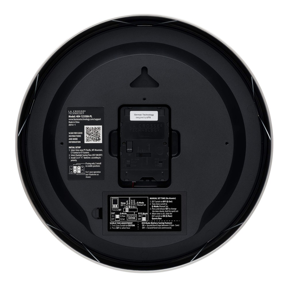 The UltrAtomic wall clock features the most accurate atomic movement on the market. Like a traditional atomic clock, this clock automatically sets itself and updates for Daylight saving time. However, this clock is equipped with two antennas that allows it to work in the nosiest, hostile electronic environments such as busy office buildings, hospitals, or other institutions. With this enhanced reception UltrAtomic clocks increases the WWVB signal reliability and penetration. No more worrying about changing out batteries every year, with its additional battery compartment you’ll keep your UltrAtomic clock running longer. This feature keeps the batteries in your clock running for approximately 3 to 5 years before you would need to replace. Optional ECO-MODE feature is a battery saving feature that will pause the second hand at 12:00 during the hours of 11:00pm-5:00am. Wrapped in a modern 14" stainless steel frame with a plastic shatter-proof lens, this clock attracts in a commercial or residential space. [5-YEAR BATTERY LIFE] – A quality set of 4 “C” batteries will keep the clock running for up to 5 years – an impressive feat offering unparalleled convenience and peace of mind [ROBUST RECEPTION] Dual antenna provides best reception to WWVB time broadcast, even in heaviest electronic traffic areas such as hospitals or commercial buildings [CUSTOM TIME SET] Select from 4 USA time zones or Customize to any World Time [METAL FRAME] Stainless steel polished silver frame and shatter-proof lens [ECO-MODE] Optional Eco-mode feature also saves battery life; Q-MODE (Quartz mode) sets to any manual hour