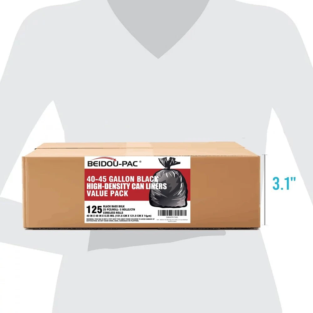 1, Product information: 40-45 gallon large balck plastic recycling trash bags, Size: 40" x 48"x 14 mic, Total 125 bags bulk (25 PCS/ROLL, 5 CORELESS ROLLS/CTN), Perfect for 40-45 Gal Capacity Office, commercial, industrial, or residential waste. 2, Reducing the use of plastic, the high-density polyethylene film trash bags are designed super lightweight and thin, and their durability is not compromised in any way. They can handle a wide range of waste without puncturing or tearing for everyday cleaning needs. 3, High quality customized garbage bags design, Star seal at the bottom can increase the load carrying capacity, leak-proof trash bin liners does not break or tear easily. 4, Open simply and easily, Coreless rolls in dispenser box for easy use and neat storage, easy to pull apart and easy to open.It can also be used as a gift wrapping, 5, Our liners are perfect for cleaning purposes in municipal, institutional and industrial environments, Compatible with most commercially available standard buckets, bins and tanks,Choose our bulk cost-effective options garbage bags and you'll have plenty of bags for months to come.