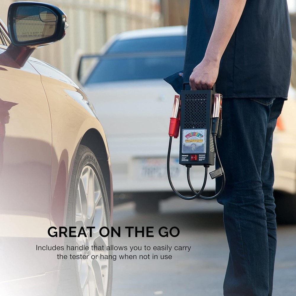 [CONVENIENT]: Whether for the home, garage, or at the shop, the battery load tester is portable and DIY compatible for diagnosing and applying load to car, van, boat, truck, SUV, motorcycle, RV and other automotive 6 & 12 volt batteries. [QUALITY]: Tester body features protection-encased analog voltage meter display, anti-sparking internal switchgear and external handle grip at top for portable carrying. [DURABLE]: Copper clamp connectors feature red positive and black negative rubber grips to easily designate test clip placement on battery terminals. [PERFECT FOR MECHANICS]: Load on test switch (hold load for maximum of 10 seconds) draws battery current to simulate starter motor draw for accurately and easy to read determining battery condition. [ACCURACY]: Technical specifications: Fixed load current of 100 AMP, 100 AMP load test for 12V batteries up to 1000 Cold Crank Amps, 50 AMP load test for 6V batteries up to 1000 CCA. Voltage accuracy of ± 0.2V.