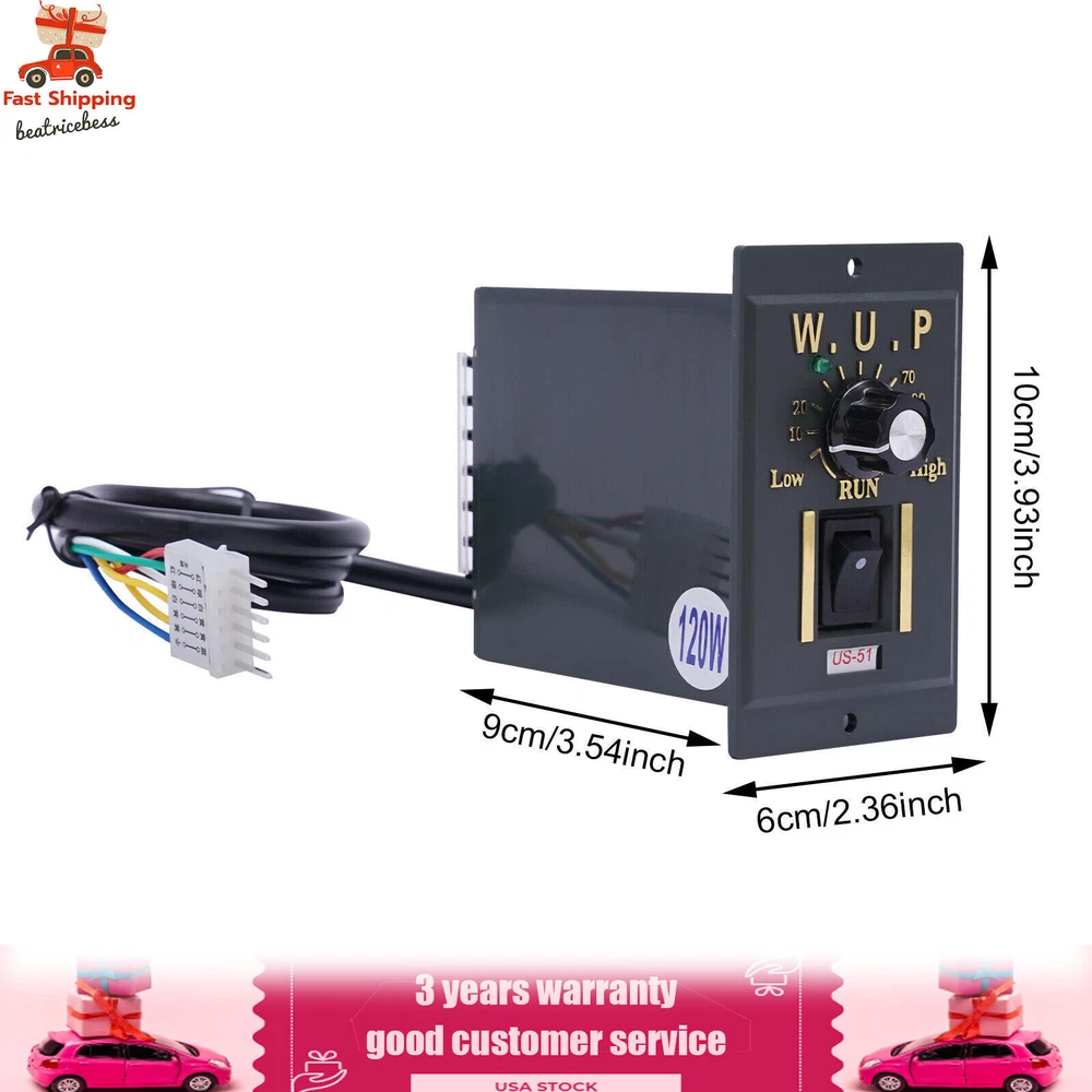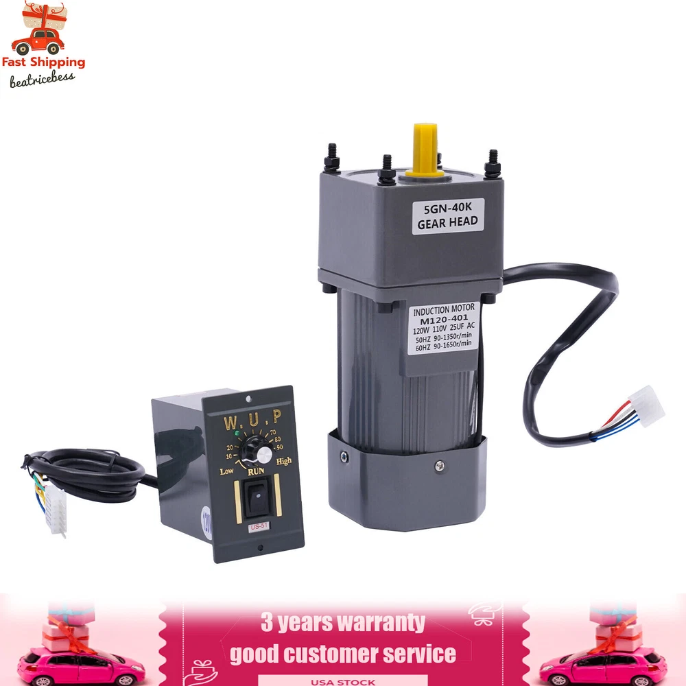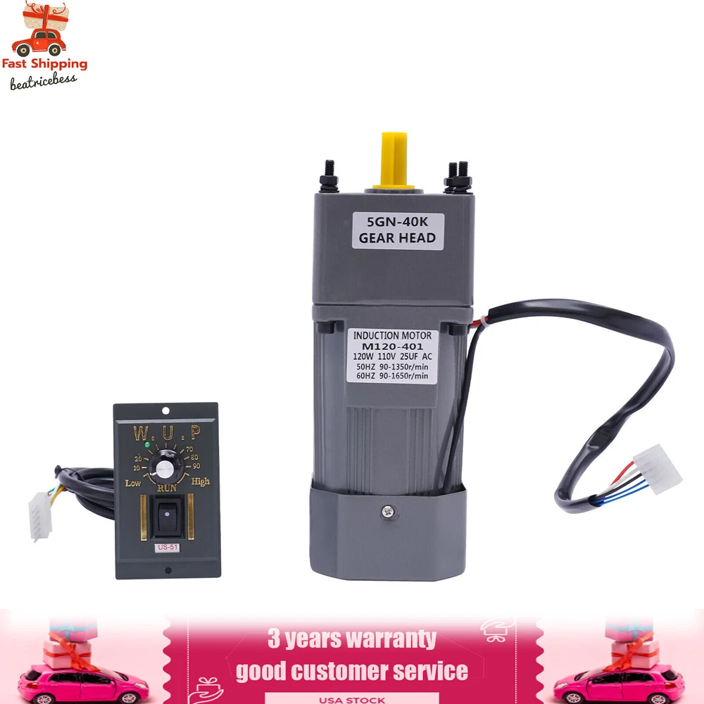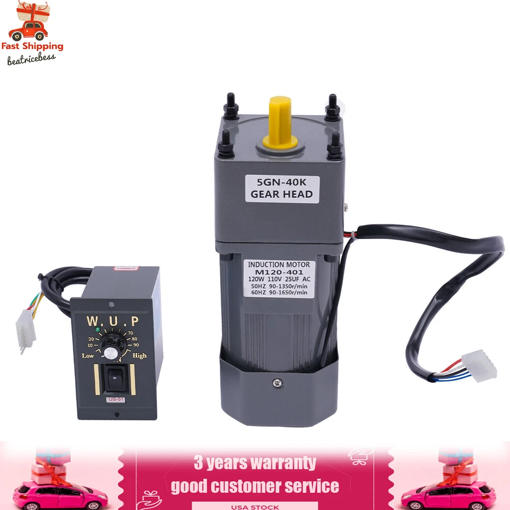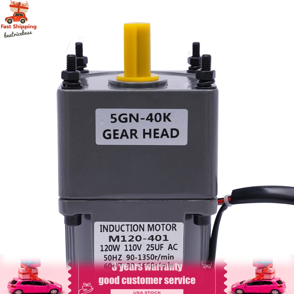 40K Gearbox Electric Motor 110V AC Geared Motor High Torque Single-phrase Gray 120W 40K 110V AC Motor Low Speed Mini Gearbox Electric Motor Barbecue High Torque 110V Geared Motor Synchronous Reduction Motor Reversible Description This is an AC 110V gear motor with 120W power, which can achieve the 1350r/min speed. It uses pure copper coils and allows for low-noise&powerful working, making it suitable for homes, handcrafts, school projects, model-churning soda machines, low-speed machines, and any other product you want. You can turn the speed control knob to adjust the motor speed, realizing the desired effect. Key Features Build to Last: Our product is made of high-quality cast aluminum shell and carburized carbon steel gear and is characterized by heat resistance, high quality, and long service life through plastic spraying, integration, and heat treatment. Speed Adjustable : With the speed controller that has various optional speeds and large torque, you can adjust different speeds according to different products to achieve the desired effect. Good Heat Dissipation: The built-in cooling fan(>60W), cooling window design on the bottom, and pure copper coils with stable performance can effectively dissipate heat to ensure long-term stable operation. Integrated Reducer: The integrated reducer with a heat treatment process improves the gear wear resistance and work efficiency. Stable Operation: Both ends of the rotor are equipped with ball bearings, which can reduce friction and temperature during use to ensure stable operation. High Safety: The slow start function can effectively avoid current overshoot and protect the motor. And it is adjustable to meet different personalized use needs. Reversing Function: It has a reversing function that is flexible with normally open and closed control systems. Easy to Operate&Assemble: With the simple structure, you can assemble this product quickly. The simple switch button and speed control knob make it easy for you to operate. Protective Package: To prevent the product from being damaged and bumped during transportation, we packed it with foam boxes and bubble pads to protect your products to the maximum extent possible. Buy with Confidence: We have been working hard to provide better service and quality for our customers, which is our goal. If there is any problem with our products, please contact us in time. Details Clear Marks: These clear number&letter marks on the machine allow for easy and convenient operation. Power Cable: The power cable has distinct colors for different wires, so you can connect them easily without confusion. Holster: The yellow holster can effectively protect the shaft when not in use. Application It is widely used in packaging, printing, textile, dyeing, chemical, food, and pharmaceutical construction machinery as well as advertising, office, petrochemical, instrumentation, stage lighting, transmission, automatic warehouse, parking, and other equipment. How to Install Please remove the holster before installation. Fix the reducer on the gear motor with four screws. Install the keyway at the keyway opening. Plug the speed controller and gear motor together (main wire to main wire). Unscrew the two AC screws on the back of the speed controller. Connect single-phase power to both AC ports (without distinguishing between zero and fire wires) and tighten the screws. Turn the speed control knob to adjust the motor speed. Install the bracket(not included) on the motor. Specifications Model: M120-401 Color: Gray Material: Cast Aluminum Gear Material: Carburizing Steel Processes: Plastic Spraying, Integration, Heat Treatment Process Type: AC Gear Motor, Induction Motor Shape: Square, Round Feature: Portable Power Phrase: Single-phrase Motor: Pure Copper Motor Noise: About 50-60db Built-in Fan: >60W Torque: 21N.m Voltage: AC 110V Power: 120W Capacitance: 25UF Speed: 50Hz 90-1350r/min, 60Hz 90-1650r/min Reduction Ratio: 1:40 (40K) Shaft Diameter: 12mm/0.47inch Shaft Length: 28mm/1.1inch Keyway: 4mm/0.16inch Key Depth: 25mm/0.98inch Dialogue Mounting Holes: 104mm/4.09inch Axis Eccentricity: 18mm/0.7inch Disc Diameter: 34mm/1.34inch Through-hole: ∅8 Gear Motor Height: 16.5cm/6.5inch Reducer Size: 9*9*6.2cm/3.5*3.5*2.4inch Speed Controller Size: 9*6*10cm/3.5*2.4*3.9inch Package Size: 28.5*24.1*12.5cm/11.22*9.48*4.9inch Net Weight: 4.96kg/10.9lbs Gross Weight: 5.3kg/11.68lbs Package Included 1* Speed Controller 1* Gear Motor 1* Reducer Notes Based on the industrial standard, to meet the different needs of customers, our motor does not include a power cord. You need to purchase a power cord to connect. The bracket is not included in this package, so you should purchase it yourself. Please do not plug&unplug the power cable when the power is on. Please do not knock or beat the machine. The speed reduction motor is composed of a motor and reducer, different speed ratios can achieve different speed regulation ranges, and they have different strengths. Under different deceleration ratios, the output shaft speed is different. The output shaft speed is equal to the motor speed of 1350 rpm divided by the deceleration ratio. When the gearbox decelerates, the greater the speed ratio, the greater the force. The slower the speed regulated by the governor, the smaller the torque. The motor can run for a long time within the safe speed regulation range. The safety speed range of a small load: is 50% of full speed-full speed; The safety speed range of a large load: is 70% of full speed-full speed. Please allow the slight color difference caused by the shooting light and 1-3cm error due to manual measurement, and make sure you do not mind before you order. Payment Delivery details Terms of sales About us Contact us Payment We accept ebay payment 。 Fees such as import duties, taxes are not included in the item price or shipping costs. These charges are the buyer's responsibility. Delivery details Shipping: 2-9 working days to: USA Terms of sales We