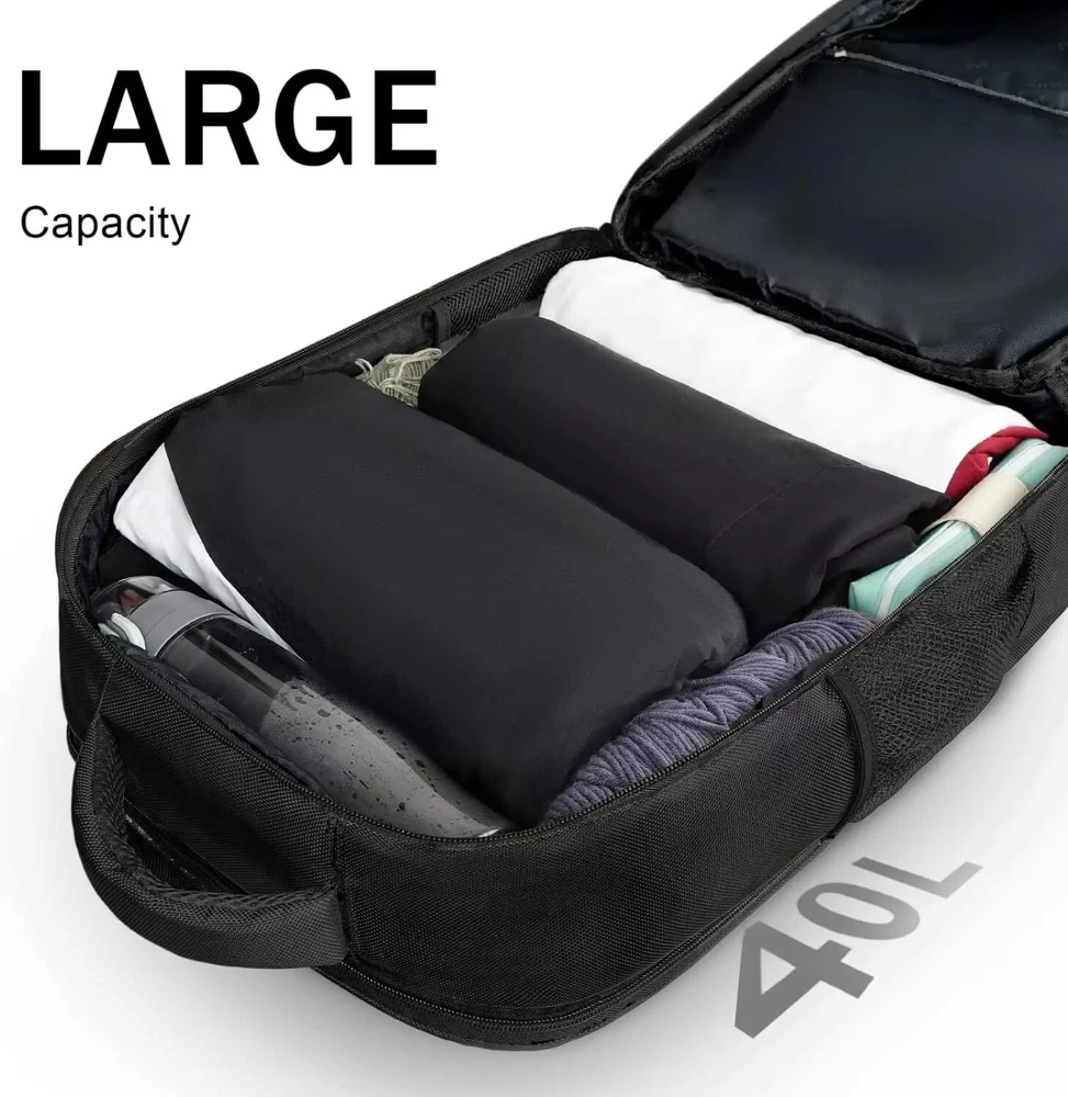 Ultimate 40L Travel Backpack: Flight Approved, Water Resistant, USB Port FUNCTIONAL & SAFE: USB interface with built-in cable design, great convenience for charging your electronic devices via connecting your own power bank Comfortable breathable back design gives you maximum back support; A luggage strap allows the travel backpack to securely slip over the handle of any rolling luggage for hands-free transport, easier carrying. With a hidden anti theft pocket on the back protect your valuable items from thieves MULTI-COMPARTMENT: Dimensions 18(H)*13(L)*8(W)inch, Light Weight 1Kg(2.2lb). Travel backpack has a separate laptop compartment could hold 17.3 inches computer and protect laptop from moving; Main compartment with double zippers has enough storage room to store your daily necessities for an overnight trip; Organizer compartment has many pockets keep your items organized and easier to find; There are many other pockets for different purposes. SHOE COMPARTMENT: The shoe compartment is crafted to bottom of large travel backpack carry on to keep the shoes separately and everything else neatly. This shoe storage is wide enough to hold size 10-12 for both lady shoes and man shoes which can also be used as toiletries bags and for other uses; There is two venting hole in shoe compartment, make it keep breathable RELIABLE MATERIAL: The large travel laptop backpack is well made of Water-Repellent and High-density Nylon Fabric with metal zippers; There has Lockable Metal Zippers in laptop pocket to protect your computer or valuables from thieves (you need to lock up laptop compartment with your own lock); Foam padded top handle is comfortable to carry on for a long time ROOMY CAPACITY: The capacity of the travel bags is 40L. You can carry it onto airplane. The carry on backpack ensure a secure long-lasting usage everyday or weekend, Serve you well as travel personal carry on bag, business trip, outdoor activities backpack, perfect for men, women.