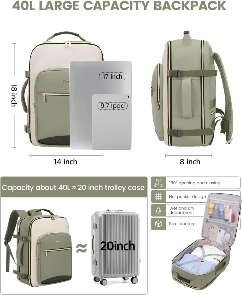 Fast Shipping Great Customer Support Satisfaction Guaranteed DESCRIPTION Shipping Shipping Shipping All domestic packages are shipped for Free (Unless other shipping method was selected during the checkout) Most items ship and arrive much sooner than the estimate delivery date. Usually within 2-3 days from payment. However, we have longer estimates to compensate for the occasional delay or supply chain breakdown. We do not accept P.O. BOXES - PLEASE PROVIDE A PHYSICAL ADDRESS Return Return Return In the event that you would like to return your purchase, we allow returns that are processed within the defined return date (the return date is to be found in the return policy/shipping and handling section) Please contact us for a return authorization and the return shipping address. Payment Payment Payment PayPal is our preferred method of payments it's the quickest, easiest and most secure way to pay for your goods or services online. PayPal offers buyer and seller protection should there be a problem. If you do not have a PayPal account, to get started and buy your first item with us is very easy. Simply click on the 'Buy It Now' button and follow the eBay checkout steps. Select PayPal as the payment method you then will be given the chance to enter your card details in to PayPal's secure checkout in order to pay for your order. Once the payment has been made, you will then be given the opportunity to make your own PayPal account to make paying for your items in the future very easy. Should there be a problem with payment please do let us know. Feedback Feedback Feedback Customer satisfaction is very important to us. If you have any problem with your order,please contact us and we will do our best to make you satisfied, please do not leave a negative feedback before we resolve your problem. We guarantee that your issue will be solved quickly. As long as you are happy with your purchase of , please leave us a positive feedback. Your feedback is very important to us it affects our search placement on eBay. We will leave a positive feedback for you in return automatically once we receive your feedback. Contact Us Contact Us Contact Us If you have any queries, please contact us via ebay. We usually respond within 24 hours on weekdays. Thank you for visiting our ebay store! 【Airline Approved & Convenient】Our carry on backpack measures 18*14*8 inches, meeting the requirements of budget-friendly airlines like Spirit, Frontier, and JetBlue. It easily fits under the seat or in the overhead compartment, making it the perfect personal item for air travel. 【Spacious & Organized】With a capacity of 40L, 4 compartments, and multiple pockets, this travel backpack allows you to easily separate and organize your belongings. Pack 3-7 days worth of travel essentials with ease. 【Smart Packing Features】Our carry-on bag includes 3 extra packing cubes for effortless organization, as well as a wet compartment to keep your wet clothes and toiletries separate from your dry items. Say goodbye to leaks and protect your belongings! 【Long-Lasting & Comfort】Built to withstand the rigors of travel, our carry-on backpack is made from tear-resistant, water-resistant, and abrasion-resistant materials with adjustable shoulder straps and padded back panel for comfort during long trips. 【Secure & Practical】The suitcase-style opening offers easy access to your belongings at security checkpoints, while the padded electronics compartment and side pockets provide secure storage for your items. A luggage strap on the back adds convenience for your journey. 40L Travel Backpack for Airplanes, Waterproof, Fits 17" Laptop, 3 Cubes Click here to see description Fast Shipping Great Customer Support Satisfaction Guaranteed DESCRIPTION Shipping All domestic packages are shipped for Free (Unless other shipping method was selected during the checkout) We ship within two business days of payment, usually sooner Standard FREE shipping takes between 3-5 business days Expedited shipping takes between 2-3 business days Overnight shipping takes between 1-2 business days We do not accept P.O. BOXES - PLEASE PROVIDE A PHYSICAL ADDRESS We Ship Globally using ebay's GSP, the item is sent to a logistic center in KY and shipped from there to the rest of the world. International customers are responsible for all duties and taxes Contact your local authority for questions related to the amount of duties or taxes you will be responsible for Return In the event that you would like to return your purchase, we allow returns that are processed within the defined return date (the return date is to be found in the return policy/shipping and handling section) Please contact us for a return authorization and the return shipping address. Please contact us for a Return Merchandise Authorization (RMA) number. We advise you to use a reputable carrier service when returning your goods. Please pack all returns appropriately. We ship globally Via eBay's global shipping program (GSP). Thus we don't cover returns for items shipped globally. Buyers returning such items will be refunded ONLY for the item's cost and not for the shipping. please check the Voltage information and make sure it matches the one in your country. In case it's not stated in the description, do ask us. Payment PayPal is our preferred method of payments it's the quickest, easiest and most secure way to pay for your goods or services online. PayPal offers buyer and seller protection should there be a problem. If you do not have a PayPal account, to get started and buy your first item with us is very easy. Simply click on the 'Buy It Now' button and follow the eBay checkout steps. Select PayPal as the payment method you then will be given the chance to enter your card details in to PayPal's secure checkout in order to pay for your order. Once the payment has been made, you will then be given the opportunity to make your own PayPal account to make paying for your items in the future very