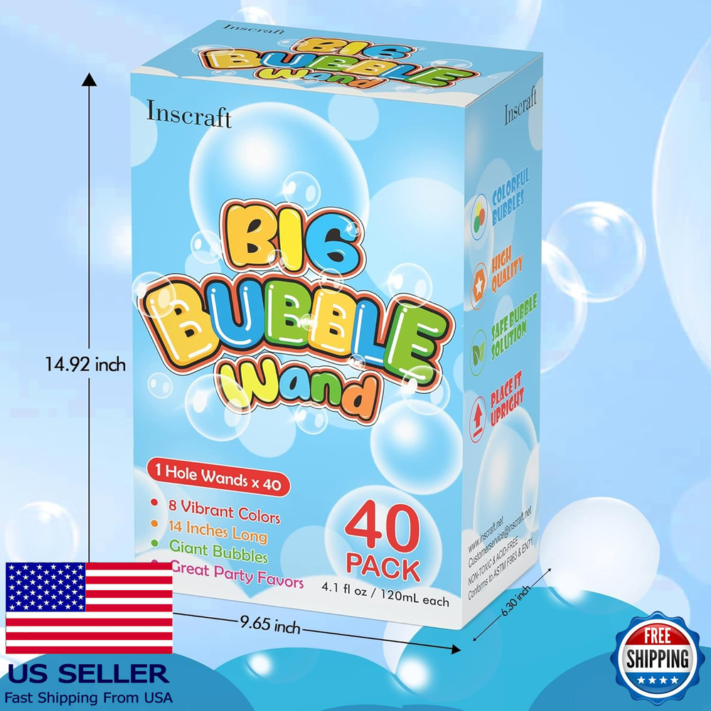 40 Pack 14’’ Big Bubble Wands, 8 Colors Bubbles Bulk for Summer Toy, Outdoor / Indoor Activity Use, Easter, Birthday, Graduation, Shower, Bubbles Party Favors Supplies for Kids Toddlers Description Enjoy endless fun with our 40 pack of 14-inch Big Bubble Wands! Available in a vibrant assortment of 8 colors, these wands are the perfect addition to any summer toy collection, outdoor or indoor activity. Great for Easter, birthdays, graduations, or showers, they also make ideal party favor supplies for kids and toddlers. Make any occasion bubbly and bright with our Big Bubble Wands! Features pack of 14-inch Big Bubble Wands Available in a vibrant assortment of 8 colors Suitable for both outdoor and indoor activities Ideal for occasions such as Easter, birthdays, graduations, or showers Perfect as party favor supplies for kids and toddlers Shipping Free & Fast Shipping: We offer free shipping to most of the USA with a normal delivery time of 3-7 days. However, due to the current situation, additional delivery time (up to 3 weeks) may be required for some items. Alternative Carriers: We may use alternative carriers (e.g., USPS, FedEx, UPS) to ensure your package arrives safely and on time. Due to the use of multiple carriers, we are unable to provide a tracking number automatically. Handling Time: Orders are processed and shipped within 1-2 business days of receiving cleared payment. Shipping Restrictions: Shipping to Alaska, Hawaii, Puerto Rico, Guam, and other US territories may incur shipping charges or delivery restrictions. Please contact us before ordering, or your order can be refunded/cancelled. State Restrictions: Certain items may not be shipped to California due to state regulations. Contact for Tracking Updates: If you require tracking updates or have any concerns about the delivery of your order, please feel free to contact us, and we will be happy to assist you. Return Policy 30-Day Hassle-Free Returns: If you are not completely satisfied with your purchase, you can return the item for free within 30 days of receiving it for a full refund or exchange. Easy Return Process: Contact us, and we will provide you with a prepaid return shipping label and detailed instructions. No Restocking Fee: There are no restocking fees for returns. However, the buyer is responsible for return shipping costs if the return is not due to a seller's error. Refund Processing: Refunds will be processed within 1 business day of receiving the returned item in its original condition. Payment We accept all major credit cards, PayPal, and Pay for your convenience. Your payment information is secure and encrypted to ensure a safe and seamless transaction. Please complete your payment within 3 days of purchase to avoid any delays in shipping. Feedback Your feedback is extremely important to us. We strive to provide the best products and customer service possible. If you are satisfied with your purchase, please take a moment to leave us a positive review. If you have any concerns or issues with your order, please contact us before leaving negative feedback. We are committed to resolving any problems and ensuring your satisfaction. Contact Us If you have any questions or concerns, please feel free to reach out to our customer support team. You can contact us through the eBay messaging system. We are available Monday to Friday, 9:00 am to 5:00 pm EST, and we will do our best to respond to your inquiry within 24 hours. Thank you for supporting our small family business!