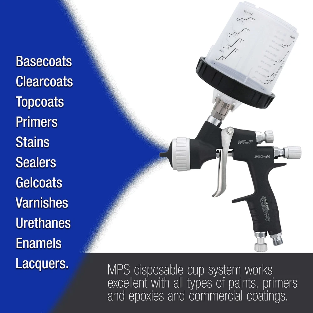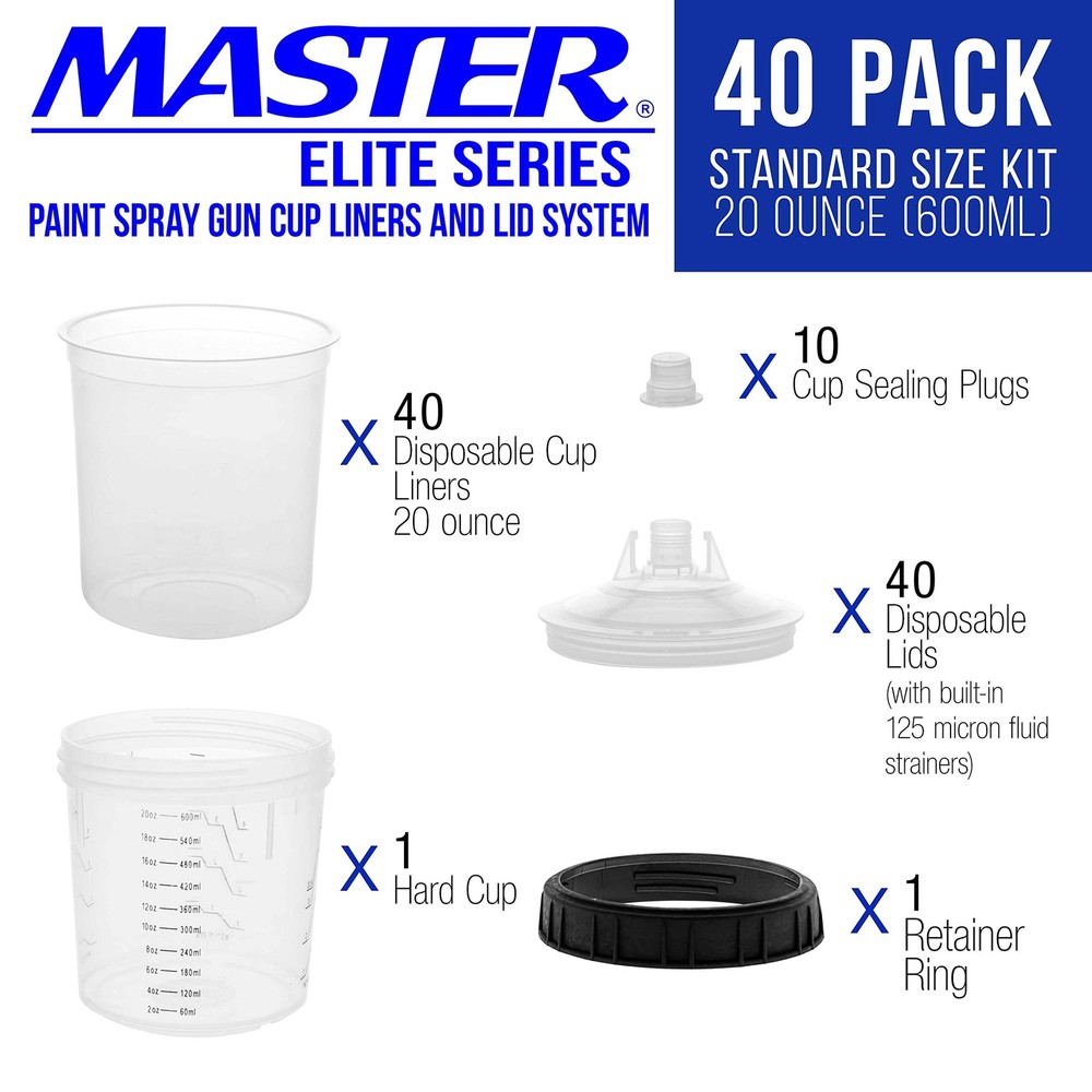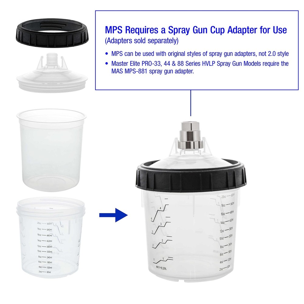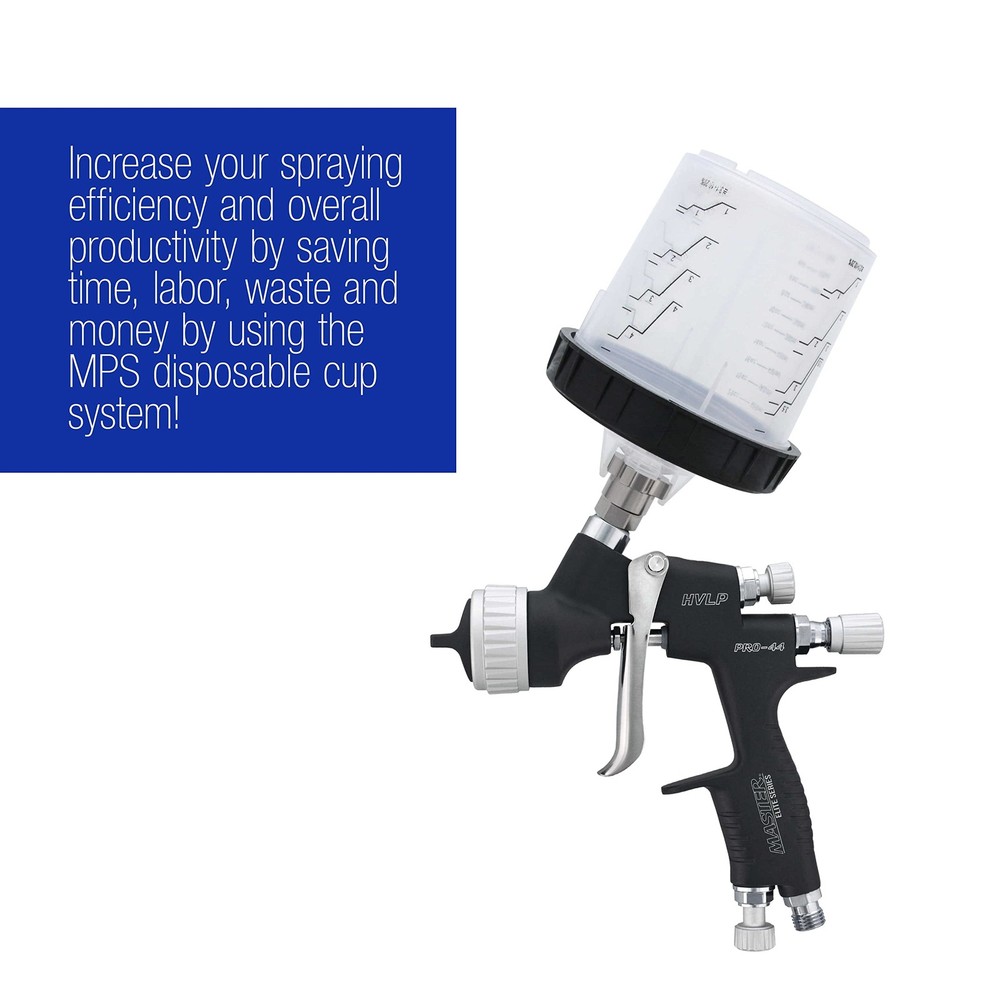 Master Paint System MPS Disposable Paint Spray Gun Liners and Lid System, 40 Pack Standard Size 20 Ounce (600ml) Kit - 40 Liners, 40 Lids with Strainer, 1 Hard Cup with Retainer Ring, 10 Plugs MPS Master Paint System Disposable Paint Spray Gun Cup Liners and Lid System, 40 Pack Standard Size 20 ounce (600ml) Kit. Kit includes 40 cup liners with a 20 ounce (600ml) fluid capacity, 40 lids with built-in 125-micron fluid strainers, 1 hard cup with retainer ring and 10 cup sealing plugs. The MPS disposable spray gun cup system's outer hard cup connectors are compatible to work with, and twist-lock onto original styles of spray gun adapters, not 2.0 style. The proper adapter will allow you to use the MPS disposable cup system with almost any brand of spray guns. Master Elite Series PRO-33, PRO-44 & PRO-88 HVLP Spray Gun Models require the MAS MPS-881 spray gun adapter. Master Spray Guns, MPS disposable cup system works excellent with all types of paints, primers, epoxies, and commercial coatings. Use the cup system with automotive paint basecoats, clearcoats, topcoats and primers, as well as with stains, sealers, gel coats, varnishes, urethanes, enamels, and lacquers. Dramatically increase your spraying efficiency and overall productivity by saving time, labor, waste, and money by using the MPS disposable cup system! Reduce your paint material waste and cleaning solvent waste, while at the same time eliminating the cost and labor associated with cleaning traditional metal gun cups and the need for mixing cups and paint cans Everything you need to achieve incredibly fast and professional paint finishing results. All components of the professional MPS disposable cup systems are available both individually and in sets and kits. Eight versions of MPS spray gun cup adapters are available separately, allowing you to use the MPS cup system with most major brands of spray guns and types from full size to mini detail guns Shipping We offer FREE shipping on all orders! We ship within Three business days of payment, usually sooner. We use a selection of shipping services such as UPS, FedEx, USPS etc. We only ship to the lower 48 states, no APO/FPO addresses or PO Boxes allowed. Local pickups and combined shipping options are not provided at this time. Return You can return a product for up to 30 days from the date you purchased it. Any product you return must be in the same condition you received it and in the original packaging. Please keep the receipt. Payment We accept payment by any of the following methods: PayPal Please pay as soon as possible after winning an auction, as that will allow us to post your item to you sooner! Feedback Customer satisfaction is very important to us. If you have any problem with your order, please contact us and we will do our best to make you satisfied. Contact Us If you have any queries, please contact us via ebay. We usually respond within 24 hours on weekdays. Please visit our eBay store to check out other items for sale! Thank you for shopping at our store.