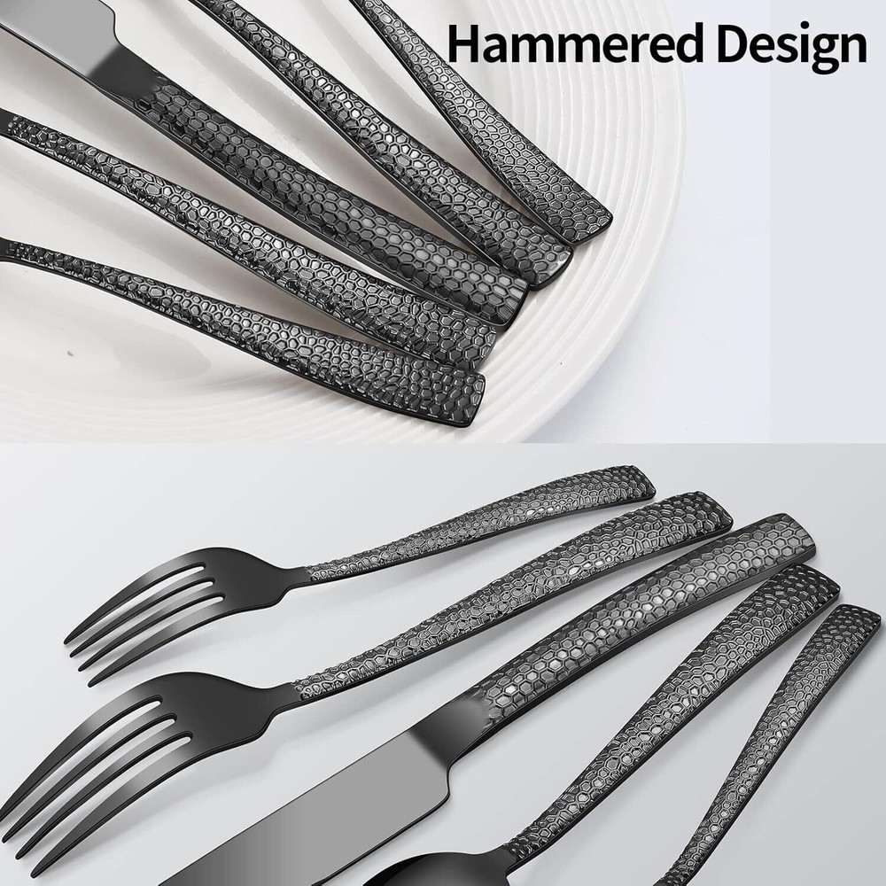 Number of Pieces 40 Material Stainless Steel Color Black Product Care Instructions Dishwasher Safe Recommended Uses For Product Hand washing Special Feature Dishwasher Safe Finish Type Polished Included Components Forks, Salad forks, Table knife, Spoons, Teaspoons Is Stain Resistant Yes See less About this item 【Hammered 40-Piece Silverware Set】This silverware set includes 8 dinner knives, 8 dinner forks, 8 salad forks, 8 dinner spoons and 8 dessert spoons, perfect for everyday use at home and for entertaining guests 【Exquisite Craftsmanship】The square handle has a stylish hammering design, comfortable to the touch, extra thick handle, excellent texture, can ensure decades of shine, it can match any tableware you own, make your table look more stunning 【High Quality Material】Made of high quality 18/0 food grade stainless steel to ensure sturdy, with good rust and corrosion resistance, ensuring the safety and health of your family 【Perfect for Use】This set is ideal for family daily use, parties, gatherings, family dinners, candlelight dinner, banquet, Thanksgiving, BBQ, wedding and other formal occasions. Number of Pieces 40 Material Stainless Steel Color Black Product Care Instructions Dishwasher Safe Recommended Uses For Product Hand washing Special Feature Dishwasher Safe Finish Type Polished Included Components Forks, Salad forks, Table knife, Spoons, Teaspoons Is Stain Resistant Yes Is Dishwasher Safe Yes UPC 788567186794 Manufacturer Remoxye Package Dimensions 10.87 x 5.91 x 2.01 inches Item Weight 6.58 pounds