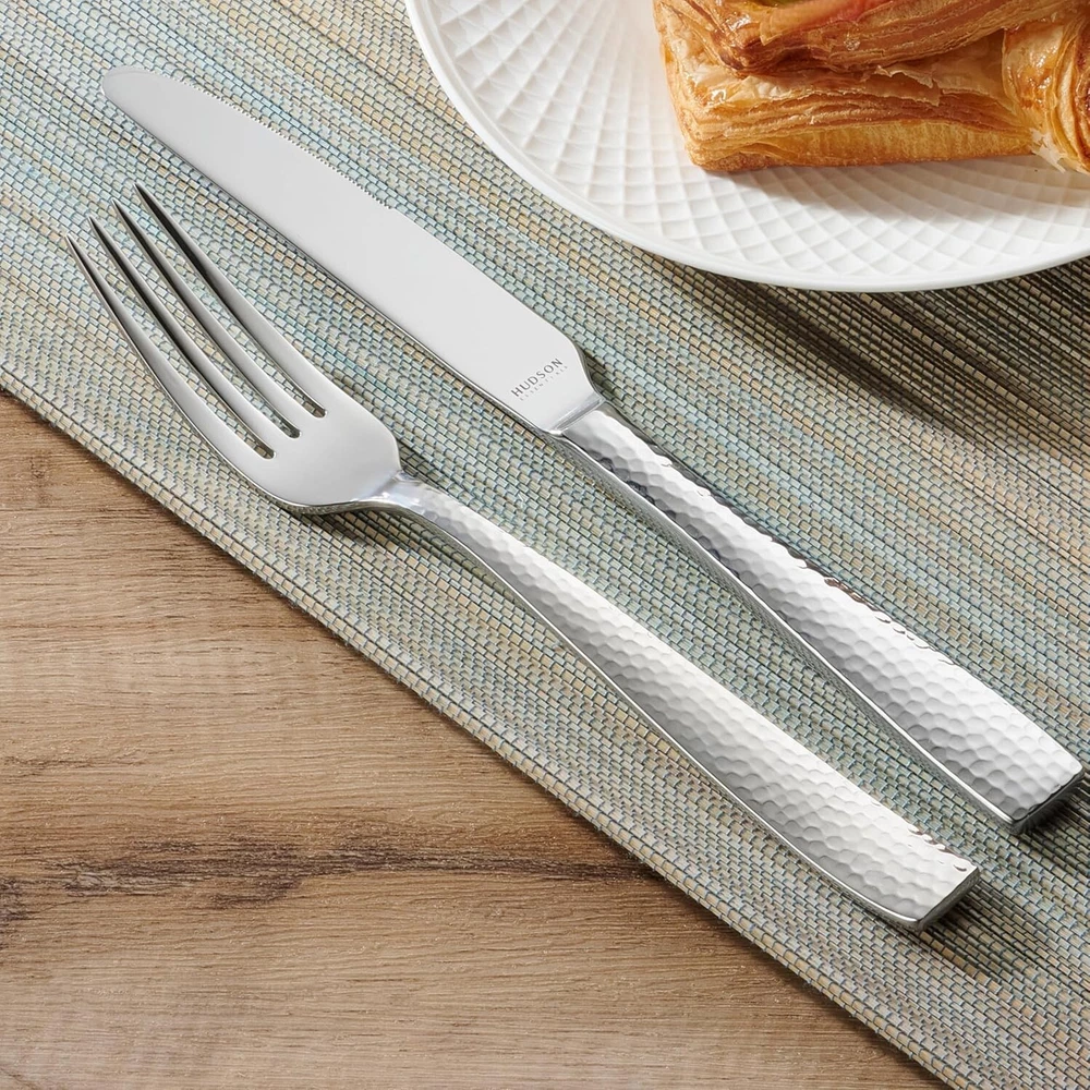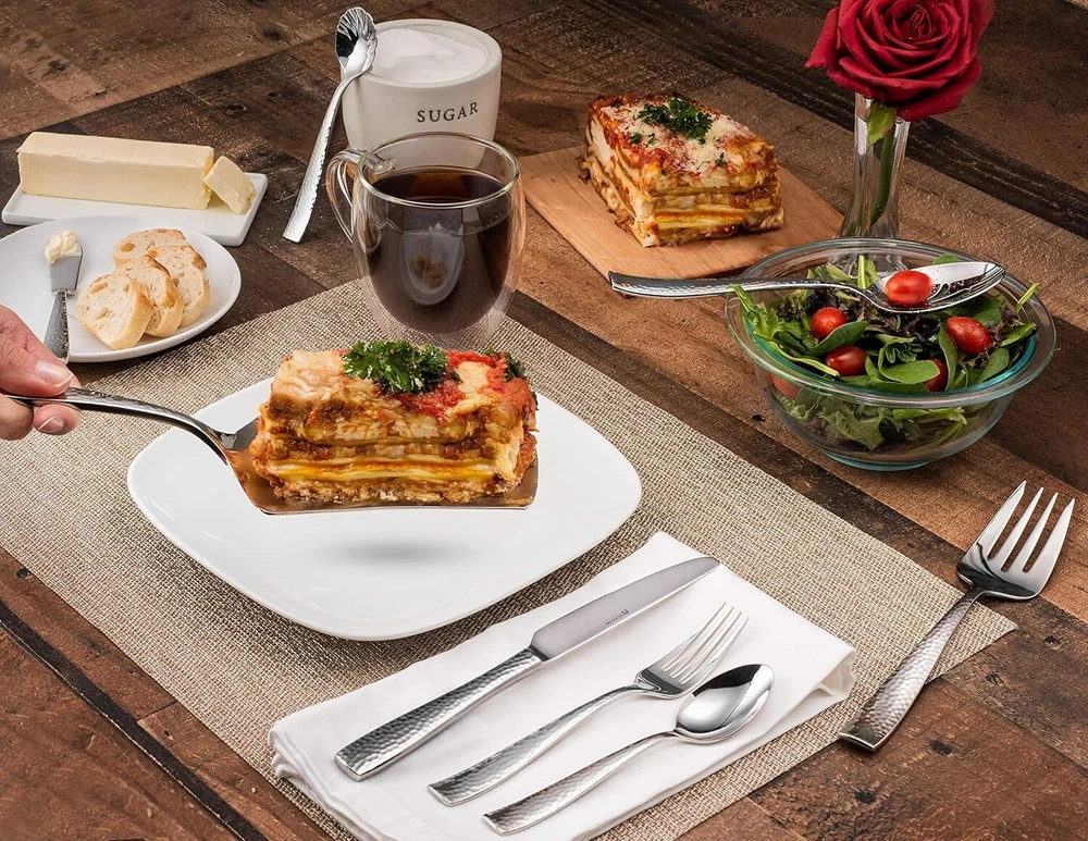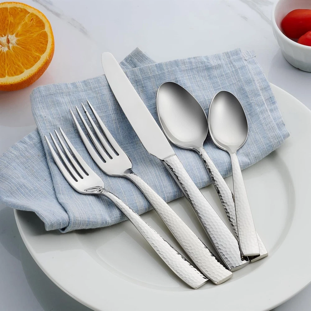 40-Piece Hammered Stainless Steel 18/10 Flatware Silverware Set, Service for 8 40-Piece Set Hammered 40-piece flatware set, service for 8: includes 8 dinner knives, 8 dinner forks, 8 salad forks, 8 dinner spoons, and 8 teaspoons Made from the finest food-grade 18/10 stainless steel, your cutlery set will last a and ensure decades of luster The handles are beautifully hammered with a smooth mirror finish to create an elegant and striking appearance, perfect for any occasion Featuring classic curves, heavy-weight heft and exceptional balance. The handles are smooth, tactile and comfortable, making each utensil a pleasure to hold. Made To Last a