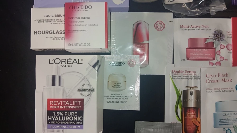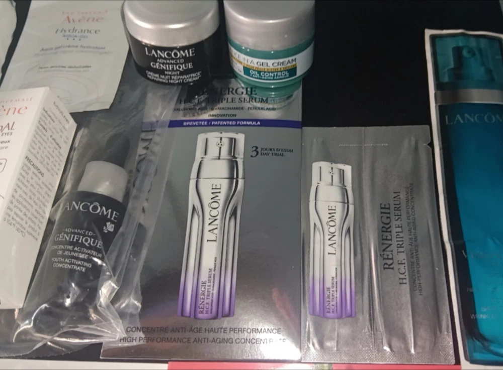 Large ulta beauty high end skincare lot for signs of aging & wrinkles (face &eyes) Everything shown in pictures is what you get Florence 3 pack brightening under eye gel patches Equilibrium hourglass eye balm Facial lifting massager tool Avené 3 piece 2 travel 1 sample size set Eau Thermale spring water Retinol serum Hudrance agua gel L'Oréal revitalift IT cosmetics eye balm travel size Dermatologicat 2 piece travel and sample size set Retinol serum Circular hydration serum Clarins 5 piece sample & Travel Size set Cryo flash cream mask sample size Double serum sample size Multi active nuit sample size Total eye lift sample size Multi active jour day cream travel size Shiseido 3 piece 1 travel size & 2 sample set Travel Size hydrating cream Benefiance wrinkle smoothing eye cream sample size Ultimune power infusing concentrate sample size Lancôme 5 piece 2 travel & 3 sample size set ×2 HCF triple serum sample size Advanced genifique serum travel size night creme Advanced genifique serum travel size serum Tonique facial toner sample size Clinique drastically different moisturizing lotion & hydrating clearing jelly 2 part samples (17 pouches) Purple pouch is for fine lines & wrinkles Blue pouch is for pores & uneven texture Red & blue pouch is for blemishes & imperfections Includes coach gift bag