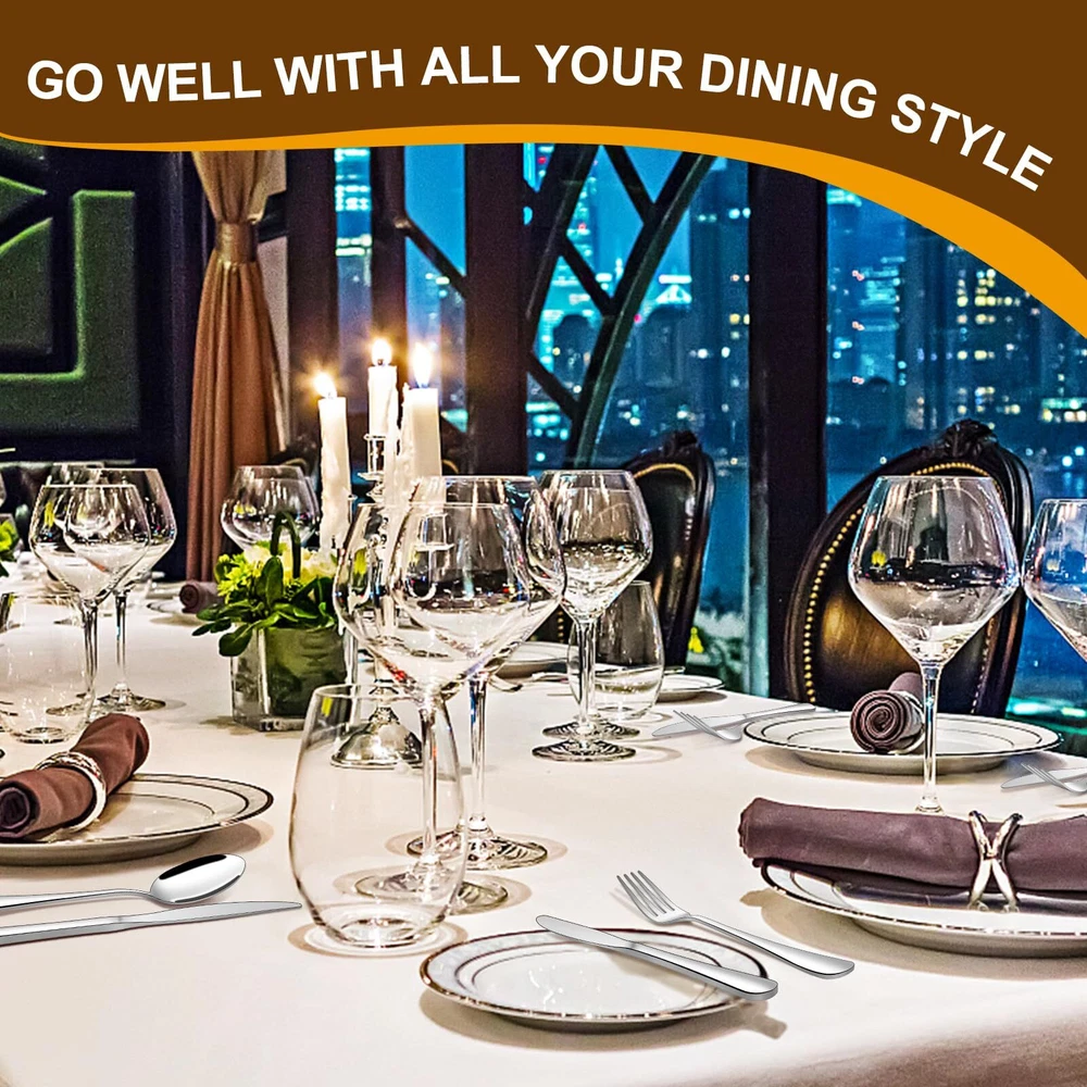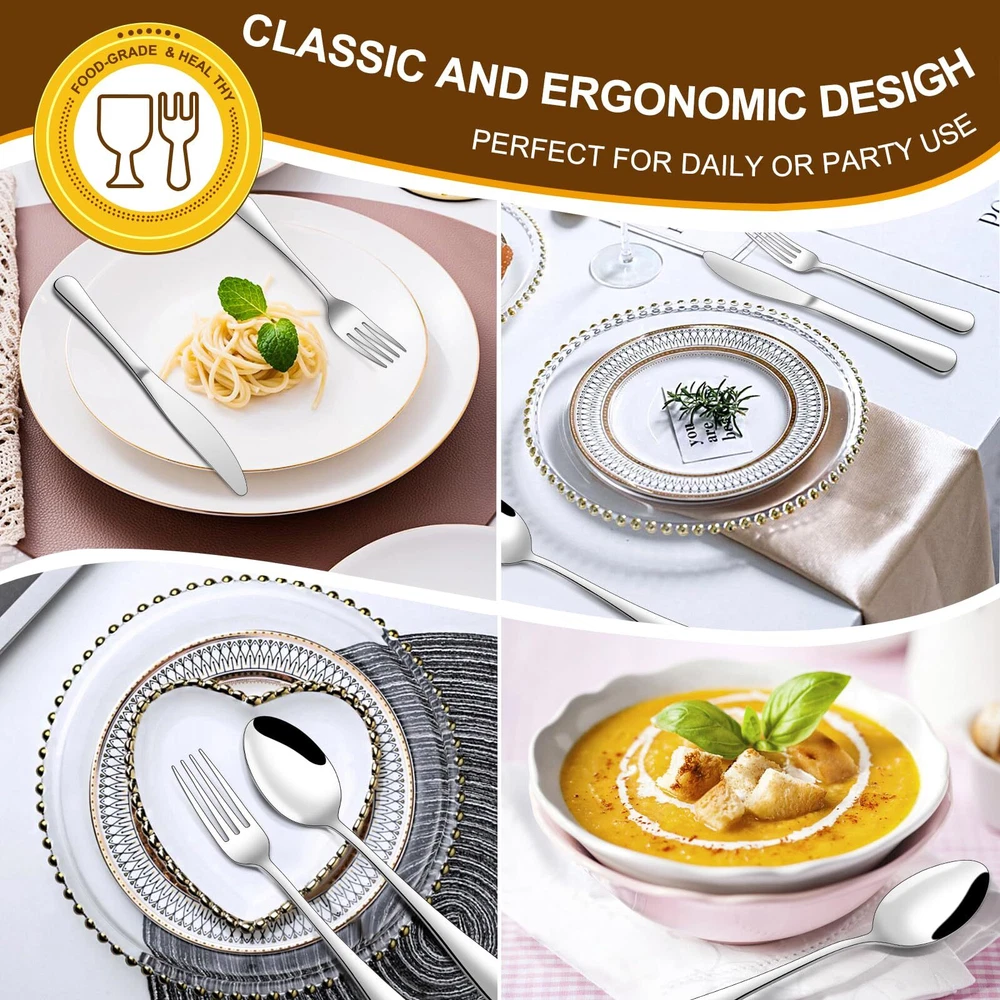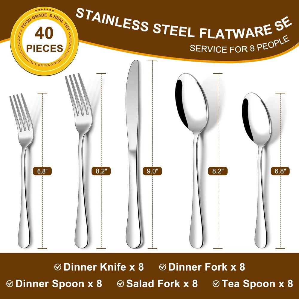 πππππππ 40-πππππ ππππππππππ πππ π ππ 8: This flatware set contains 8 dinner forks, 8 salad forks, 8 dinner spoons, 8 dessert spoons, 8 dinner knives. Itβs the ideal set for home daily use, and also for restaurants, pubs, cafes, and hotels. This cutlery set also help your dinner full of design while having a party. πππ πππ πππππππππππ: Recommend hand wash first, storage them after drying. Wire brush, hard sponge, cleaning cloth or any other hard material are not recommend , it will damage the silver. ππππππ ππππππ πππ ππππ πππππππ ππππππ: Unlike other brands, the curvature of our utensil handles is designed according to the posture of the hand, and the appropriate weight and perfect balance are added to ensure maximum comfort during use that avoids you feel tired. Moreover, the smooth edges ensure safety and no scratches. ππππ πππππππ ππππππ: This flatware set has a classic silhouette with clean lines and polish-finish surface in all silver, a good choice to go with your existing tableware. The smooth edge of the handle is pleasure to hold, appropriate weight and perfect balance are added to ensure maximum comfort during use. ππππ-πππππππ πππππππππ πππππ: Made of premium food-grade stainless steel, providing the longest term value and the best properties, it offers nice resistance to rust and corrosion to get the most sturdy and healthy experience while using, never bend in daily use.