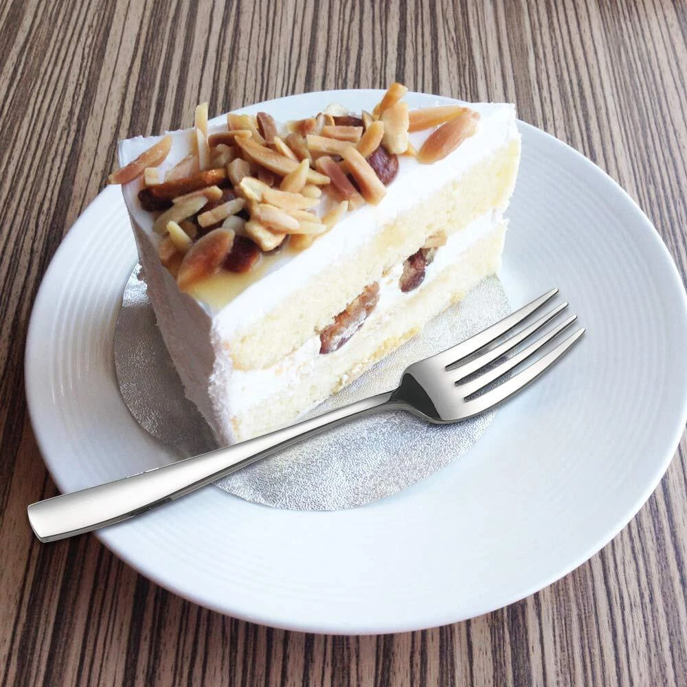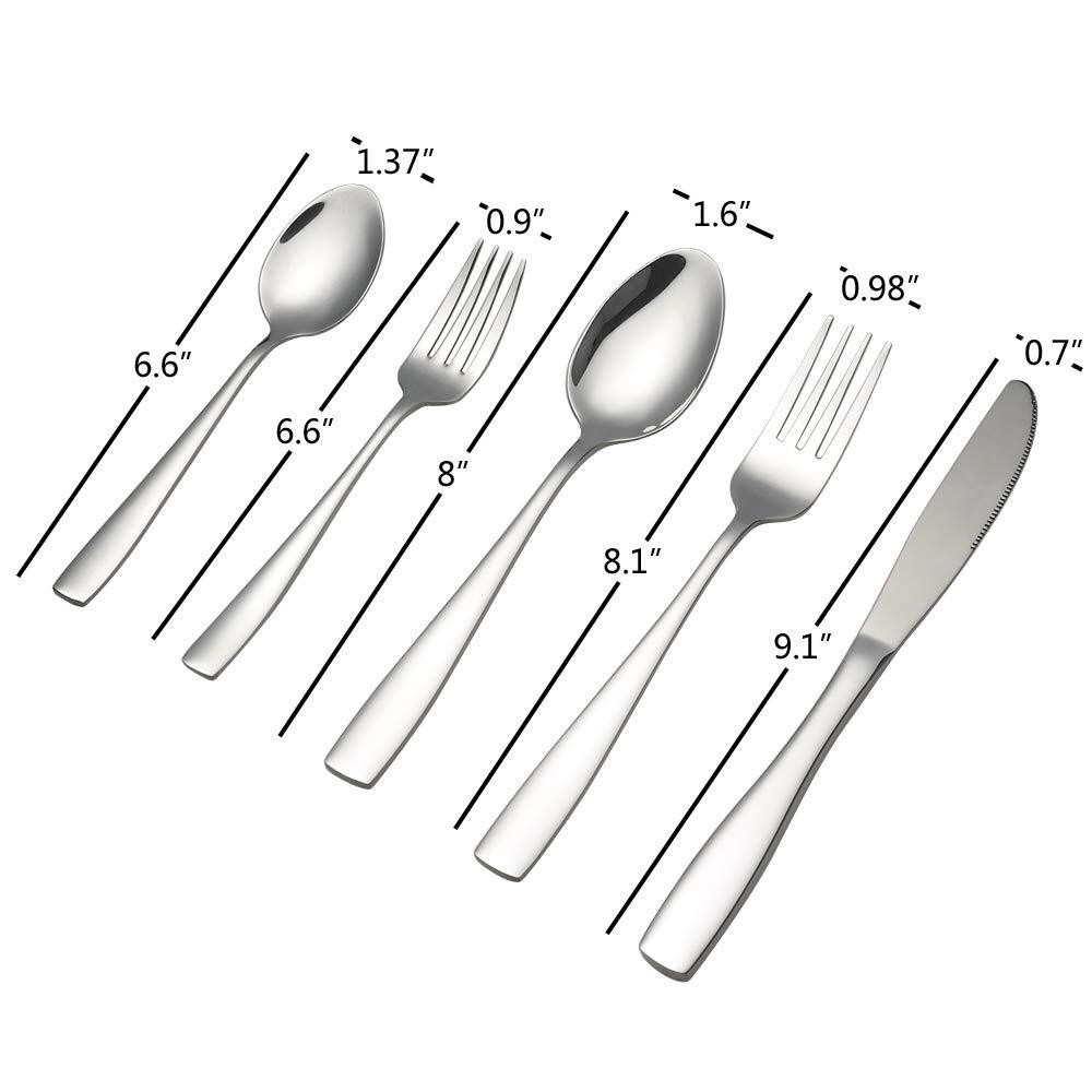 Totally 40 pieces a set, 8 dessert forks + 8 dessert spoons + 8 dinner knives + 8 dinner forks + 8 dinner spoons Made from high quality stainless steel Dessert spoon: 6.6"L x 1.37"W; dessert fork: 6.6"L x 0.9"W; dinner knives: 9.1"L x 0.7"W; dinner spoons: 8"L x 1.6"W; dinner fork: 8.1"L x 0.98"W Applicable occasions: home, kitchen, restaurant Easy to clean, reusable, durable
