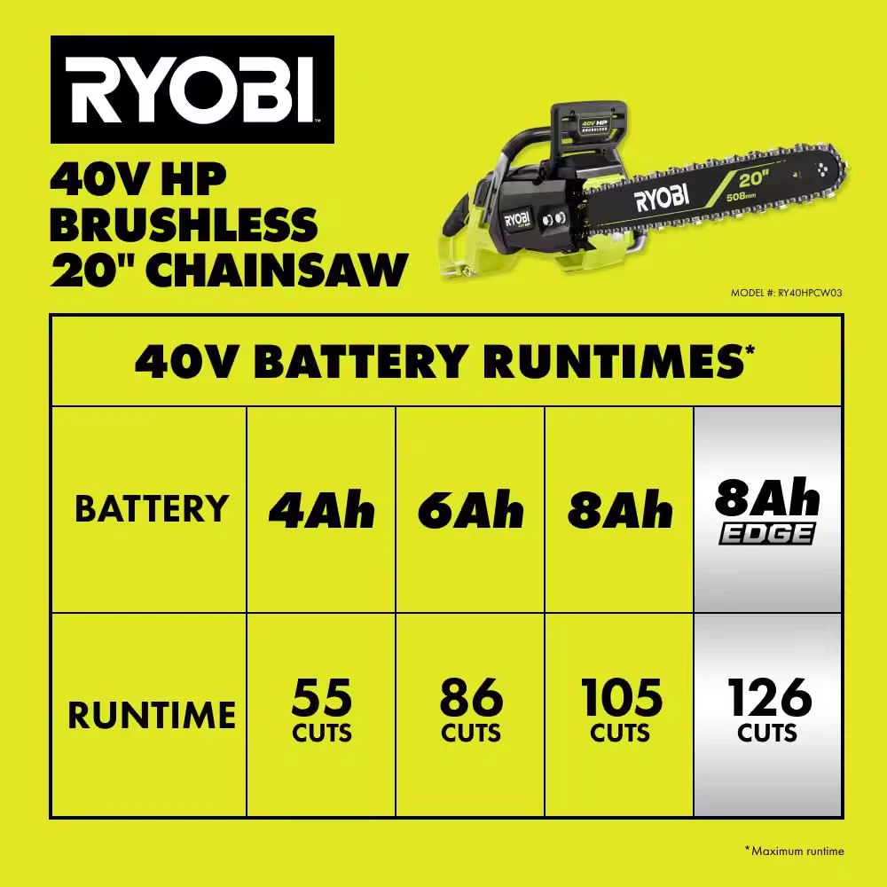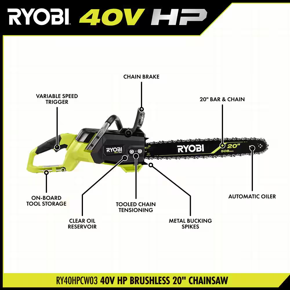 Fast Shipping On All Items 30 Days Money Guarantee Customer Support Excellent Service 100% Satisfaction Satisfaction Guaranteed 40V HP Brushless 20 In. Battery Cordless Electric Chainsaw (Tool Only) Specification Battery Amp Hours No Battery Battery Power Type Lithium Ion Battery Size Battery Not Included Battery Voltage (V) 40V Battery/Charger Tool Only Chain Pitch 3/8 in. Chain Speed (mps) 24.50 Chainsaw Bar Size Large Chainsaw Type Hand Chainsaw Charger Included Charger Not Included Color Family Green Condition New Drive Links 70 Features Automatic Chain Oiler,Brushless Motor,Chain Brake,Chain Catcher,Portable,Variable Speed Filter Type No Filter Gauge .050 Handle Type Rear Handle Chainsaw Included Case,Chain,Scabbard,Scrench/Combination Wrench Number of Total Batteries Included 0 Outdoor Power Combo No Additional Tools Power Type Battery Product Weight (lb) 13.1 lb Refurbished No Returnable 90-Day Tools Included Chainsaw Torque Maximum (Nm) 0 Certifications and Listings TUV Listed Manufacturer Warranty 5-year limited tool warranty Bar Length (in) 20 in. Chain Size 20 in. Maximum Cut Diameter (in) 36 in 20.0 inches. Weight: 13.1 lb Item Description 40V HP Technology Delivers More Power Than a 52cc Gas Chainsaw Over 100 Cuts Per Charge Using a 40V 8Ah Battery Over 85 RYOBI 40V Products – All Work With Any RYOBI 40V Battery The RYOBI 40V HP Brushless 20" Chainsaw delivers more power than a 52cc gas chainsaw, making it a true gas replacement without the hassle or maintenance. 40V HP Technology combines a powerful brushless motor, advanced electronics, and high performance lithium technology to provide more power, runtime, and durability to tackle the toughest jobs. With over 100 cuts per charge, the saw delivers longer runtime and faster cutting. The 20" bar and chain tackles cuts up to 36", making it ideal for the most demanding felling, bucking, and limbing applications. Using the combination wrench conveniently stored on the tool & the captive bar studs, precisely adjust the chain to the desired tension. This chainsaw has an automatic oiler to keep the chain lubricated for longer chain life and a variable speed trigger for maximum control during any application. While both offer additional kickback protection, the metal bucking spikes provide stability through cuts & the mechanical chain brake will automatically stop the chain when it's engaged. Best of all, it is part of the RYOBI 40V system where any 40V battery works with any 40V product. This 40V HP Brushless 20" Chainsaw is backed by the RYOBI 5 Year Manufacturer's Tool Warranty and includes RY40HPCW03 40V HP Brushless 20" Chainsaw, Scabbard, Combination Wrench, & Operator's Manual. About us We offer the best prices around on high quality products. Our E-store includes media such as books, movies, music and games while offering electronics, toys, sporting apparel, clothing, tools, general home, garden items and more. Shipping We are always working hard to ensure your package arrives as soon as possible. Please understand that some factors like weather, high postal traffic, and the performance of shipping companies are outside of our control. We offer free shipping to the lower 48 states and ship within 2-3 business days of payment, usually sooner. We do not accept P.O. Boxes. Please provide a physical address. For shipping outside of the continental USA, we only use eBay's Global Shipping Program.The item is shipped to KY and then sent to the rest of the world. International customers are responsible for all duties and taxes. Continue to check out to calculate costs for shipping the item to your country. Messages regarding eBay's Global Shipping Program MUST be directed at eBay EXCLUSIVELY. Returns We offer a 30-Day Return Policy on items in which you are not completely satisfied with. You have the option of a full-refund or an exchange of the item. No returns are available on items shipped outside of the USA Satisfaction We try over very best to make sure every customer is completely satisfied. If there's a problem, message us! We're happy to help. Payment Options Shop With Confidence