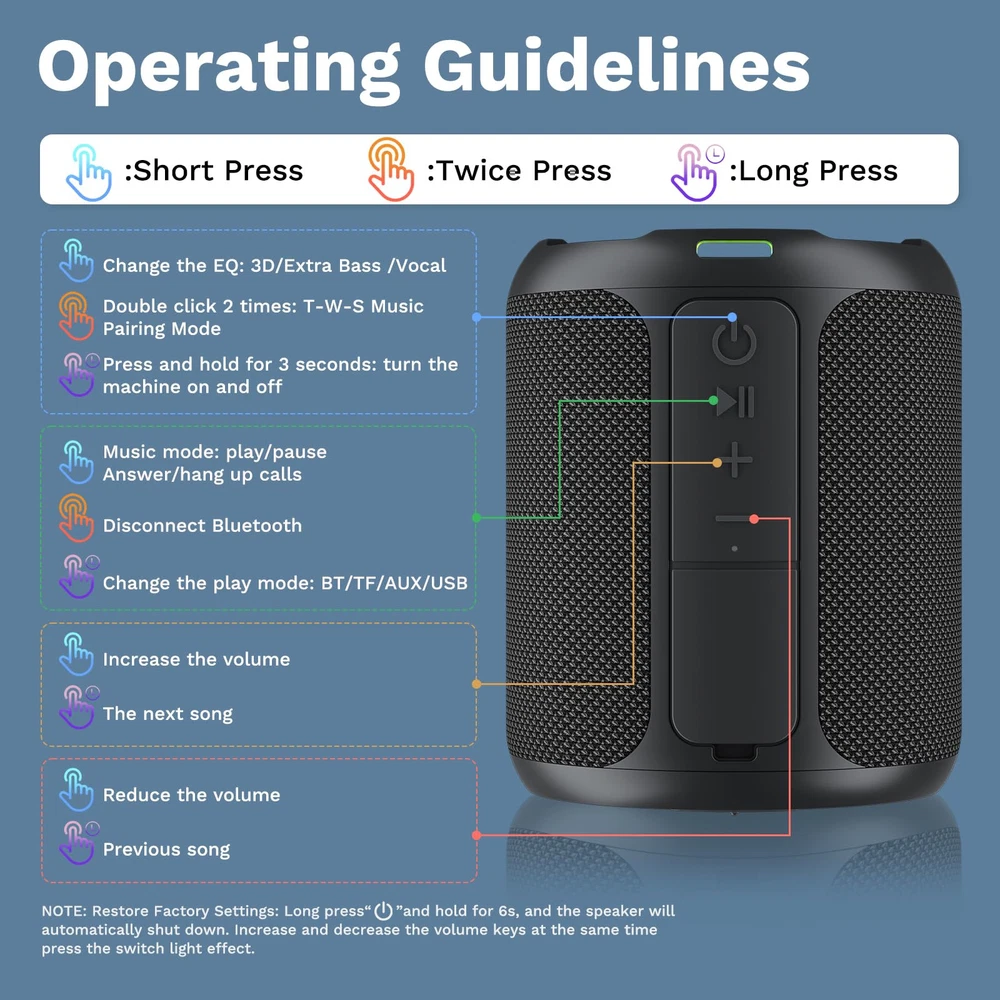 [RGB Colorful Light Effects] Get the party going with crystal-clear sound and vibrant, multi-color flashing lights. The speaker’s dual circular breathing lights automatically change colors in sync with the music, creating an immersive blend of sound and visuals. Want more control? Simply press the volume up and down buttons at the same time to turn the lighting effects on or off. [Stereo surround sound & TWS Pairing Function] Experience high-powered audio with 40W portable wireless Bluetooth speaker.An advanced Digital Signal Processor ensures pounding bass and zero distortion at any volumeny volume.By linking two speakers simultaneously,supporting high-quality wireless music playback with ultra-low latency of nearly 0.3 seconds, making it perfect for home party, music playback, playing games, and watching movie. [Rugged & Waterproof] Built for the outdoors, this speaker boasts a tough, shockproof design and an IPX7 rating, providing full protection against water immersion and harsh environments. Whether you're hosting a party, relaxing by the pool, hitting the beach, or embarking on a camping adventure, this speaker is ready to deliver exceptional sound no matter where you go. [Up to 18 Hours Playtime & Bluetooth 5.3] This rechargeable portable Bluetooth speaker provides an exceptional 18 hours of playback time, allowing for extended enjoyment of your leisure activities. It can be fully recharged in just 4 hours using the included USB-C charging cable. With Bluetooth 5.3 technology, it offers an extended wireless range of up to 10 meters from your device. Please be advised that actual playtime may vary depending on volume levels, audio content, and usage conditions. [Portable Design] speaker’s 1.59 pounds weight signifies the use of high-grade materials, it delivers superior high-pitched tones, deep bass, and stable midrange. The zero-distortion sound ensures a stunning and loud stereo immersive music experience. the speaker strikes the perfect balance between portability and high performance.Meanwhile,it is equipped with multiple connectivity options, including Bluetooth wireless, AUX input, USB drives, and TF cards, making it a versatile audio companion compatible with a wide range of devices. It is the perfect gift for music enthusiasts, party lovers, and outdoor enthusiasts.