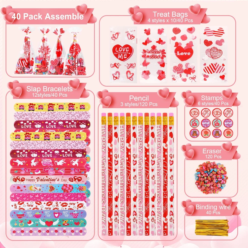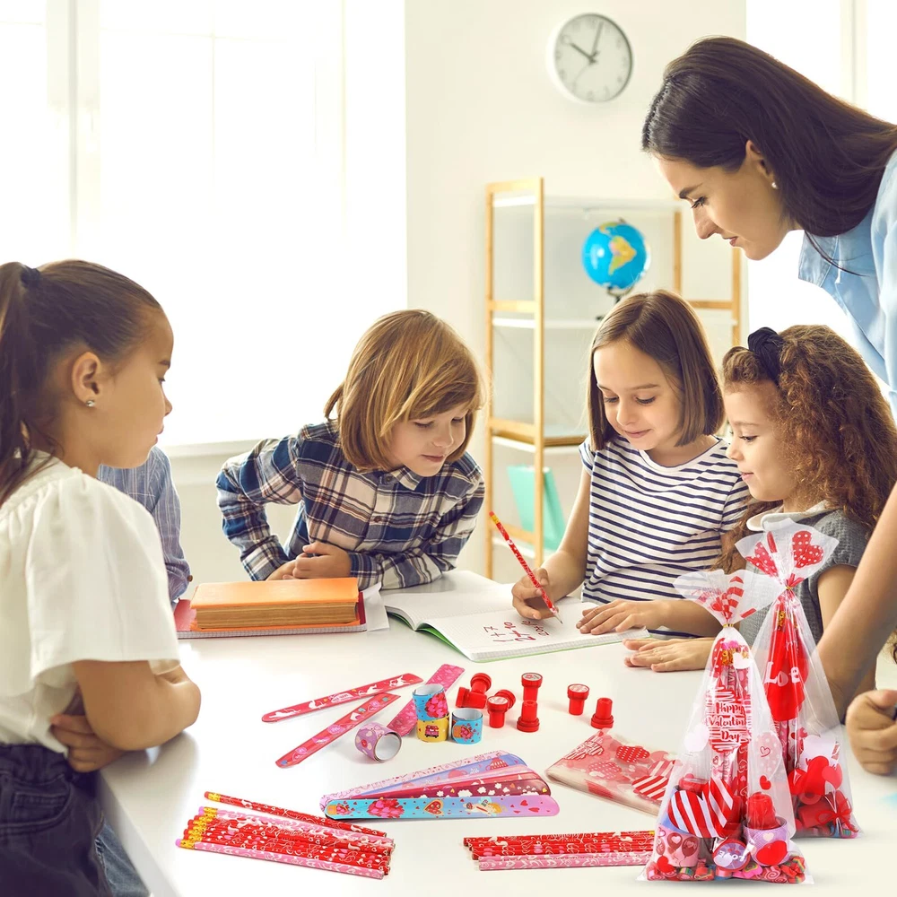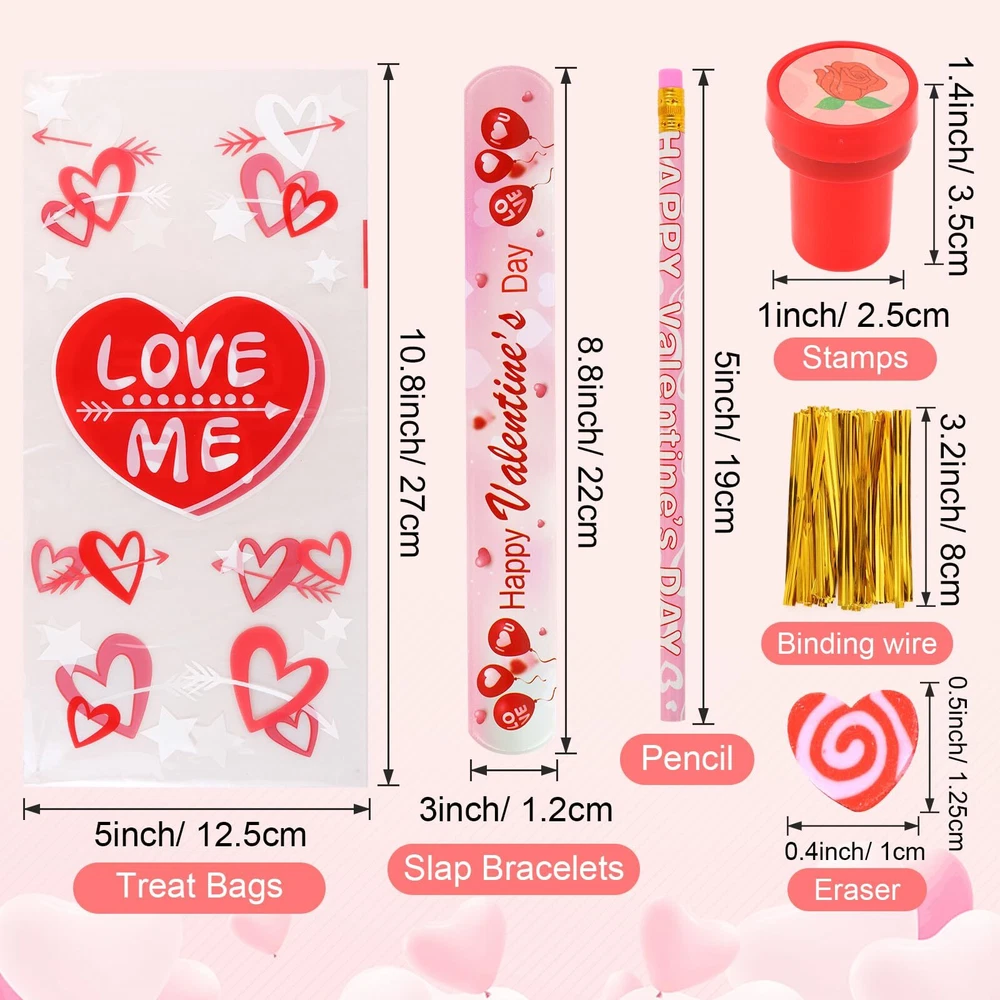 Enough quantity: the Valentine's Day stationery set includes 120 Valentine pencils, 120 mini erasers, 40 slap bracelets, 40 gift bags with 40 twist ties and 40 Valentine stamps, a total of 360 pieces, sufficient quantities for your Valentine party decorations needs Valentine design: Valentine stationery party favor set are filled with eye catching Valentine elements, such as red heart, Valentine's Rose,lovely cake and more,as a Valentine gift ,a good choice for party bags for girls and boys,which will give you more choose, add more fun to you in the festival and daily life Pencils and erasers: the Valentine pencils are made of quality graphite with smooth writing, which is durable and not easy to break, approx. 7.5 inches unsharpened , easy to carry and store;Christmas series eraser are made of soft TPR material, safe for kids,the size of each pencil eraser is about 0.39-0.59 inches, and the thickness is 0.24 inches, mini size is perfect for putting them in pencil case or collectible tins Treat bags stamps and slap bracelets set:our bag is 5 inch in width and 10.8 inch in length, made of OPP, good quality and durable,designed in 4 different styles; our Valentine stamps come in 20 different designs,and they are printed in Valentine red colors,made of plastic, lightweight and lasting, the inks are safe and nontoxic;slap bracelets are 20 different styles,measure approx. 22 x 3 cm/ 8.8 x 1.2 inches in diameter and width, has nice elasticity, comfortable but sturdy Wide application:you can use them for gift bags for a classroom, for Valentine gift, Valentine prize, stocking filler or party favors,also can be given to your students as a class reward; The classic Valentine colors and elements will add Valentine atmosphere.The Valentine set also can be applied as cute and interesting gifts for your friends, families, classmates, guests and more, allowing them to have a funny and good time together.Recommended for ages 12 and above Enough quantity: the Valentine's Day stationery set includes 120 Valentine pencils, 120 mini erasers, 40 slap bracelets, 40 gift bags with 40 twist ties and 40 Valentine stamps, a total of 360 pieces, sufficient quantities for your Valentine party decorations needs Valentine design: Valentine stationery party favor set are filled with eye catching Valentine elements, such as red heart, Valentine's Rose,lovely cake and more,as a Valentine gift ,a good choice for party bags for girls and boys,which will give you more choose, add more fun to you in the festival and daily life Pencils and erasers: the Valentine pencils are made of quality graphite with smooth writing, which is durable and not easy to break, approx. 7.5 inches unsharpened , easy to carry and store;Christmas series eraser are made of soft TPR material, safe for kids,the size of each pencil eraser is about 0.39-0.59 inches, and the thickness is 0.24 inches, mini size is perfect for putting them in pencil case or collectible tins Treat bags stamps and slap bracelets set:our bag is 5 inch in width and 10.8 inch in length, made of OPP, good quality and durable,designed in 4 different styles; our Valentine stamps come in 20 different designs,and they are printed in Valentine red colors,made of plastic, lightweight and lasting, the inks are safe and nontoxic;slap bracelets are 20 different styles,measure approx. 22 x 3 cm/ 8.8 x 1.2 inches in diameter and width, has nice elasticity, comfortable but sturdy Wide application:you can use them for gift bags for a classroom, for Valentine gift, Valentine prize, stocking filler or party favors,also can be given to your students as a class reward; The classic Valentine colors and elements will add Valentine atmosphere.The Valentine set also can be applied as cute and interesting gifts for your friends, families, classmates, guests and more, allowing them to have a funny and good time together.Recommended for ages 12 and above