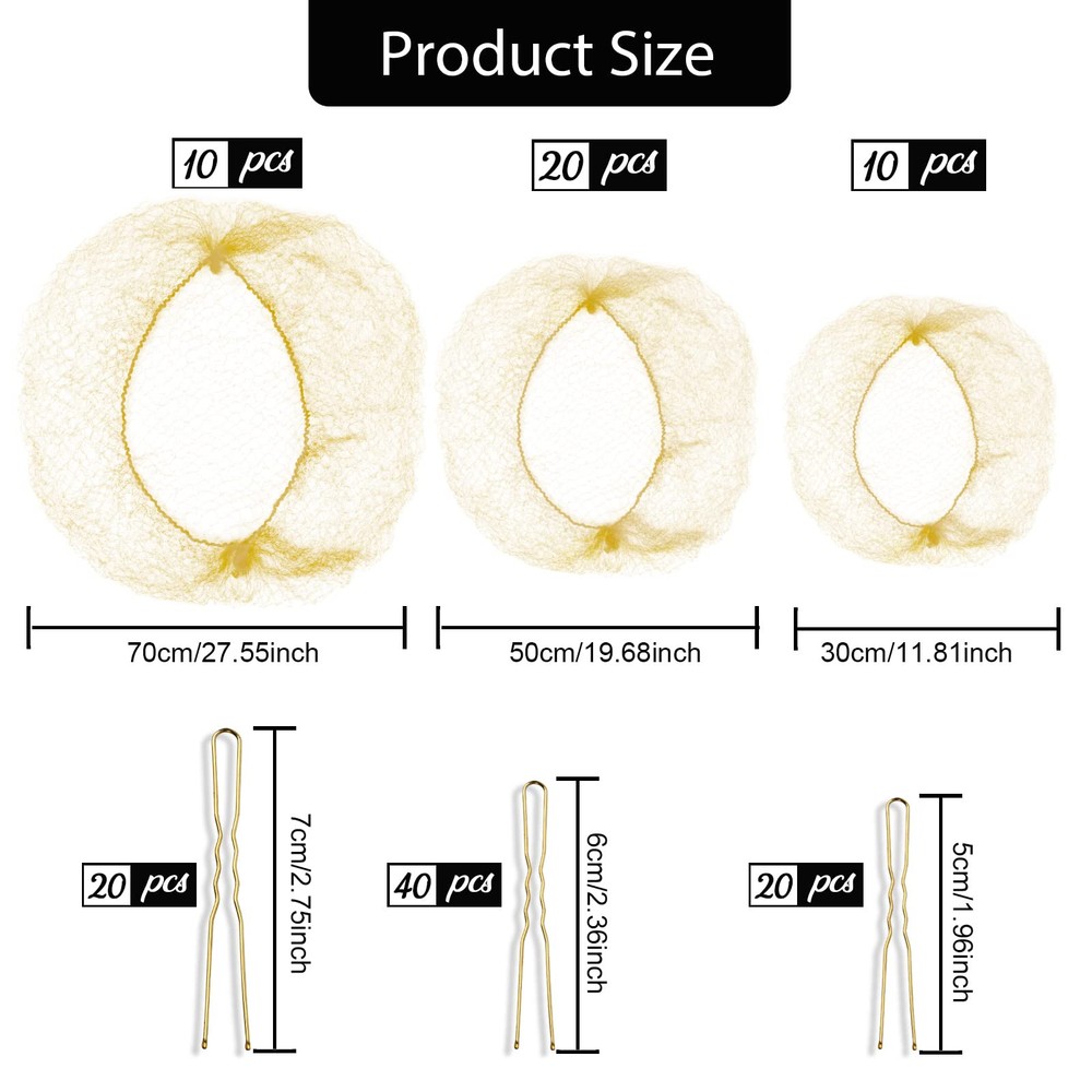 The package includes 40 elastic hair nets and 80 gold U-shaped pins to help create the neatest ballerina buns and hair nets. Say goodbye to messy buns and hello to sleek, elegant hairstyles Great for a variety of uses including workers who need their hair neatly styled, dancers, gymnasts, skaters, etc., or just anyone who likes their hair tied up nice and tight 3 sizes: Hair nets - 30cm/11.81inch - 10 pieces, 50cm/19.68inch - 20 pieces, 70cm/27.55inch - 10 pieces; U-shaped bun pins - 5cm/1.96inch - 20 pieces, 6cm/2.36inch - 40 pieces, 7cm/2.75inch - 20 pieces, suitable for short hair, medium hair, long hair, fine hair or coarse hair, meeting the needs of adults or children High Quality Hair Net: The hair net is made of fine spider silk, nylon elastic lace hand-woven, lightweight, strong and sturdy. Choose a color as close to your own hair color as possible, the fine hair net will almost disappear Hair Bobby Pins: These bun hair pins are made of high-quality metal, not easy to break and fade after long-term use. The hair clips also have a perfect grip. A good partner for hair buns; suitable for fixing hair when using hair bun maker