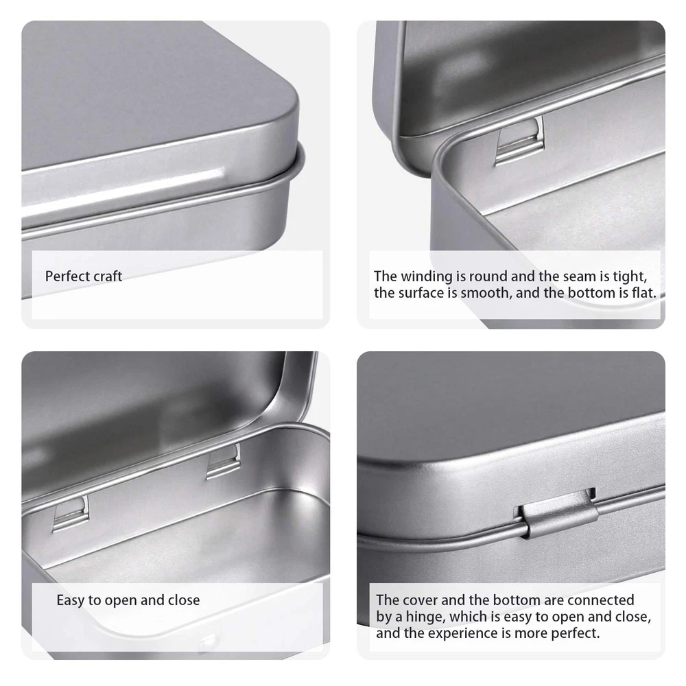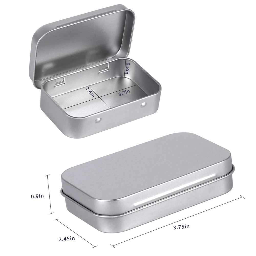 40pcs Metal Rectangular Empty Hinged Tin Box Container Mini Portable Small Rectangular tin can: these rectangular containers come with press-top lids and are made of good quality tin plated steel, can be applied for a long time. Exquisite & Smooth Design: The round edges are smooth without burs and are seamlessly, protect your hands from damage & eliminate any risk of leakage during travel. Size: the rectangular tin size 95 x 62 x 20 mm/ 3.75 x2.45 x 0.9 inch (L x W x H); Thickness is 0.23 mm; Good size box for secret stashes, you can use your own sense of style to decorate it Multi-function: these are metal tins that can be applied to store various tiny things, such as lip balms, lip gloss, mini candles, cosmetics, sample pots, herbs, nail art etc. Package includes: come with 40 pack silver metal rectangular empty hinged tins boxes; Lightweight and durable, easy to carry Metal Rectangular Empty Hinged Tins - Pack of 40 Silver Mini Portable Box Containers Small Storage Kit & Home Organizer Small tins with lids Craft containers 3-1/2''X2-1/2''X4/5'' Shipping We offer FREE shipping on all orders! We ship within Three business days of payment, usually sooner. We use a selection of shipping services such as UPS, FedEx, USPS etc. We only ship to the lower 48 states, no APO/FPO addresses or PO Boxes allowed. Local pickups and combined shipping options are not provided at this time. Return You can return a product for up to 30 days from the date you purchased it. Any product you return must be in the same condition you received it and in the original packaging. Please keep the receipt. Payment We accept payment by any of the following methods: PayPal Please pay as soon as possible after winning an auction, as that will allow us to post your item to you sooner! Feedback Customer satisfaction is very important to us. If you have any problem with your order, please contact us and we will do our best to make you satisfied. Contact Us If you have any queries, please contact us via ebay. We usually respond within 24 hours on weekdays. Please visit our eBay store to check out other items for sale! Thank you for shopping at our store.