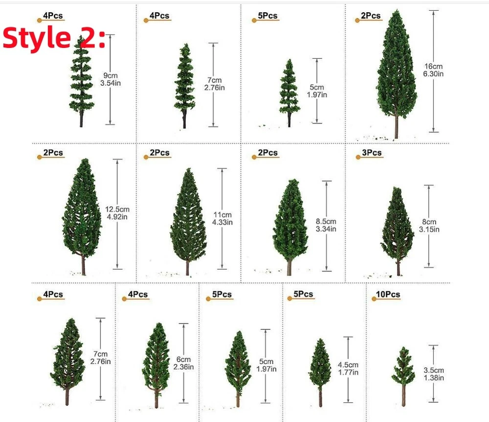 Note: this product has a foot post Specifications: Name: Sand Table Model Tree Color: dark green Material: plastic. Height: 5.5cm, 6.5cm, 8.5cm, 10cm and 12cm. Product ratio: 1/200, 1/150, 1/100, 1/75, 1/50. Use environment: architectural sand table model, psychological sand table model, train model and micro-landscape model. Package includes: 10PC*5.5cm 10PC*6.5cm 8PC*8.5cm 6PC*10cm 6PC*11.5cm Note: this product has a foot post Features: 🎄This model tree is a very useful prop for train tracks and building models. 🎄Use this pine tree model to make your layout or three-dimensional model more realistic. 🎄Perfect decoration of houses, desks, living rooms, kitchens, etc., which perfectly enhances the appearance of the model landscape. 🎄Material: Plastic and metal. Main color: dark green. 🎄Packing list: 40/48 model trees, suitable for DIY. The scenery looks more natural and suitable for your purpose. Specifications: Name: Sand Table Model Tree Color: dark green Material: plastic. Height: 5.5cm, 6.5cm, 8.5cm, 10cm and 12cm. Product ratio: 1/200, 1/150, 1/100, 1/75, 1/50. Use environment: architectural sand table model, psychological sand table model, train model and micro-landscape model. Package includes[ Random style ]: Style 1: 10PC*5.5cm 10PC*6.5cm 8PC*8.5cm 6PC*10cm 6PC*11.5cm Style 2: 10Pcs*3.5cm 10Pcs*5cm 8Pcs*7cm 5Pcs*4.5cm 4Pcs*9cm 4Pcs*6cm 3Pcs*8cm 2Pcs*16cm 2Pcs*12.5cm 2Pcs*11cm 2Pcs*8.5cm On Sep 16, 2025 at 00:03:47 PDT, seller added the following information: On Dec 21, 2025 at 20:14:47 PST, seller added the following information: On Mar 3, 2026 at 19:03:26 PST, seller added the following information: