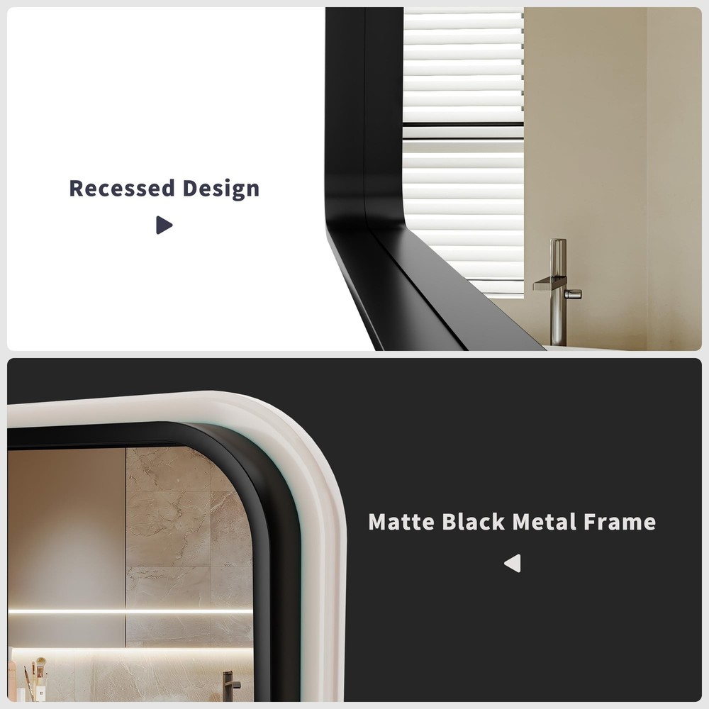 40''×30'' Vanity Mirror with Lights, Black Frame Rounded Corner Rectangle LED Bathroom Mirror, Smart Touch Control 3 Colors Dimmable Lighted Makeup Mirror, Anti-Fog, Modern Wall Mirror Product Details Color: C. Exterior-lit Black-framed Size: 40x30 Brand: Vosuja MPN: MB-Ur-Re-3S-10176-BK UPC: Does not apply EAN: Does not apply Brand: Vosuja Room Type: Cloakroom, Bathroom, Hair Salon, Hallway, Hotel Shape: Rectangular Product Dimensions: 40"L x 30"W Frame Material: Iron Brand: Vosuja Room Type: Cloakroom, Bathroom, Hair Salon, Hallway, Hotel Shape: Rectangular Product Dimensions: 40"L x 30"W Frame Material: Iron Style: Modern Mounting Type: Wall Mount Finish Type: Brushed Surface Recommendation: Glass Special Feature: Waterproof, Round Corner Rectangle, Dimmable Brightness, Anti-fog, 3 Color Temperature Color: C. Exterior-lit Black-framed Theme: Modern Specific Uses For Product: Dressing, Makeup, Home Decor Number of Pieces: 1 Number of Items: 1 Material: Metal Frame Type: Framed Assembly Required: No Frame Color: black Manufacturer: Vosuja Item Weight: 30.1 pounds Item model number: MB-Ur-Re-3S-10176-BK Date First Available: July 5, 2023 Unique Design: This wall mirror stands out with its special LED light strip surrounding the black metal frame. It serves not only as a vanity mirror but also as a decorative ornament, making it an eye-catching addition to any space. This black mirror transcends the ordinary by combining the functionality of a mirror with the aesthetic appeal of an ornament. Modern and Textured: The brushed treatment on the black frame surface gives this rectangular mirror a textured look, adding a touch of sophistication to your decor. The high-quality brushed frame material, along with the floating glass panel, ensures a modern and stylish appearance and enhances the overall ambiance of your space with its sleek design. Multi-functional Mirror: With adjustable 3 lighting tone and brightness dimmable feature, this lighted makeup mirror allows you to customize the lighting according to your needs. The dimmable LED lights provide the perfect ambiance for your makeup routine. It is equipped with anti-fog technology to ensure a clear view even in humid conditions. Furthermore, it offers both hardwired and plug-in wiring options to accommodate different wiring needs. High-Definition Reflection: Experience crystal-clear imaging with this LED bathroom mirror. The high-quality upgraded silver glass used guarantees a real HD reflection. The 4mm thickness of the mirror and the silver nitrate coating eliminate any visual distortion, even when viewed from a distance. Multi-room Use: Our bathroom vanity mirror with lights is carefully packaged in a thick foam box, ensuring that 4030 mirror Passes drop test.The Illuminate mirror can be placed in the cloakroom, makeup vanity for matching aid.