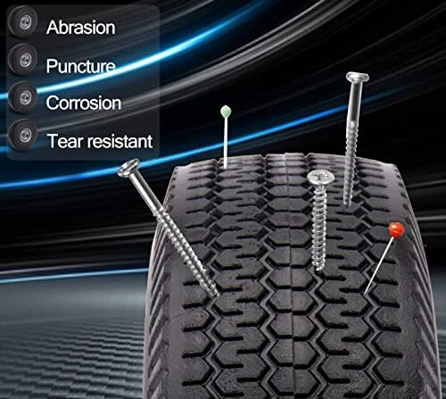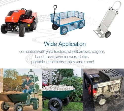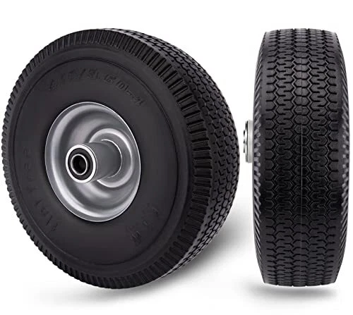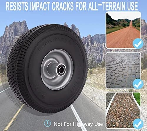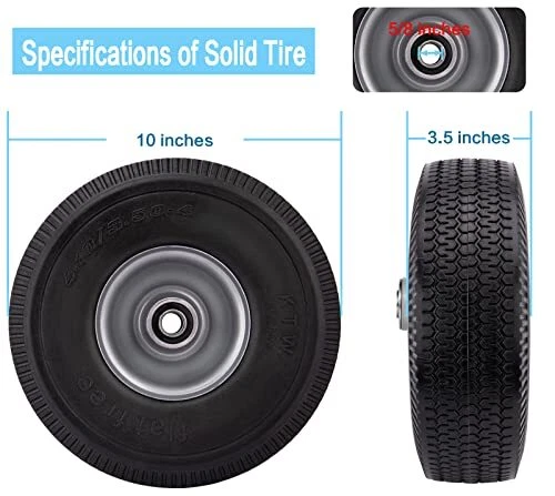 Return Policy Fast Delivery Trusted seller 4.10/3.50-4 Flat Free Tire for Hand Truck/Garden Utility Wagon Cart/Lawn Mower/Generator, 2 Pcs 10" Solid Rubber Tire and Wheel with 5/8" Axle Bore Hole, Offset Hub, and Double-Sealed Ball Bearings Product Description Specifications of 4.10/3.50-4 Flat Free Tire: The outer diameter of the solid PU tire is about 10 inches, the rim diameter is 4 inches, the solid PU run-flat free tubeless tire width is 3.5 inches, and the bearing is 5/8 inches. You will get two 4.10/3.50-4 flat free tire with your order! Please pay attention to check whether your old tire model matches before buying! 10 Inch Flat Free Tubeless Tires Wide Application: Our 4.10/3.50.4 solid tire is used to replace all flat tubeless tires and wheels with 5/8 inch bearing. 10" Solid Rubber Tire Highly compatible with yard tractors, wheelbarrows, wagons, hand trucks, lawn mowers, dollies, portable generators, trolleys,and more! Take The Hassle Out Of Tire Inflation: 10 inch flat free solid tire is the perfect replacement for pneumatic tires. Our 4.10/3.50-4 Solid rubber tires can never go flat. 4.10/3.50-4 tire and wheel can prevent from getting punctured or deflated. Keep you away from the trouble of inflating tires frequently. Solid Rubber Tire Wheels Airless tire wheels save you time and money. T’s no risk of flats, explosive punctures, and pinched inner tubes! Tread Zigzag Design - 10 Inch Hand Truck Wheels: A deep zigzag tread provides better grip, a perfect balance of traction and maneuverability, and a good anti-slip effect. High-quality Materials, Solid Construction: 4.10 3.50-4 hand truck tires are made of high quality polyurethane tires and iron hubs. Rugged construction ensures tires are abrasion, puncture, corrosion, and tear resistant. 4.10/3.50-4 Flat Free Tire Resists impact cracks for all-terrain use. Heavy duty ball bearing and 5/8” axle bore, Scientific structural design and high-quality metal materials greatly increase its bearing capacity. Shipping Returns Payment Shipping Shipping is FREE to all addresses other than APO/PO boxes in the lower 48 states. All our stock ships from US-based warehouses. Shipped via USPS or UPS (depending on location and package weight) Unless stated otherwise, all orders will ship within 24-72 hours of your payment being processed. Check our feedback to see the great reviews of FAST shipping we offer. Returns Seller does not accept returns Payment We currently accept payment via eBay managed payments only. Once payment is cleared, we will dispatch your shipment within 1-3 business days. Please refer to the "Shipping" tab for more information regarding shipping speed to your destination.