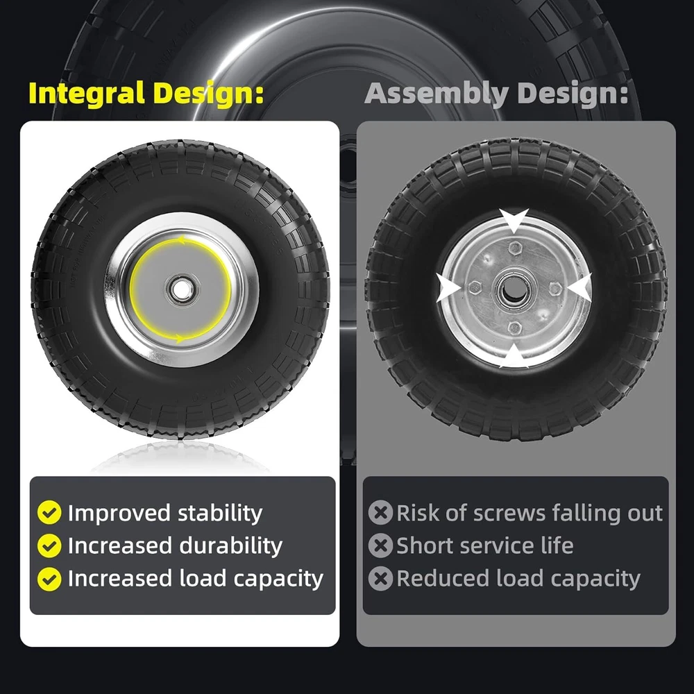 4.10/3.50-4 Tire and Wheel Flat Free, 10 Inch Solid Rubber 101, Black Product Details Size: 101 Brand: Iococee Wheel Size: 10 Inches Pitch Circle Diameter: 10 Inches Item Weight: 1.5 Kilograms Item Diameter: 4 Inches Vehicle Service Type: Mower Load Index: 91 Rim Width: 17 Inches Color: Black Manufacturer: Well1314 Model: 4.10/3.50-4 Tire and Wheel Flat Free Item Weight: 3.29 pounds Item model number: 4.10/3.50-4 Tire Manufacturer Part Number: 4.10/3.50-4 Construction: Cast Speed Rating: l Bolt Pattern (Number of Holes): 4 Offset: 2 Inches Size: 101 Brand: Iococee Wheel Size: 10 Inches Pitch Circle Diameter: 10 Inches Item Weight: 1.5 Kilograms Item Diameter: 4 Inches Vehicle Service Type: Mower Load Index: 91 Rim Width: 17 Inches Exterior FinishMaterial: SilverRubber Wheel BackspacingRim Size: 10 Inches3.5 Inches Say Goodbye To Flat Tires: Dolly Tires 4.10 3.50-4 Flat Free 4 pack,made of high-quality urethane tires and iron hub. The flat free tire can prevent from getting punctured or deflated. Keep you away from the trouble of inflating tires frequently. Please pay attention to check if your old tire model number matches before buying. (note:suitable for dynamic loads, but not for static loads). Widely Applicable: The 10 inch wheels are the most common size of tires used for home. Perfect replacement for your wheelbarrow wheel, hand truck tires, dolly tires, wagon tires, handtruck tires,dolly cart wheels, garden cart tires. Scientific Design: Staggered serrated tread design and heavy duty double sealed ball bearings with 5/8” axle bore,scientific structural design and high-quality metal materials greatly increase its bearing capacity, which makes our wheelbarrow tires good at the grip, drainage, slip-resistant, and shock-absorbing. Provides superior maneuverability and ground clearance for your cart. You can easily use it to complete your work. Flat Tire Solution Expert: We are a tire manufacturer with thirty years of experience. After years of tests, we finally add polyurethane material to enhance the durability of the solid rubber tire, completely preventing the falt tire of the free wheel barrow. The upgraded tires are about 1 pound heavier than the ordinary ones. Although this has increased our costs, but it is recognized by our customers. After Sales: Don’t spend hundreds of dollars to buy one new cart ,high-quality 410/350 x 4 tire save you time and money, any reason you are not completely satisfied, you can ask for replacement. Dear friends, use your brain and hands to diy work!