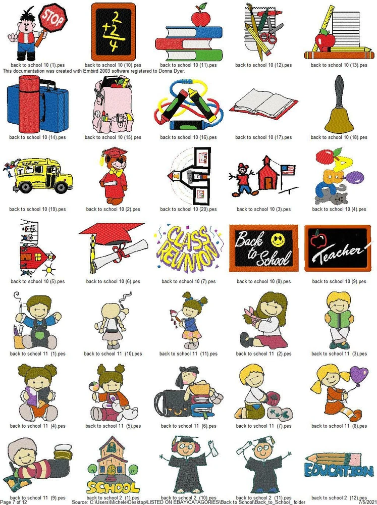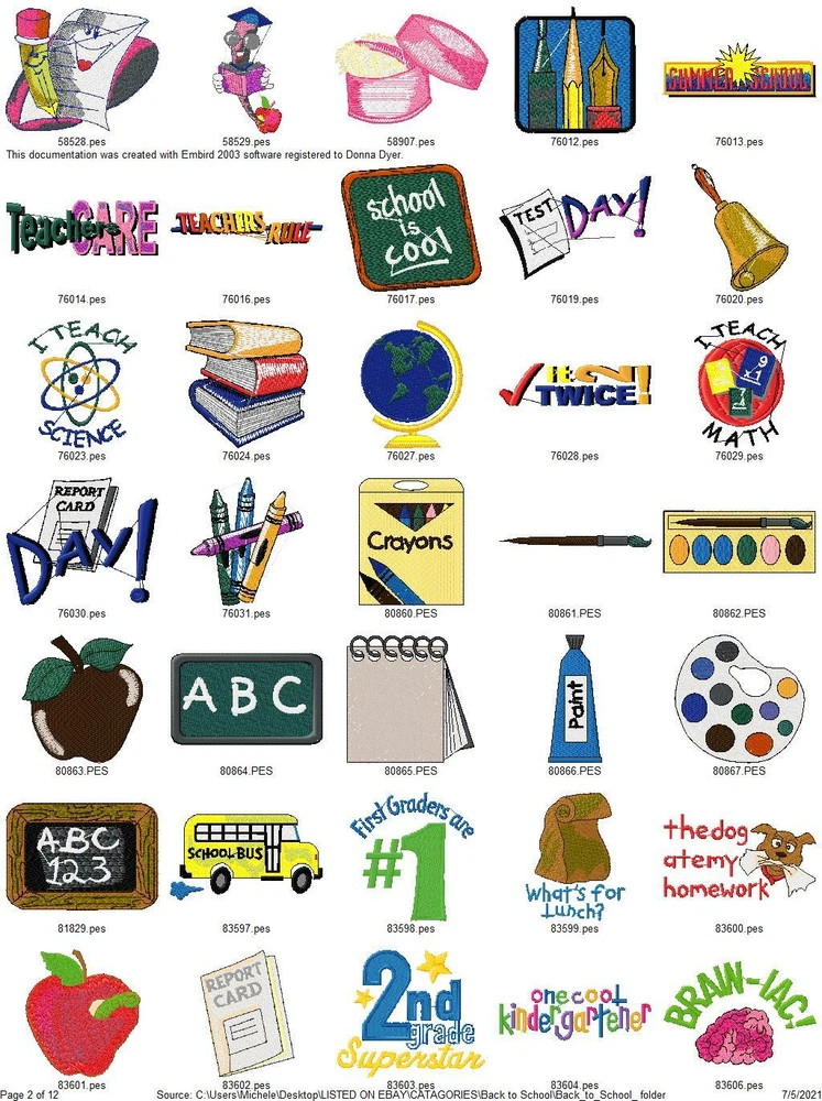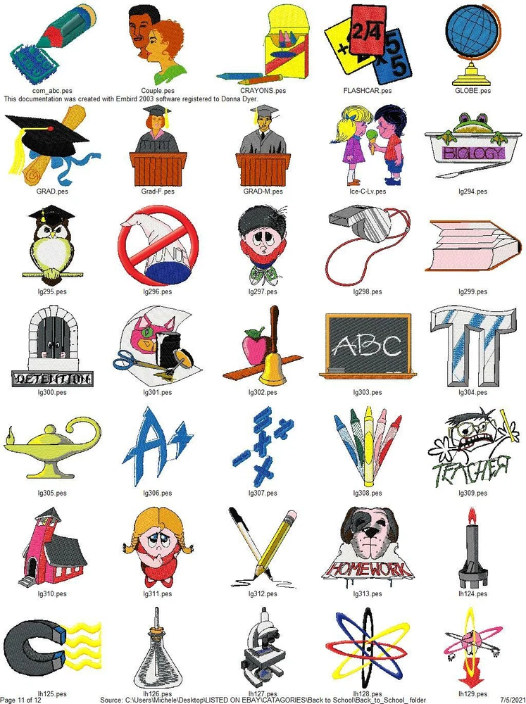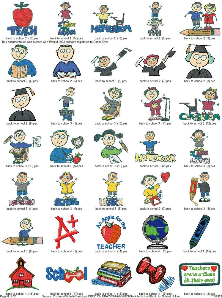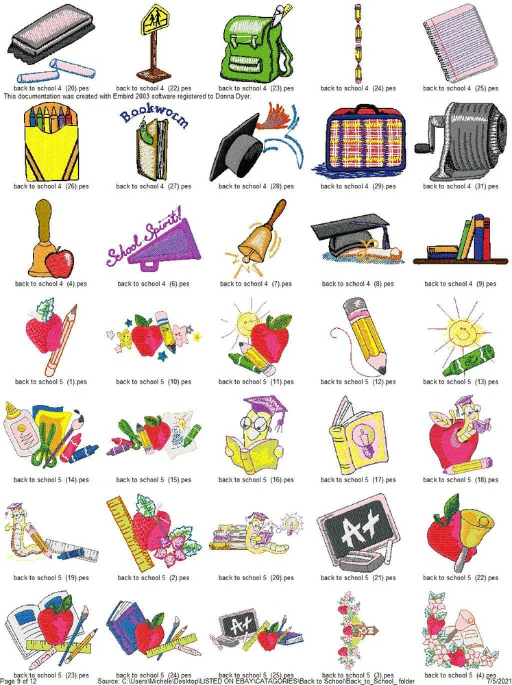 ASK ME ABOUT HUGE DISCOUNTS ON MULTIPLE ORDERS READ ENTIRE DESCRIPTION IMPORTANT INFORMATION ABOUT YOUR PURCHASE: THESE ARE EMBROIDERY DESIGNS NOT PATCHES. THESE WILL BE SENT TO YOU ON A USB THUMBDRIVE I HAVE ANOTHER LISTING FOR A DOWNLOAD YOU WILL RECIEVE RIGHT AWAY WITH FREE SHIPPING IF YOU PREFER TO GET THEM THAT WAY, I ALSO COMBINE ORDERS FOR ONE LOW PRICE $5 TOTAL SHIPPING THIS LISTING IS FOR 415 BACK TO SCHOOL COLLECTION EMBROIDERY MACHINE DESIGNS AS SHOWN IN PICTURES PLUS MANY MORE THEY ARE IN PES FORMAT VARIOUS SIZES MOST ARE 4X4 OR 5X7. YOU WILL RECIEVE DETAILS PAGE WITH EACH DESIGN WITH COLOR CHART STITCH COUNT ECT. ALSO AVAILABLE IN DST HUS JEF EXP AND VIP FORMATS PLEASE LET ME KNOW WHAT FORMAT YOU WANT AT TIME OF PURCHASE DESIGNS ARE CREATED ON A WINDOWS BASED COMPUTER I CAN NOT GUARANTEE THEY WILL WORK WITH A MAC I'VE HAD SOME BUYERS HAVE NO PROBLEM BUT OTHERS HAVE NOT BEEN ABLE TO ACCESS THEM. I AM NOT FAMILIAR ENOUGH WITH MAC COMPUTERS TO BE OF MUCH HELP SO MAC USERS BUY AT YOUR OWN RISK. IF YOU HAVE ANY PROBLEMS WITH YOUR DESIGN OR DOWNLOADING THE FILES, ANY ISSUES WHATSOEVER. PLEASE CONTACT ME FIRST. I AM ALLWAYS HAPPY TO HELP YOU WORK OUT ANY ISSUES THAT MIGHT ARISE. IF IT CANNOT BE FIXED I AM HAPPY TO REFUND YOUR PAYMENT, IF YOU FILE A REQUEST WITH EBAY FOR A REFUND I WILL NOT RESEND THE LINKS OR UPDATED FILES OR BE ABLE TO RESOLVE ANY ISSUES. BE SURE TO CHECK OUT MY OTHER LISTINGS DONT SEE WHAT YOU WANT? LET ME KNOW WHAT YOUR LOOKING FOR CHANCES ARE I HAVE IT AND WOULD BE HAPPY TO LIST IT FOR YOU. THANKS FOR LOOKING