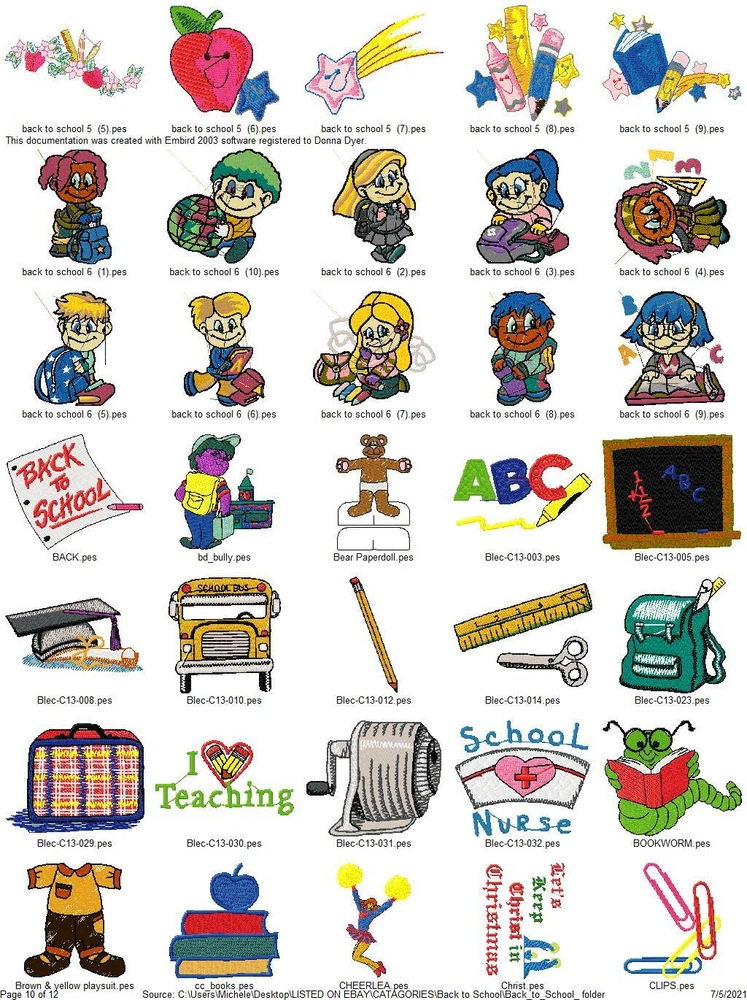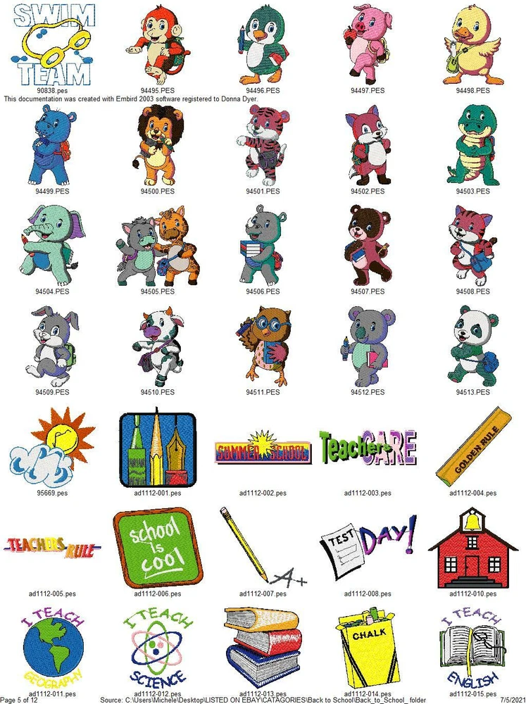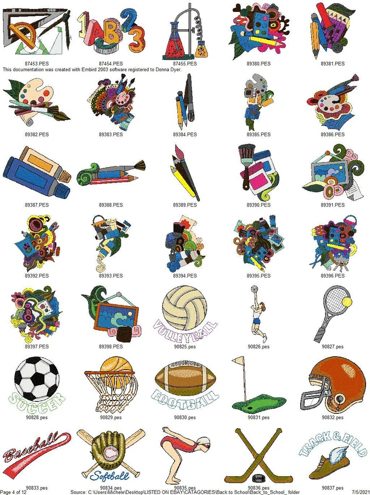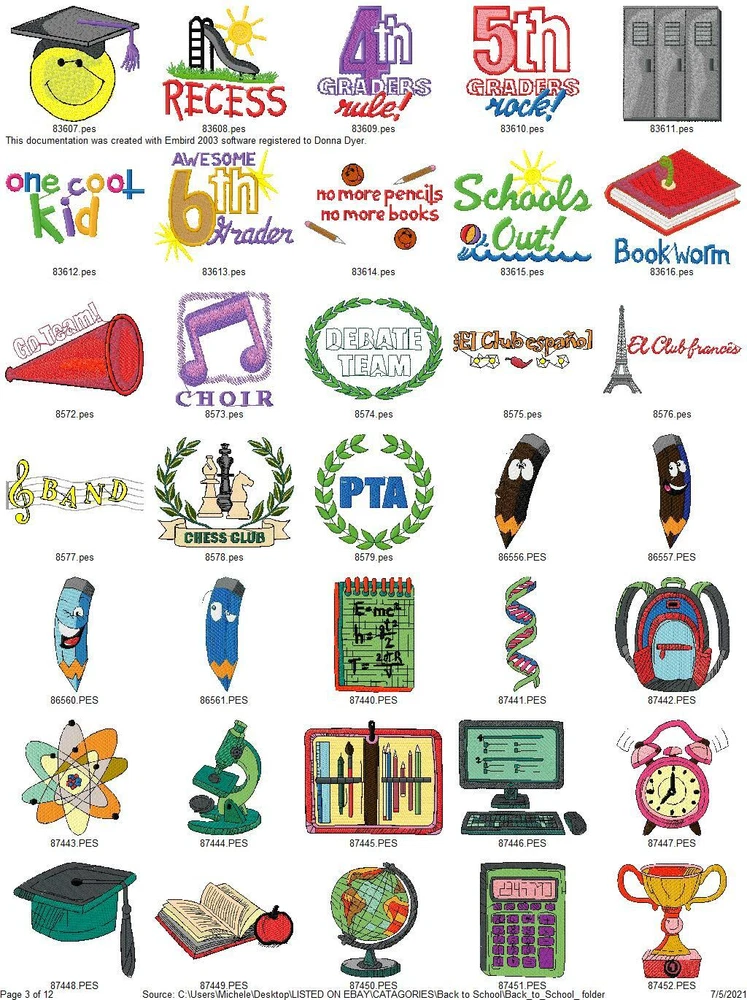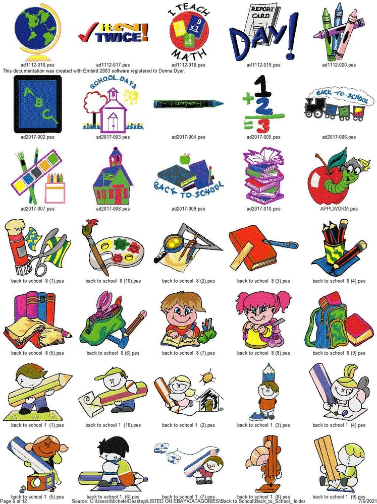 ASK ME ABOUT HUGE DISCOUNTS ON MULTIPLE ORDERS READ ENTIRE DESCRIPTION IMPORTANT INFORMATION ABOUT YOUR PURCHASE: THESE ARE EMBROIDERY DESIGNS NOT PATCHES. THESE WILL BE SENT TO YOU ON A USB THUMBDRIVE I HAVE ANOTHER LISTING FOR A DOWNLOAD YOU WILL RECIEVE RIGHT AWAY WITH FREE SHIPPING IF YOU PREFER TO GET THEM THAT WAY, I ALSO COMBINE ORDERS FOR ONE LOW PRICE $5 TOTAL SHIPPING THIS LISTING IS FOR 415 BACK TO SCHOOL COLLECTION EMBROIDERY MACHINE DESIGNS AS SHOWN IN PICTURES PLUS MANY MORE THEY ARE IN PES FORMAT VARIOUS SIZES MOST ARE 4X4 OR 5X7. YOU WILL RECIEVE DETAILS PAGE WITH EACH DESIGN WITH COLOR CHART STITCH COUNT ECT. ALSO AVAILABLE IN DST HUS JEF EXP AND VIP FORMATS PLEASE LET ME KNOW WHAT FORMAT YOU WANT AT TIME OF PURCHASE DESIGNS ARE CREATED ON A WINDOWS BASED COMPUTER I CAN NOT GUARANTEE THEY WILL WORK WITH A MAC I'VE HAD SOME BUYERS HAVE NO PROBLEM BUT OTHERS HAVE NOT BEEN ABLE TO ACCESS THEM. I AM NOT FAMILIAR ENOUGH WITH MAC COMPUTERS TO BE OF MUCH HELP SO MAC USERS BUY AT YOUR OWN RISK. IF YOU HAVE ANY PROBLEMS WITH YOUR DESIGN OR DOWNLOADING THE FILES, ANY ISSUES WHATSOEVER. PLEASE CONTACT ME FIRST. I AM ALLWAYS HAPPY TO HELP YOU WORK OUT ANY ISSUES THAT MIGHT ARISE. IF IT CANNOT BE FIXED I AM HAPPY TO REFUND YOUR PAYMENT, IF YOU FILE A REQUEST WITH EBAY FOR A REFUND I WILL NOT RESEND THE LINKS OR UPDATED FILES OR BE ABLE TO RESOLVE ANY ISSUES. BE SURE TO CHECK OUT MY OTHER LISTINGS DONT SEE WHAT YOU WANT? LET ME KNOW WHAT YOUR LOOKING FOR CHANCES ARE I HAVE IT AND WOULD BE HAPPY TO LIST IT FOR YOU. THANKS FOR LOOKING