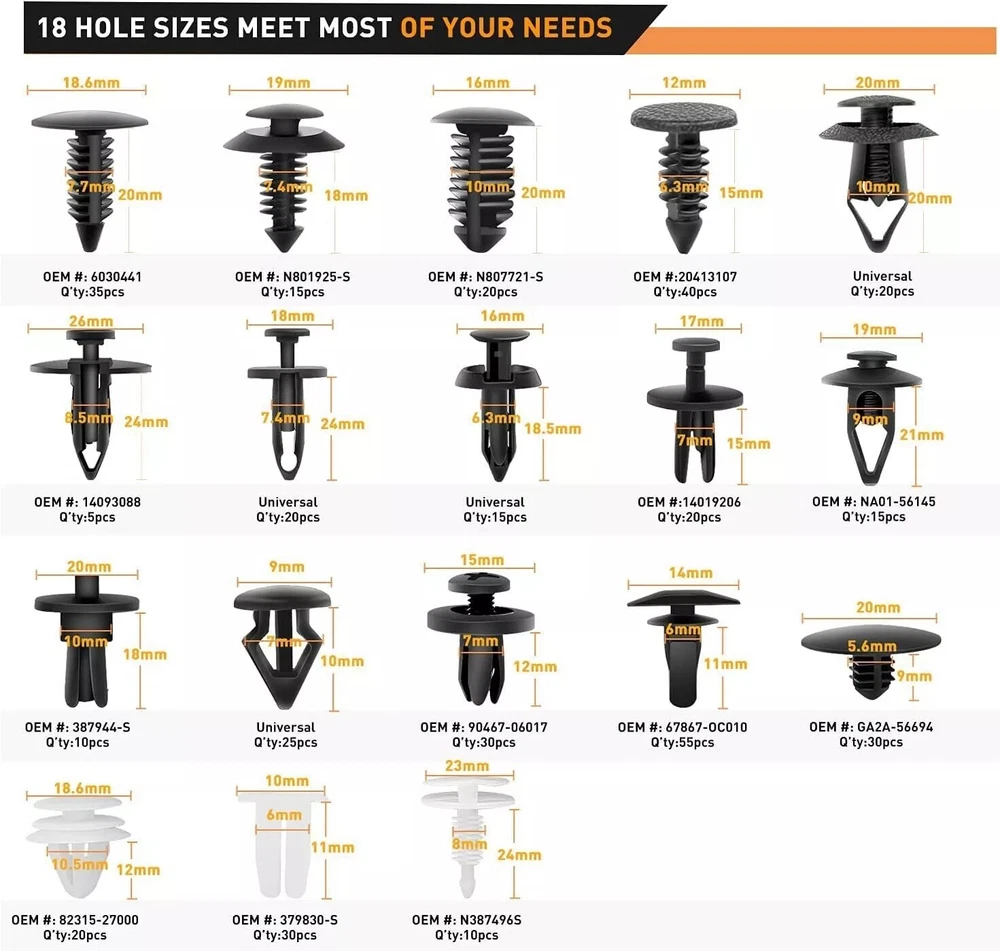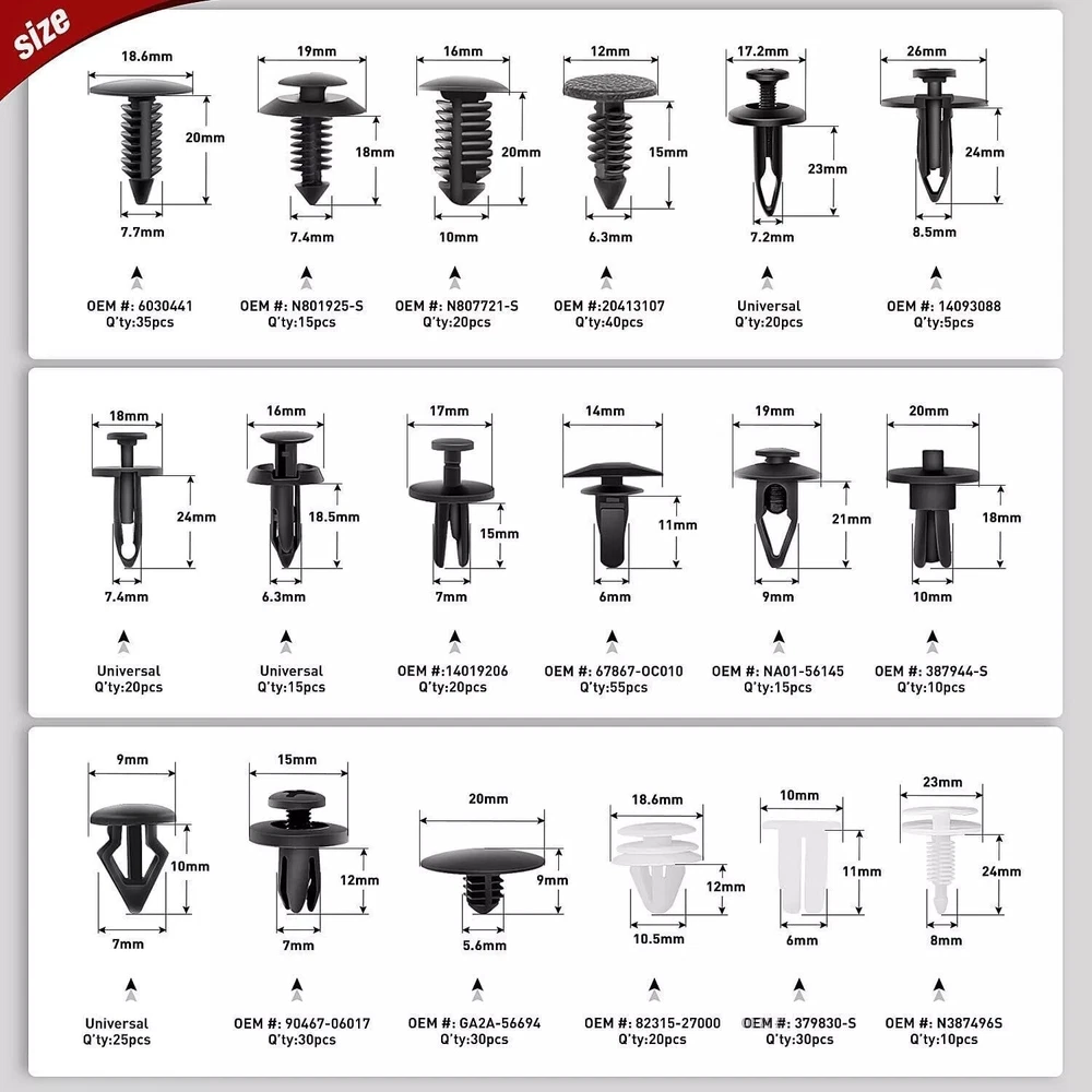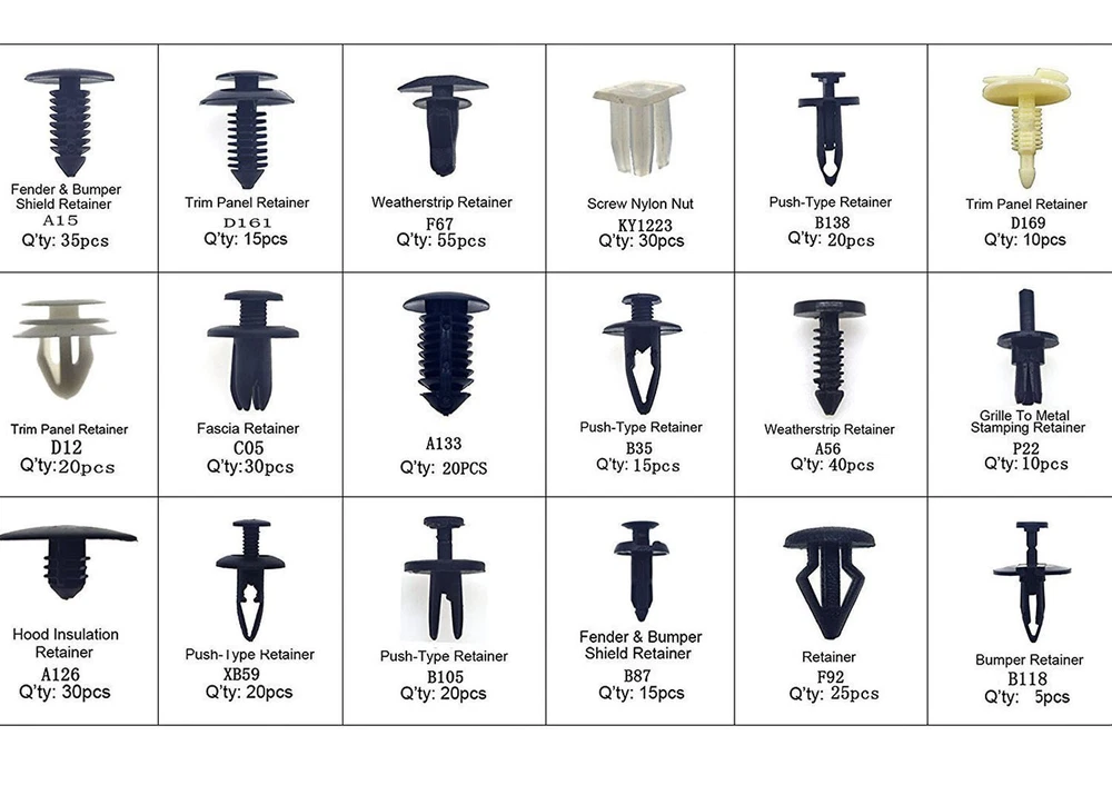 Rivet quantity: 415pcs plastic Rivet Push Pin - A15 x Fender & Bumper Shield Retainer (35pcs) - D161 x Trim Panel Retainer (15pcs) - F67 x Weatherstrip Retainer (55pcs) - KY1223 x Screw Nylon Nut (30pcs) - B138 x Push Type Retainer (20pcs) - D169 x Trim Panel Retainer (10pcs) - D12 x Trim Panel Retainer (20pcs) - C05 x Fascia Retainer (30pcs) - A133 x Retainer (20pcs) - B35 x Push Type Retainer (15pcs) - A56 x Weatherstrip Retainer (40pcs) - P22 x Grille To Metal Stamping Retainer(10pcs) - A126 x Hood Insulation Retainer (30pcs) - XB59 x Push Type Retainer (20pcs) - B105 Push-Type Retainer(20pcs) - B87 x Fender & Bumper Shield Retainer (15pcs) - F92 x Retainer (25pcs) - B118 x Bumper Retainer (5pcs) 415Pcs Car Retainer Clips Auto Fasteners Push Trim Clips Pin Rivet Bumper Kit Description: Features: 1. These rivet fasteners are made of nylon material, suitable for car use. 2. Cars good accessory, commonly used for fitting side skirts, bumpers and other trim. 3. Replaces Factory Push Pin Rivets On Many Brands Of Vehicles Such As for Volvo, BMW, GM, Ford, Toyota, Honda, Nissan, Mazda, Chrysler, Volkswagen, Mercedes Benz And Audi. 4. With a plastic box for easy storage Specifications: Material: plastic Color: Black Other Part: Screw Fender Body Door Trim Panel Hood Interchange Part: Under Engine Splash Guard Rivet Fastener Clips Manufacturer Part: Plastic Push-Type Bumper Retainer Clip Rivet quantity: 415pcs plastic Rivet Push Pin - A15 x Fender & Bumper Shield Retainer (35pcs) - D161 x Trim Panel Retainer (15pcs) - F67 x Weatherstrip Retainer (55pcs) - KY1223 x Screw Nylon Nut (30pcs) - B138 x Push Type Retainer (20pcs) - D169 x Trim Panel Retainer (10pcs) - D12 x Trim Panel Retainer (20pcs) - C05 x Fascia Retainer (30pcs) - A133 x Retainer (20pcs) - B35 x Push Type Retainer (15pcs) - A56 x Weatherstrip Retainer (40pcs) - P22 x Grille To Metal Stamping Retainer(10pcs) - A126 x Hood Insulation Retainer (30pcs) - XB59 x Push Type Retainer (20pcs) - B105 Push-Type Retainer(20pcs) - B87 x Fender & Bumper Shield Retainer (15pcs) - F92 x Retainer (25pcs) - B118 x Bumper Retainer (5pcs) Total: 415 x Rivets 1 x Steel Screwdriver Remarks: There may be slight size deviations due to manual measurement, different measuring methods and tools. The picture may not reflect the actual color of the item because of different photographing light, angle and display monitor. Payment Delivery details Terms of sales About us Contact us Payment We accept major credit card payments via Paypal. Payment must be received within 7 days of auction closing date. If you do not contact us or respond to our email within 7 days of auction closing date, we do not guarantee the item availability. We reserve the right to cancel any unwanted bids. Delivery details Flat rate shipping charge will be applied to the 48 continental USA States. Extra shipping fee will be charged to ship item(s) to HI, AK, PR, GU, VI, APO, FPO . Item(s) will be shipped via UPS Ground or USPS or Fedex within 3 Business days after payment is received. A Tracking Number will be upload on platform as soon as item(s) is shipped. International buyers please note, we are not responsible for any custom duties, taxes and brokerage fees. For some oversize packages, we may not be able to ship via USPS. Terms of sales All of our items are professionally made and guaranteed to fit. A professional installation is always recommended. Please send a message over eBay if you have any questions. We accept returns within 30 or 60 days after you received the item(s). All returned items must be new and in original package. The buyer will pay return shipping fees. No refund will be made for damaged parts. Shipping and handling fees and insurance fee are not refundable. About us Our warehouses are located in CA and NJ The transportation time is approximately 3-5 working days Contact us Your satisfaction is our top priority. We stand behind all products that we sell. If you have a problem with any of our listings, please allow us to work it out. Our business times are Monday-Friday 9:00- 5:00 Pacific Time. Office closes on weekends and holidays. We are striving to earn a 5- star rating with every purchase. Please take a moment to leave us a positive feedback when you receive your order. If you are not satisfied, please let us know before you leaving feedback. Please always include your purchase eBay item number in the mail whenever you have any questions.