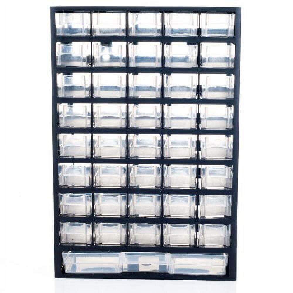 Product details Features Get your work area organized with this handy 41 compartment storage unit 40 small compartments and one oversized compartment for added convenience Perfect for screws, washers, nuts, bolts, and other small hardware Also great for craft supplies Specifications Small Compartment Dimensions1.32" H x 2" W x 4.5" L Large Compartment Dimension: 1.32" H x 10.5" W x 4.5" L Dimension: 17.5" H x 11.75" W x 5.25" L Weight: 5.85 lbs PLASTIC STORAGE DRAWERS - The Stalwart 41-drawer parts organizer is the perfect way to store everything from hardware, fishing tackle, office supplies, or toy building blocks, to beads, makeup, or jewelry. SMART DESIGN - The mix of compartment sizes is ideal for organizing a variety of items. Each unit features 40 small bins and 1 oversized bottom drawer. The clear material allows you to see the contents, and they have easy-open finger pulls. STRONG CONSTRUCTION - The plastic drawers organizer is constructed from impact-resistant material that is difficult to damage or break. Whether you use the craft storage cabinet in your workshop or a kids playroom, it is built to last. SECURE STORAGE - The plastic storage bins with drawers can be placed on any work surface. Use them in your craft room, garage workshop, kids playroom, or even in the classroom to securely store art supplies, nuts and bolts, or any other small goods. PRODUCT DETAILS - Material: Plastic. Dimensions: (L) 11.75" x (W) 5.25" x (H) 17.5"; Large Bottom Drawer: (L) 10.5" x (W) 4.5" x (H) 1.325"; Small Drawers: (L) 2" x (W) 4.5" x (H) 1.325". Color: Black. On Dec 17, 2023 at 21:46:17 PST, seller added the following information: On Jul 15, 2025 at 01:50:48 PDT, seller added the following information: On Jul 15, 2025 at 02:39:57 PDT, seller added the following information: